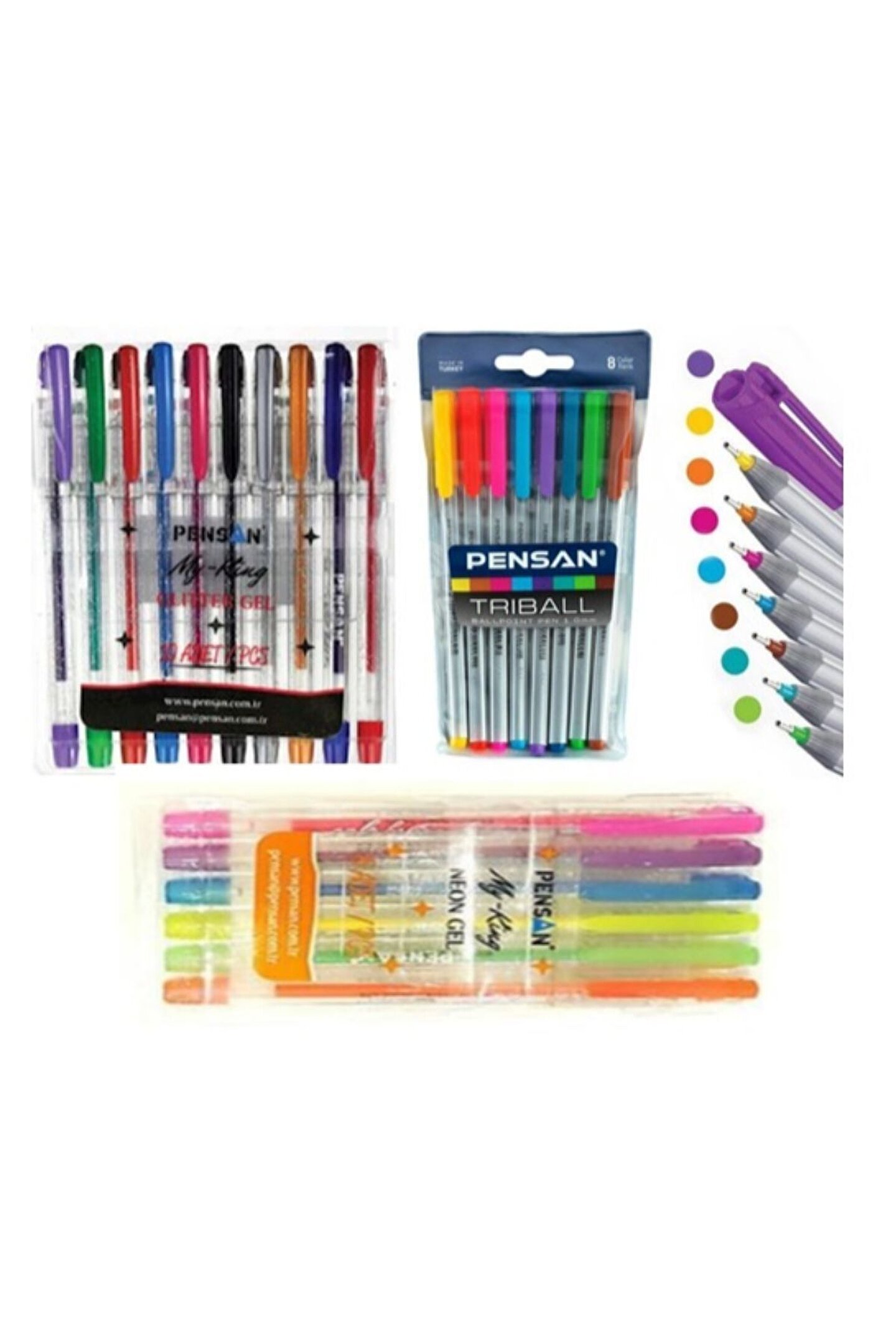paket içerisinde 8 renli pensan tükenmez kalem seti; 6 renkli pensan neon renkli jel kalem seti; 10 renkli pensan simli tükenmez kalem seti bulunmaktadır;