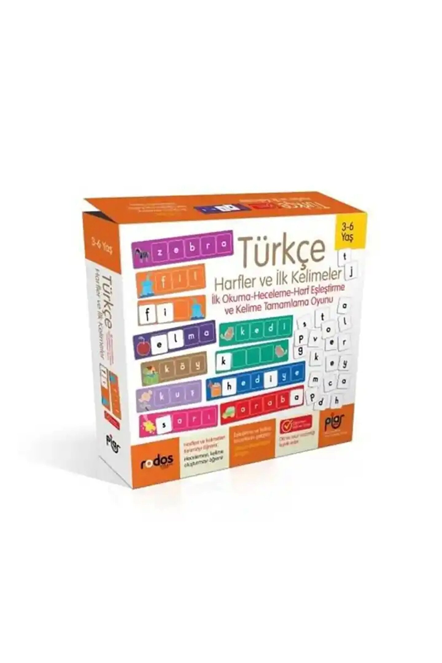 Türkçe ilk okuma-Heceleme ve harf eşleştirme oyunu, harfleri tanımayı, kelime oluturmayı öğretir. Üç harfli kelimelerden, dört-Beş ve altı harfli kelimelereKadar Resim ve kelimelerin eşleştirilmesiniDestekler. Ayrıca bu oyunla farklı kelimeler oluturabilir ve farklı kelimeler üretebilirsiniz. Oyunun içeriği ile 2 farklı oyun oynanabilir. Oyunlar nasıl oynanır? Oyun 1:OyÜçlar bir kelimeyi oluturmak için kartlarda gösterilen resme uygun olan harfleri bir araya getirirler. Doğru sıralamayı yaparak eşleştirmeyi tamamlarlar. Bu, harf şekillerini ve seslerini çocuklara tanıtmanın mükemmel bir yoluur. Çocuklar harf seslerine ve şekillerine aşina oldukça, kelimeleri yüksek sesle okumaya geçerler. Aynı zamanda ebeveynleriyle birlikte farklı kelimeler türeterek oyuna zenginlik katılmış olu. Oyun 2:Oyunun ikinci seviyesi ise biraz daha zorluur. OyÜçlar kelime kartlarının boş tarafını kullanarak, gösterilen resmin kelimesini oluturmak için harfleri doğru bir şekilde sıralarlar. Bu oyun, çocuklara ilk kelimelerini tanıtmak, hecelemeyi teşvik ederek okumayı ve yazmayı öğretmek amacıyla tasarlanmıştır. Bu set ile, çocuklara ilk okuma heyecanını yaşatırken aynı zamanda onların hafıza becerilerinin, gözlem Becerilerinin gelişimine de katkı sağlamış olacaksınız. Içerik: Kutu ölçüsü:257x223mm ; 9 adet kelime kartı (çift taraflı 18 kart) ; 3-4-5 ve 6 adet kelime kartı (yazılı ve yazısız yüzeyler) ; 81 harf kartı ; Özel kesimli ; 3-6 yaş ; Öğretmen test ve onaylı ; Dayanıklı ve lüks kalitede malzemelerden üretilmiştir ; Yerli üretim ; Ürünlerimiz çocuklar için zararlı olmayan gıda boyası ile üretilmiştir.