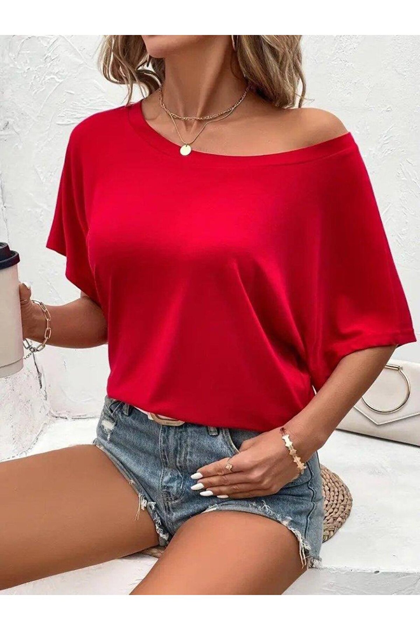 POLEXP Kadın Tek Omuzu Açık Kısa Kollu Salaş Viskon Bluz