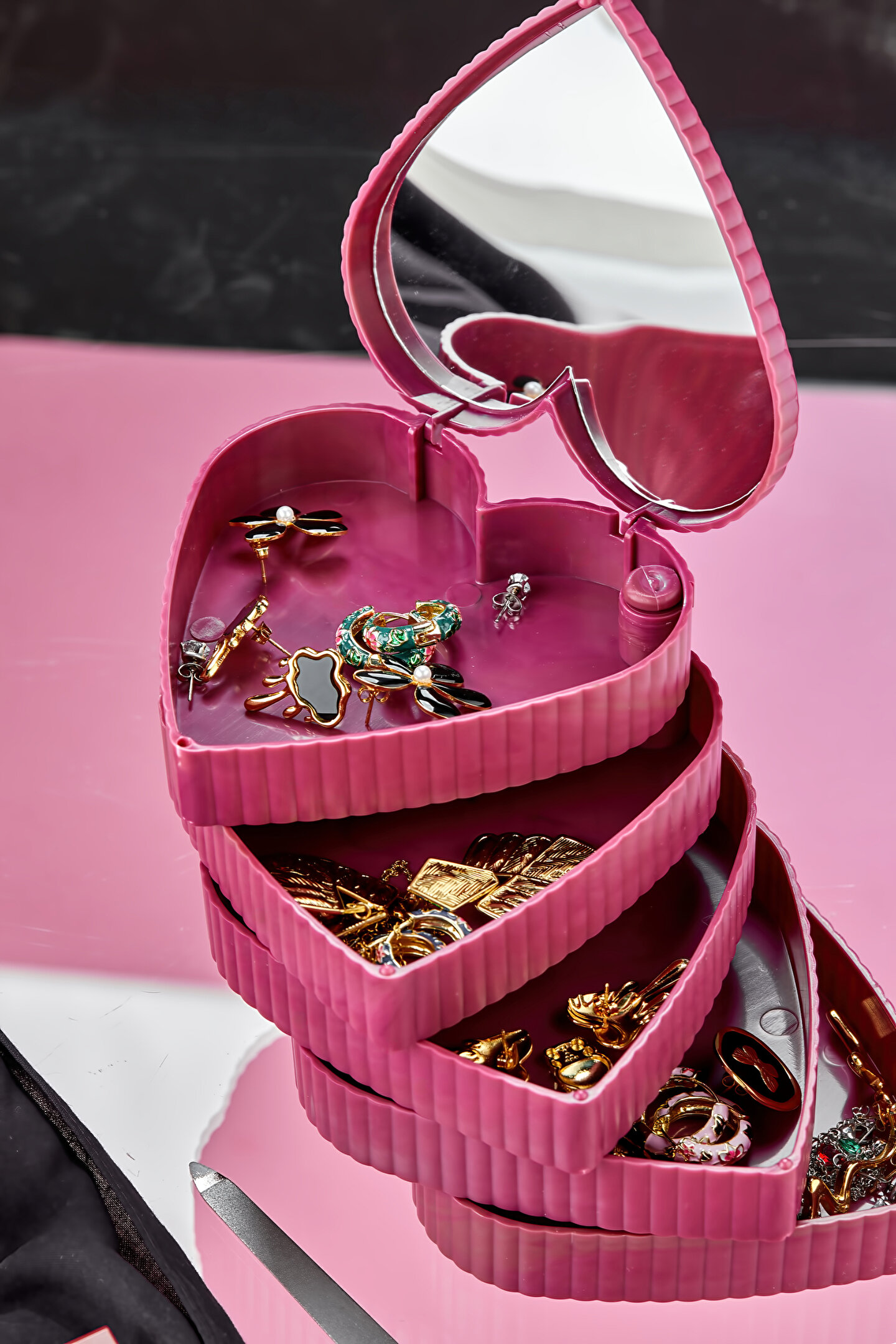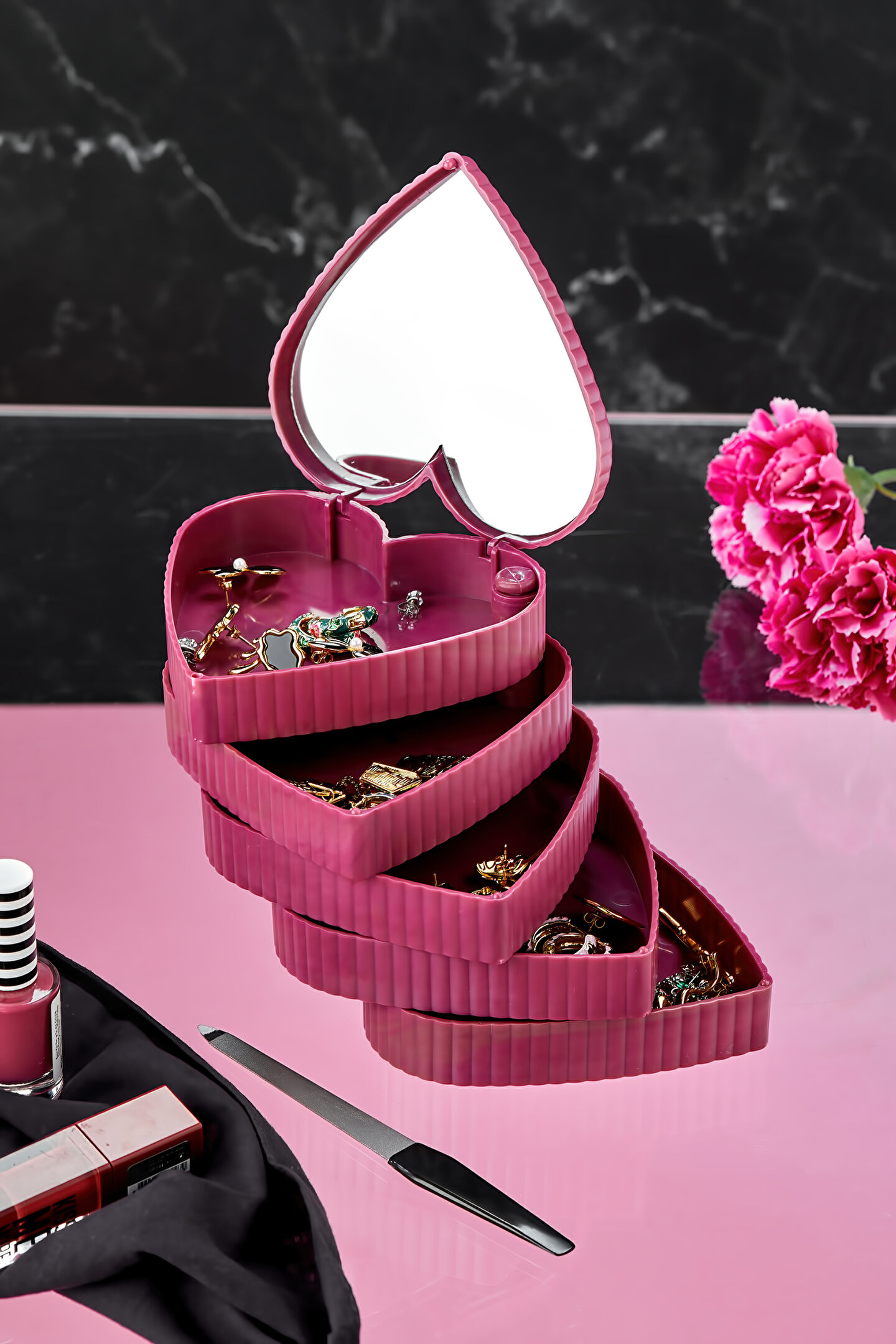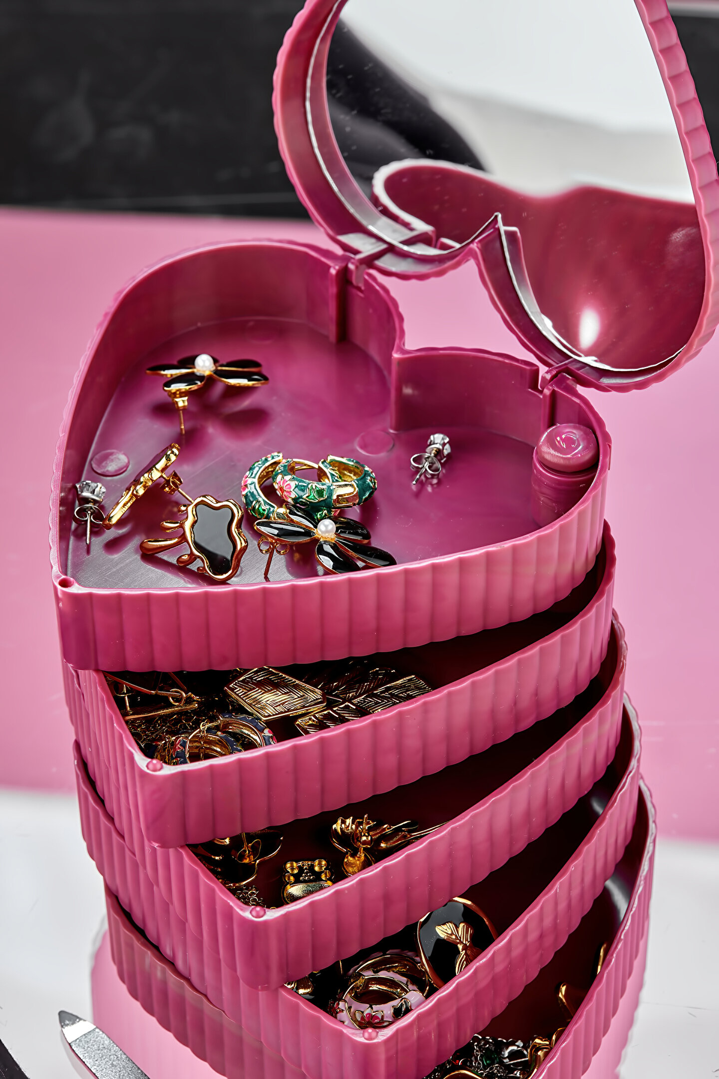 5 Katlı Aynalı Kalp 360 Derece Dönebilen Takı Organizer Kutusu Seyahat tipi taşınabilir aynalı organizer. ; Makyaj Aynalı ; Size pratik ve güvenli bir depolama alanı sunar. ; Boyutu sayesinde hem çok yer kaplamaz hem de şık bir dekorasyon eşyası olarak kullanılabilir. ; 360 derece dönebilen 4 katlı pratik bir üründür. ; Yüzük, küpe, saat, toka vb eşyalarınızı saklamak için ideal bir üründür. ; Takılarınız tozdan kirden uzak durur. ; Takılarını daha iyi muhafaza etmenizi sağlar. ; Ürün Ölçüleri: ; 11cm x 11cm x 12,4cm ; ok