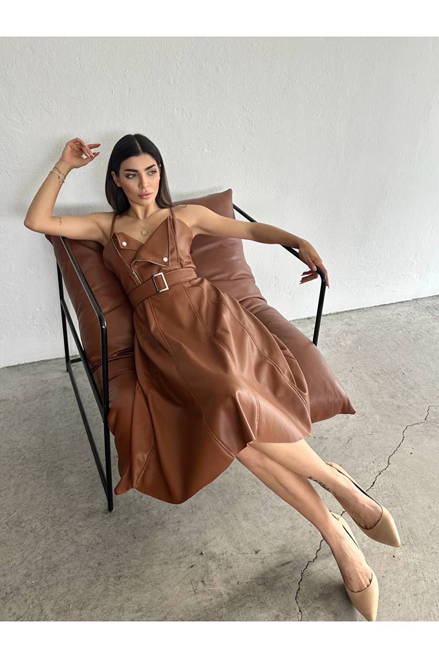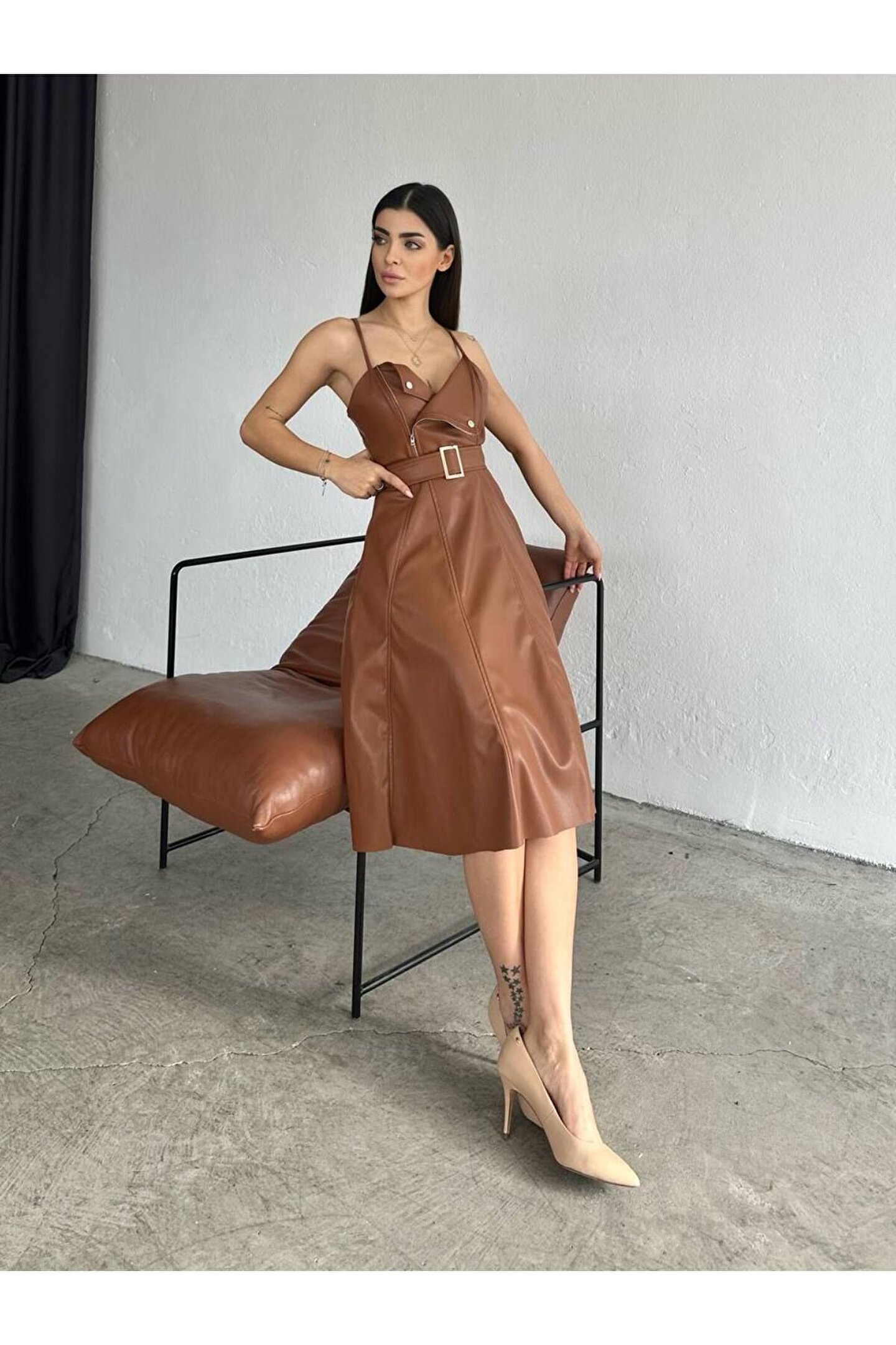 Askılı tasarımı ile modern ve şık bir görünüm sunar.; Suni deriden üretilmiş olup, dayanıklı ve kaliteli bir yapıya sahiptir.; Bele oturan kalıbıyla vücut hatlarını zarifçe sarar.; Her yaştan kadının rahatlıkla tercih edebileceği düz kesimiyle zamansız bir stil oluşturur.; Midi boyu ile hem günlük kullanım hem de özel davetlerde idealdir.;