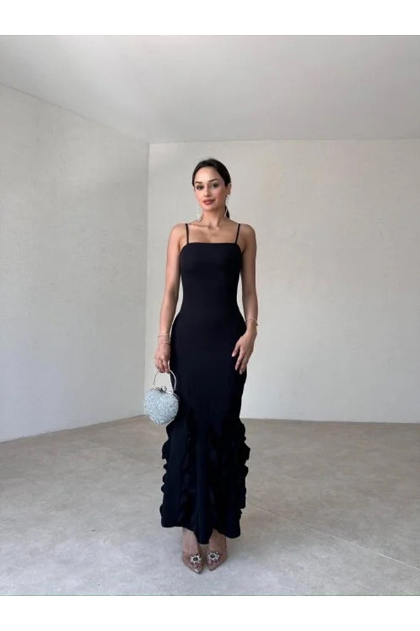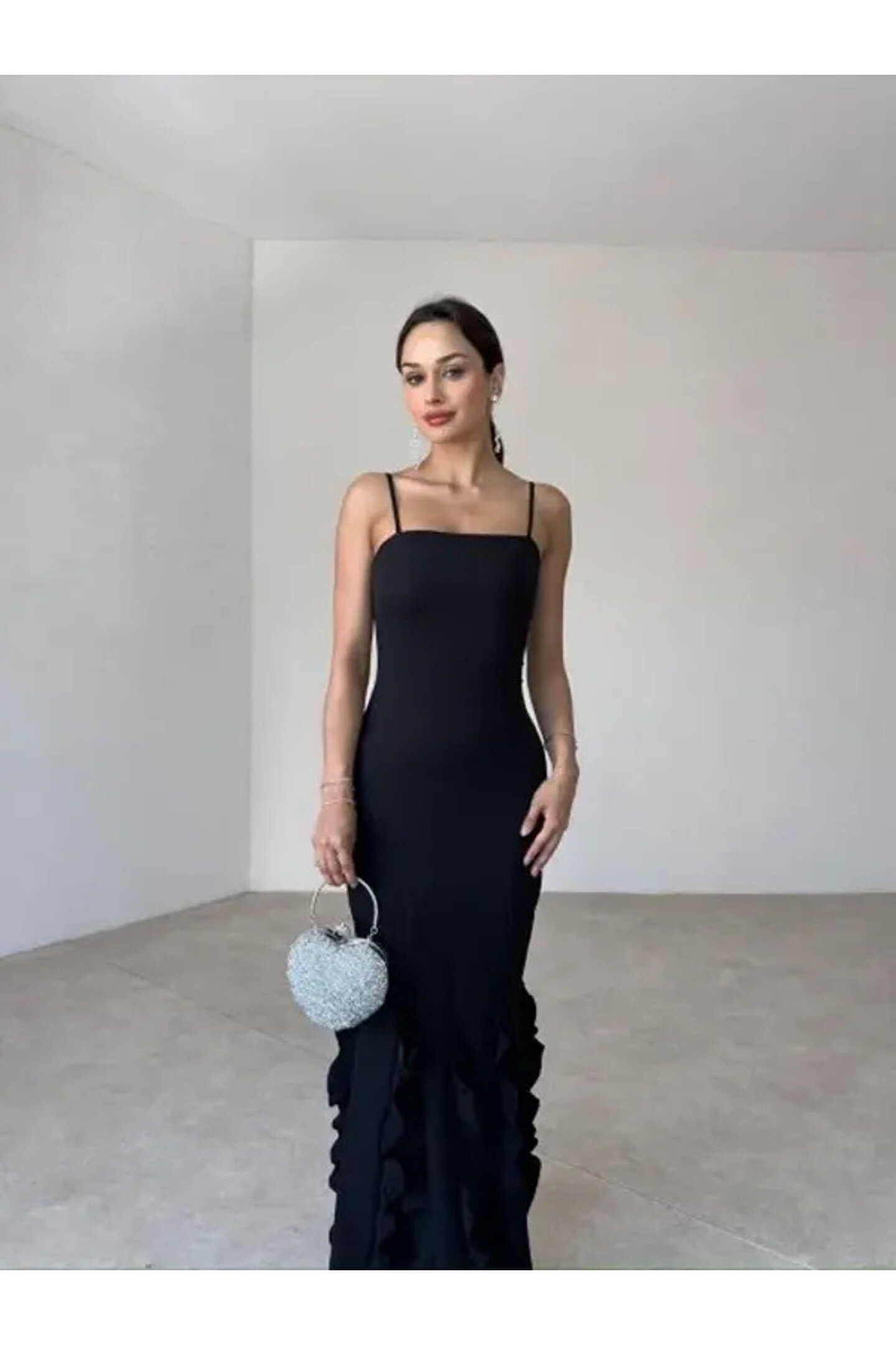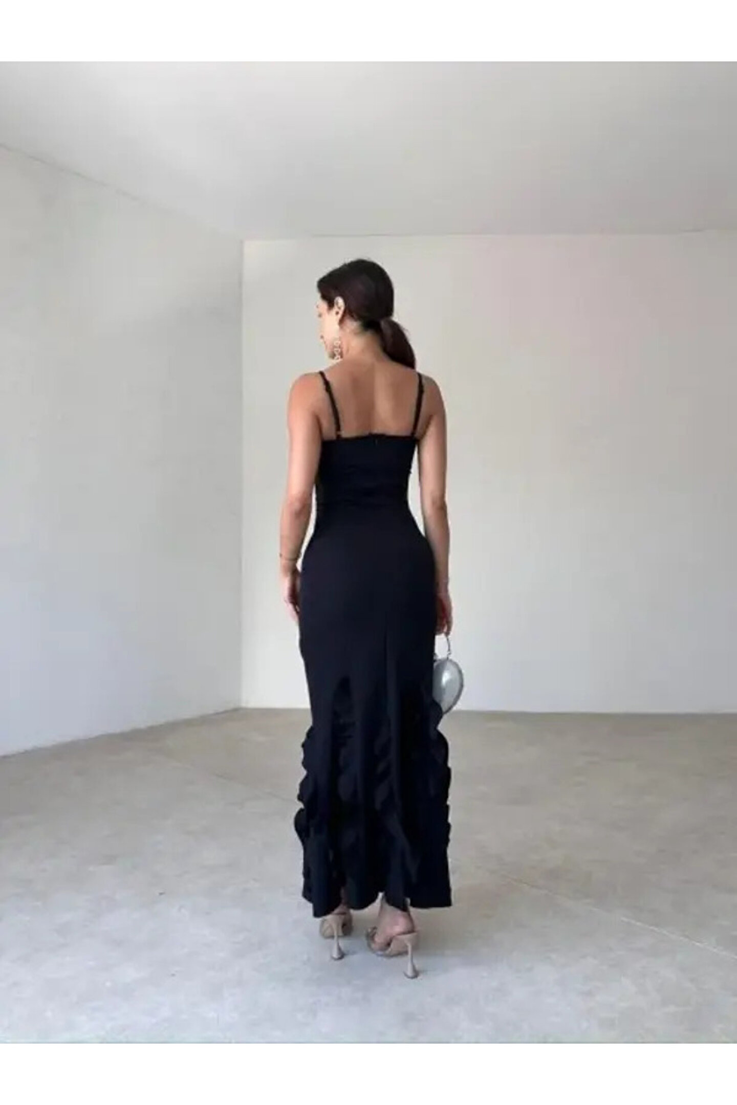 popibutik Askılı Fırfır Detay Atlas Kumaş Siyah Uzun Elbise