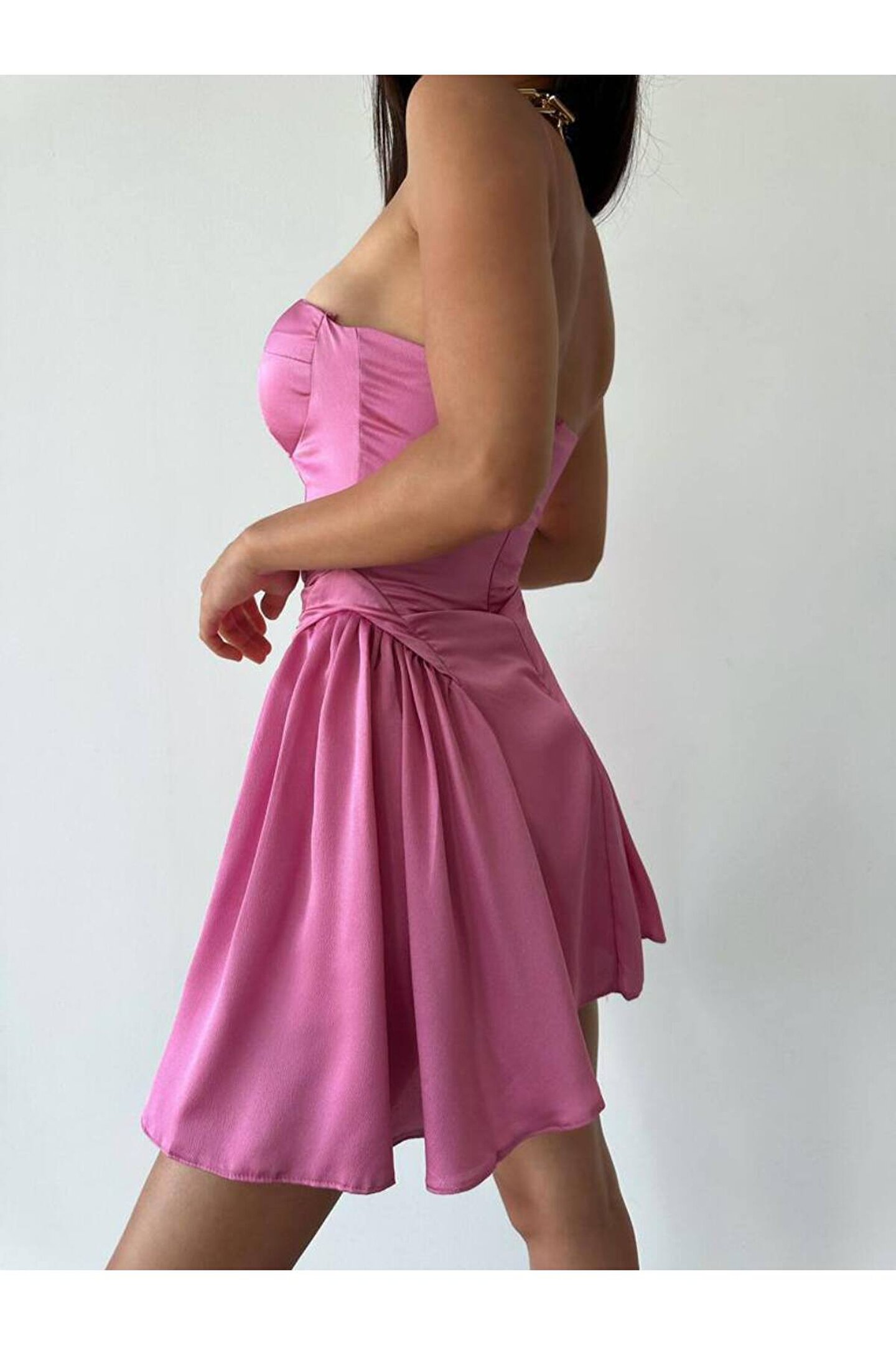 popibutik Askılı Mini Pembe Saten Elbise