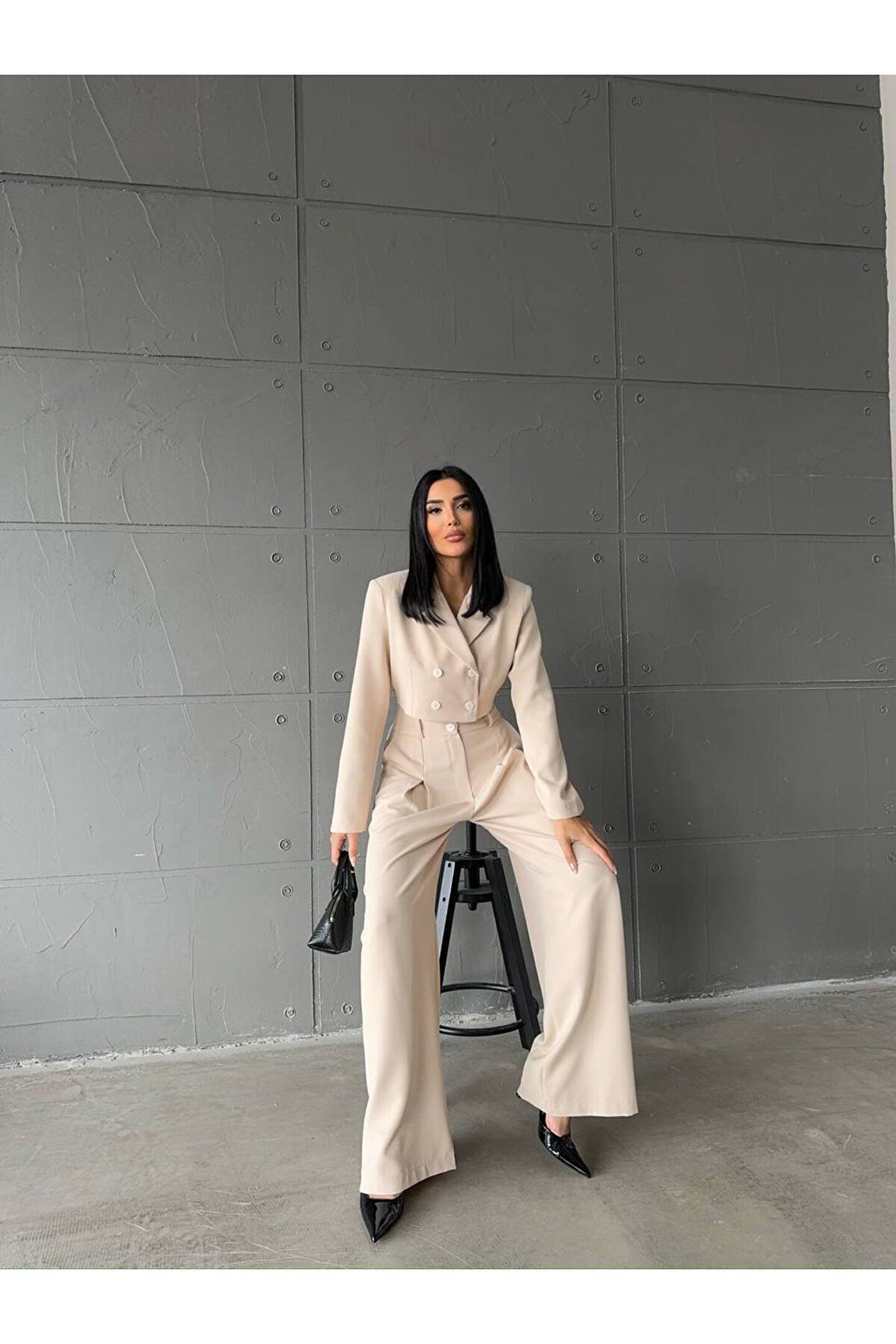 popibutik Atlas Kumaş Yüksel Bel İspanyol Paça Pantolon Ceket Bej Takım