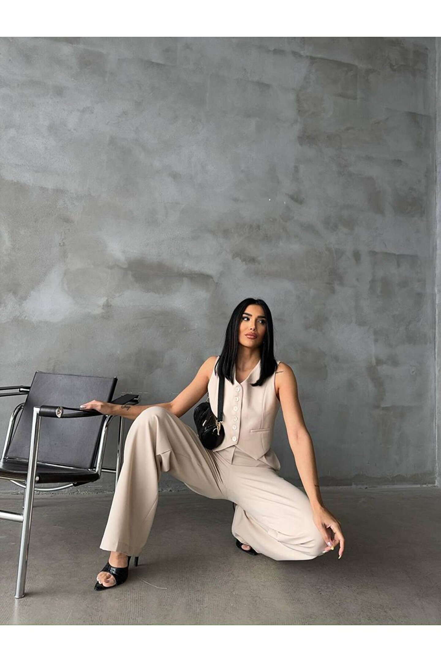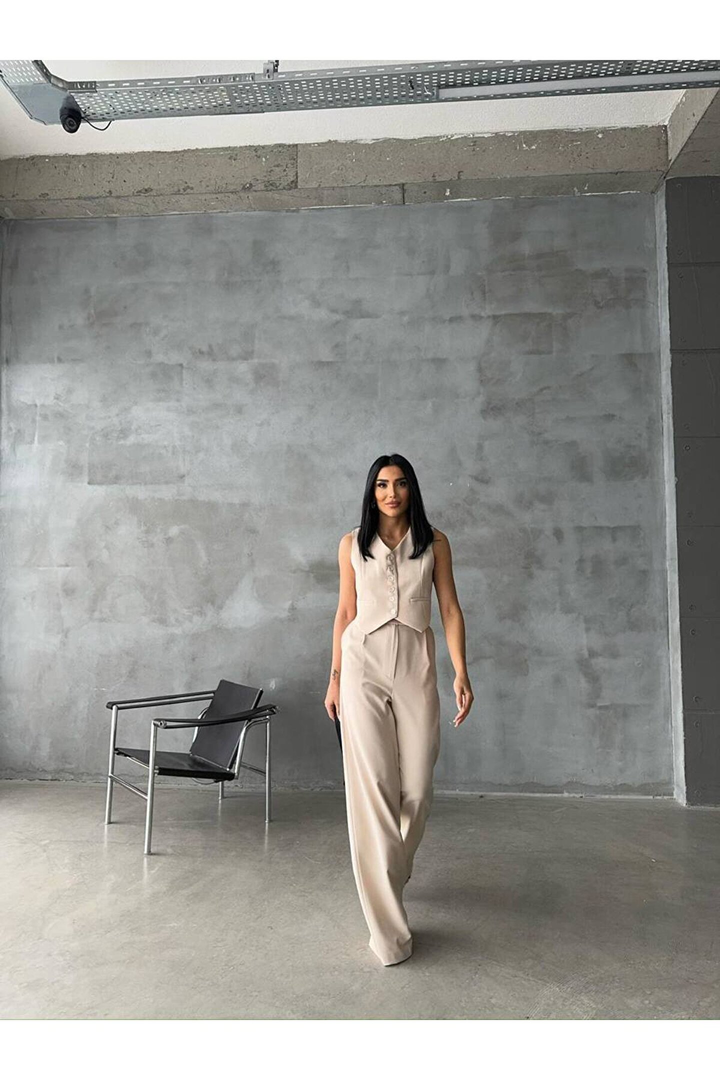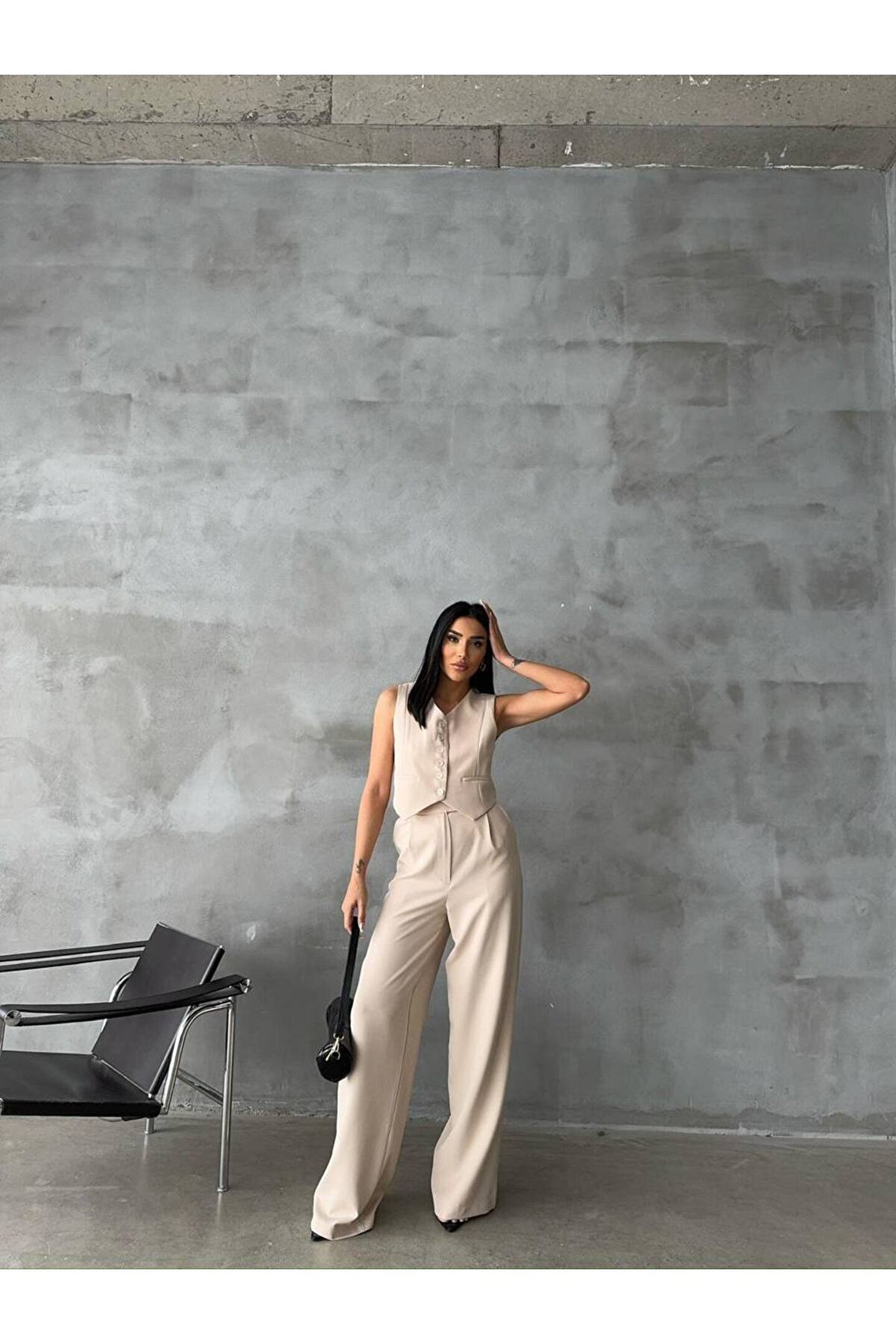 popibutik Atlas Kumaş Yüksel Bel İspanyol Paça Pantolon Yelek Bej Takım