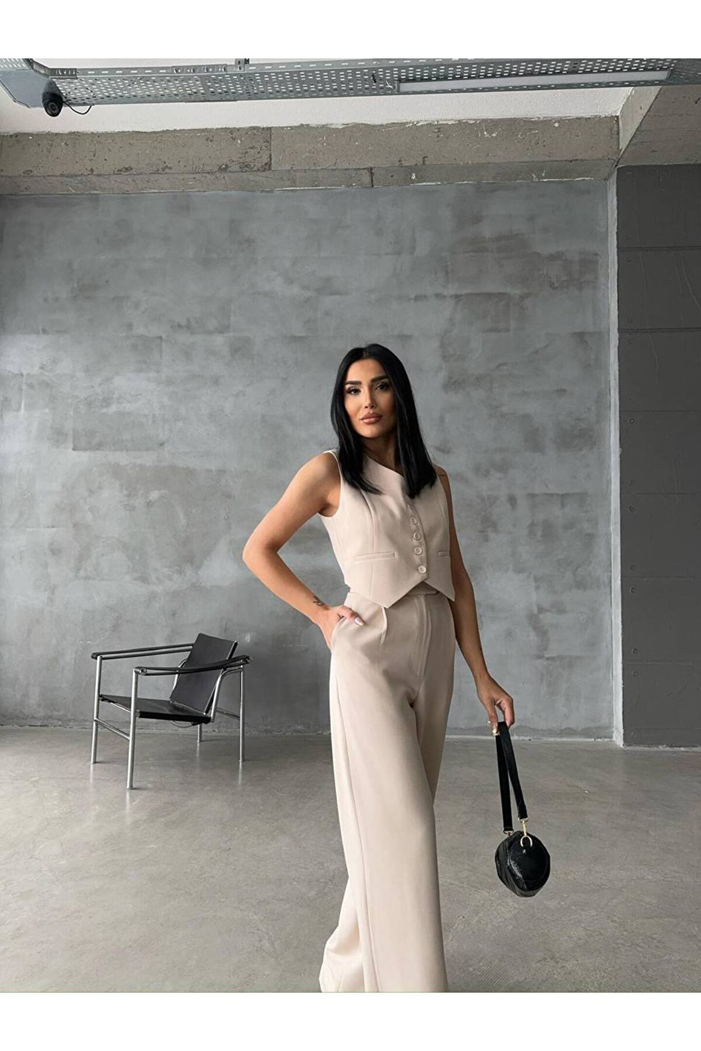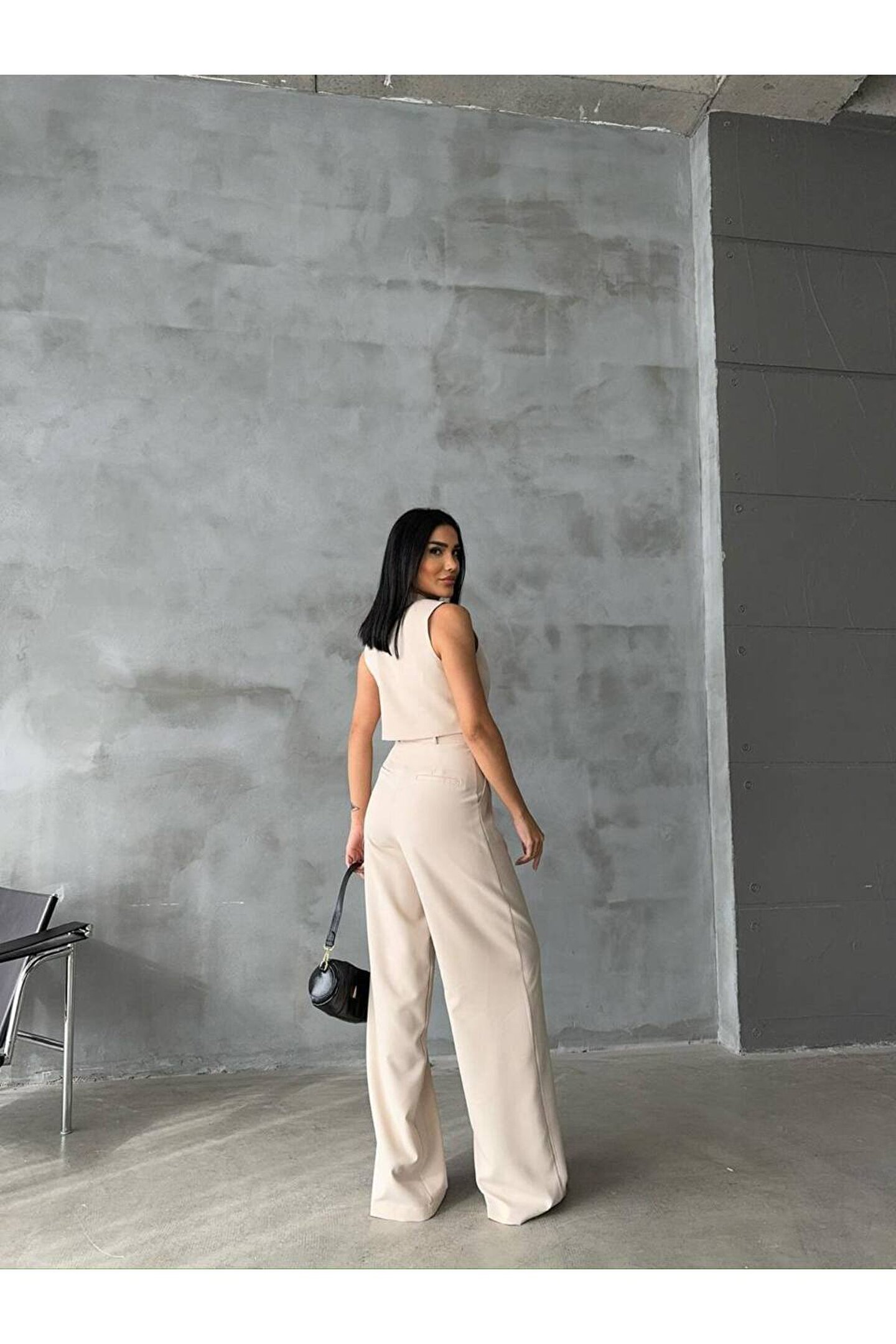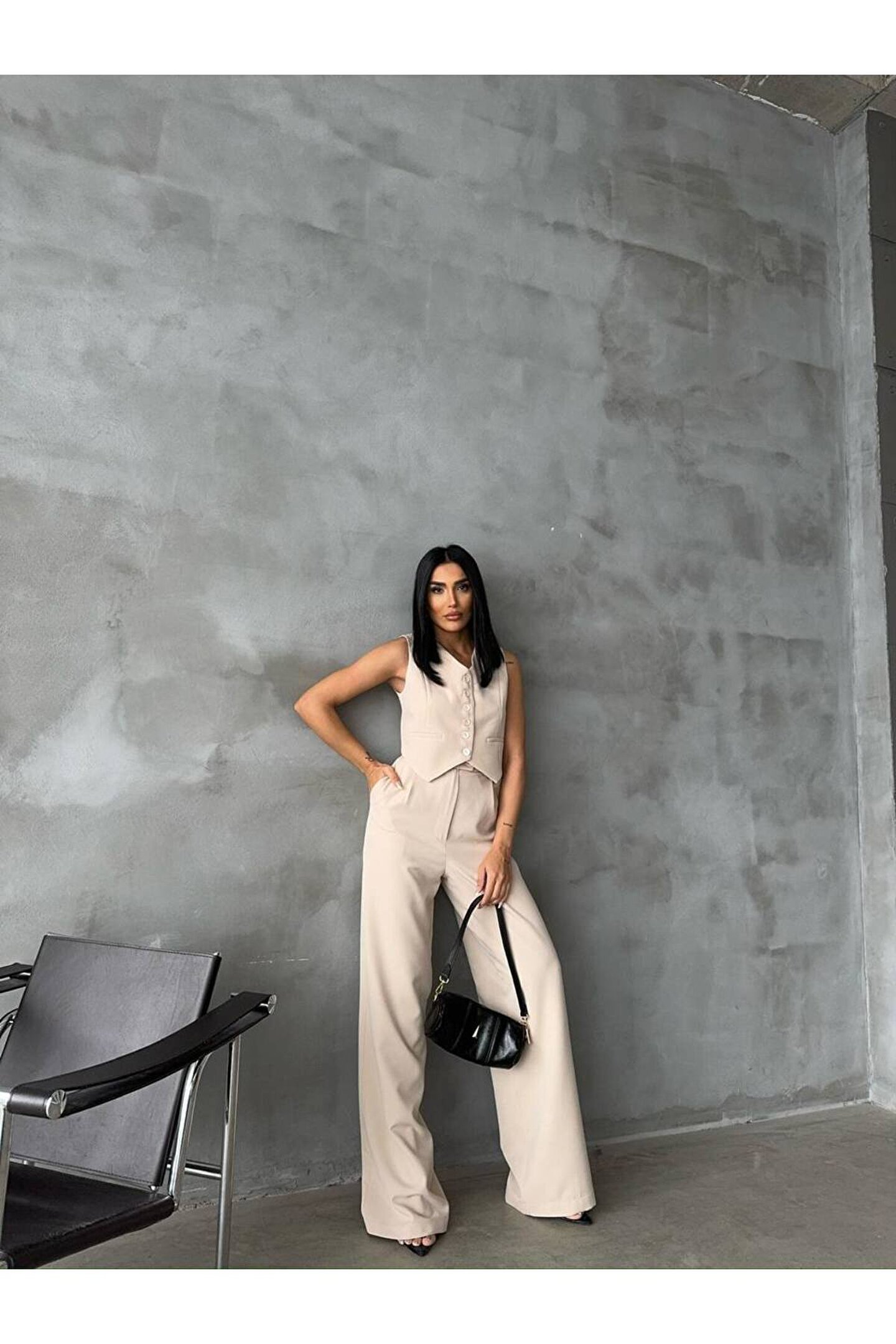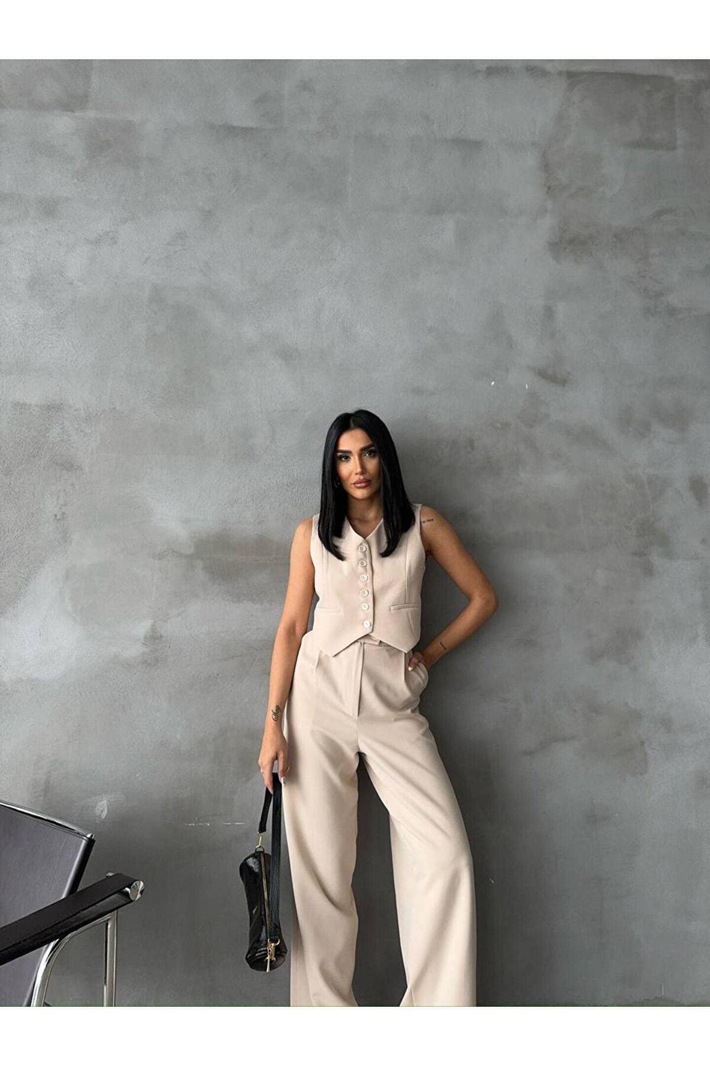 popibutik Atlas Kumaş Yüksel Bel İspanyol Paça Pantolon Yelek Bej Takım