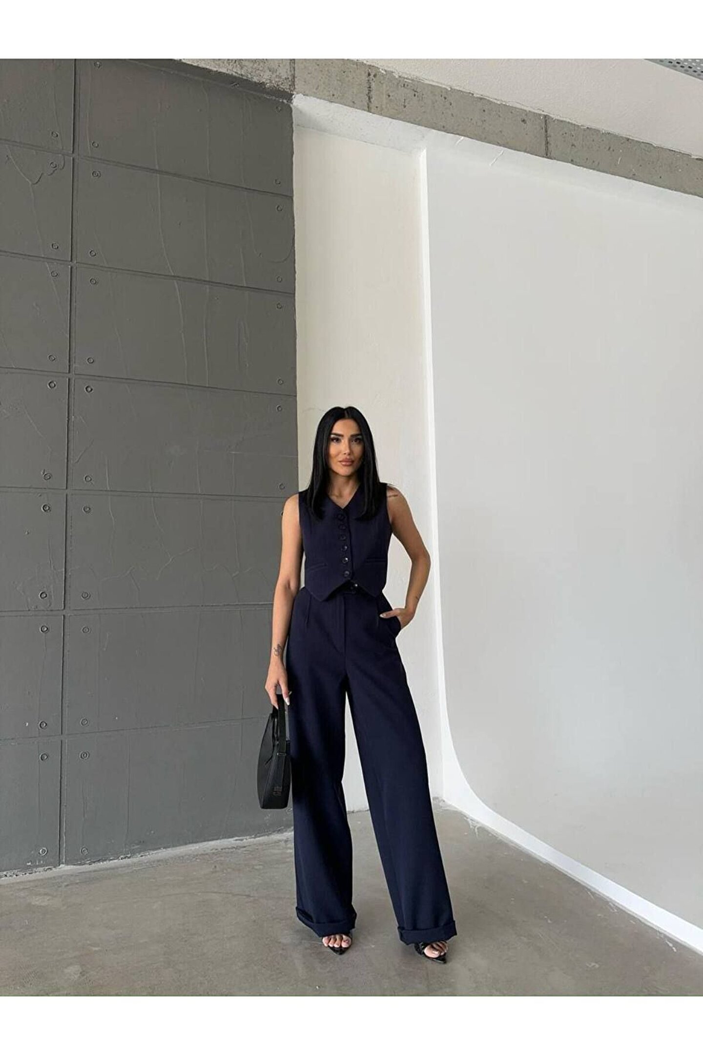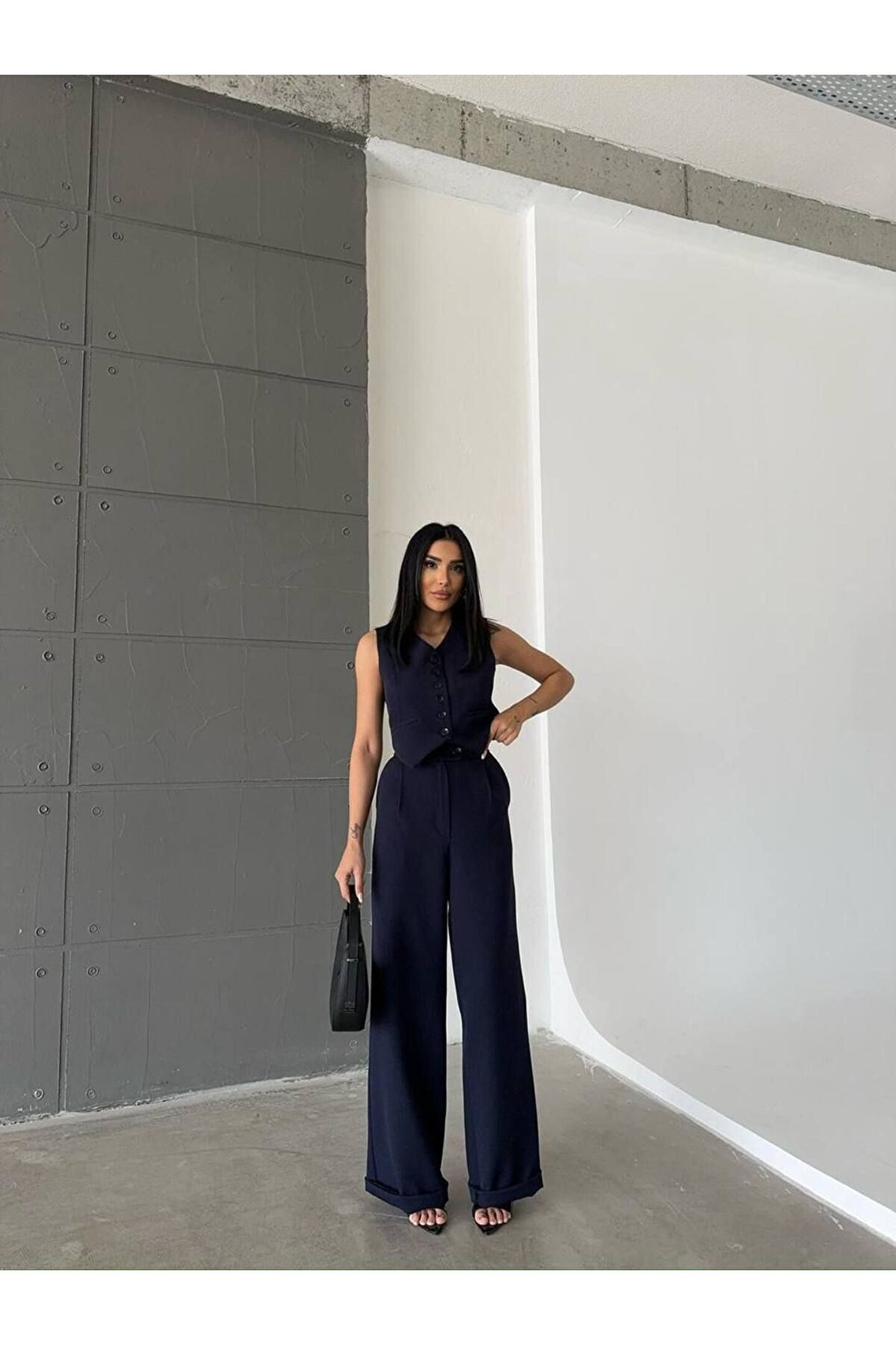popibutik Atlas Kumaş Yüksel Bel İspanyol Paça Pantolon Yelek siyah Takım