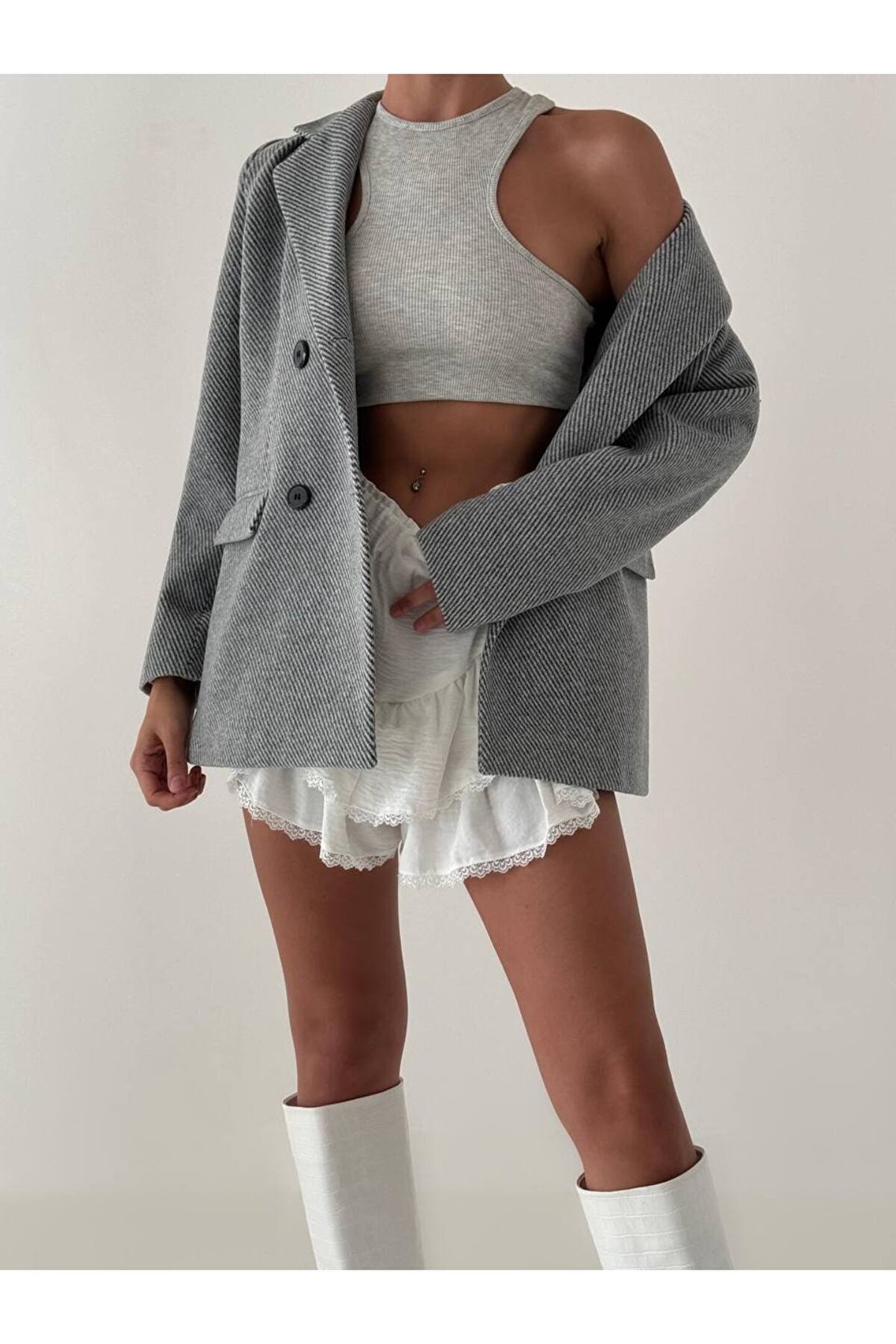 popibutik Balık Sırtı Desenli Astarlı Düğmeli Gri Kaşe Kumaş Kısa Boy Kaban