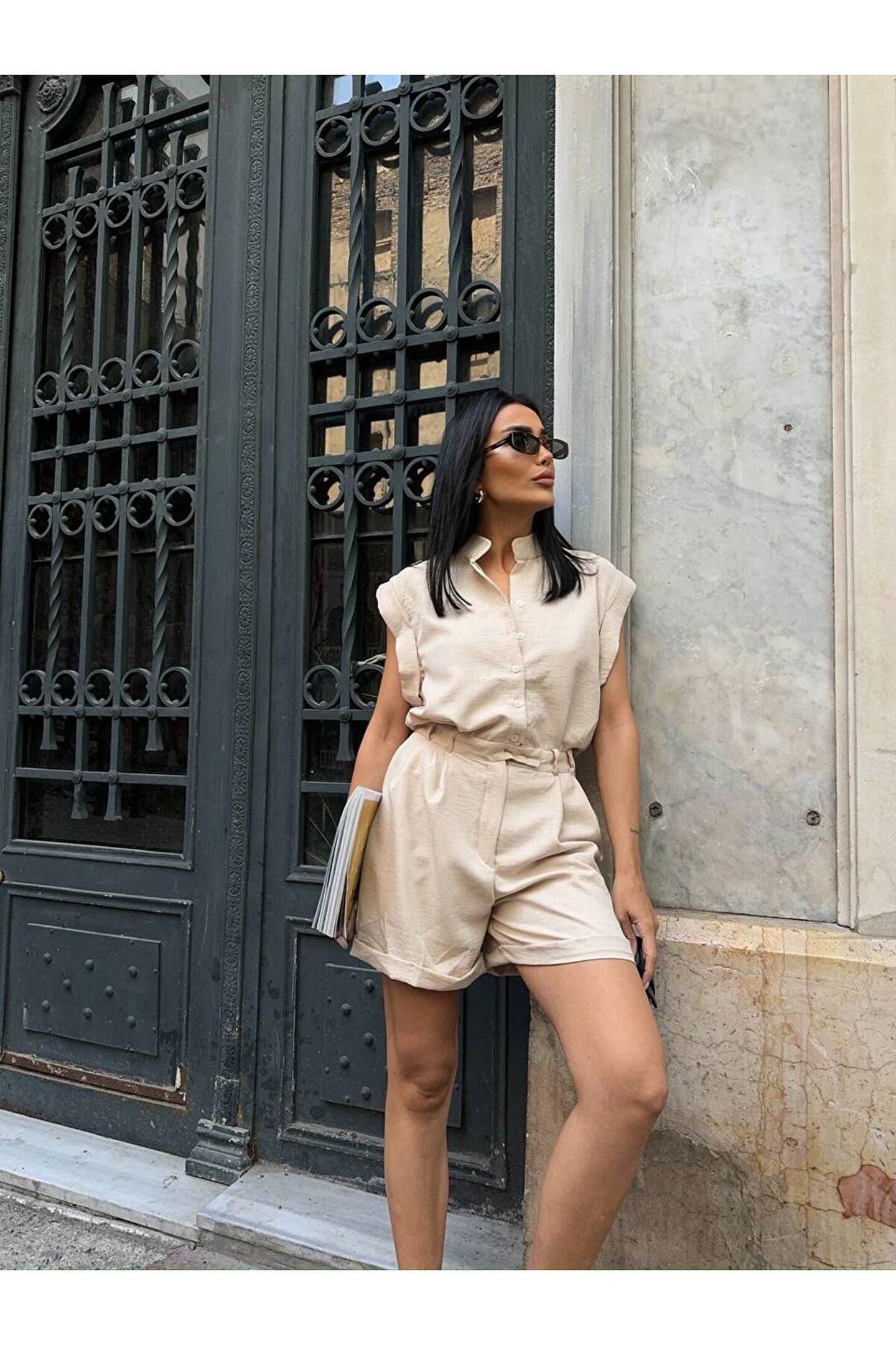 popibutik Cep Detaylı Sıfır Kol Dik Yaka Keten Kumaş Krem Şort Tulum
