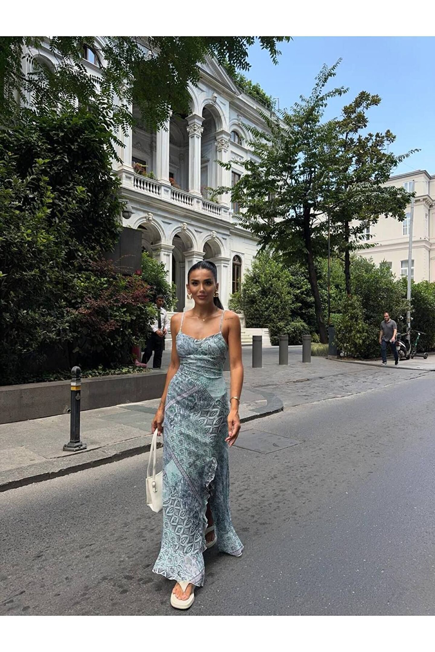 Desenli İnce Askılı Uzun Şifon Elbise ;