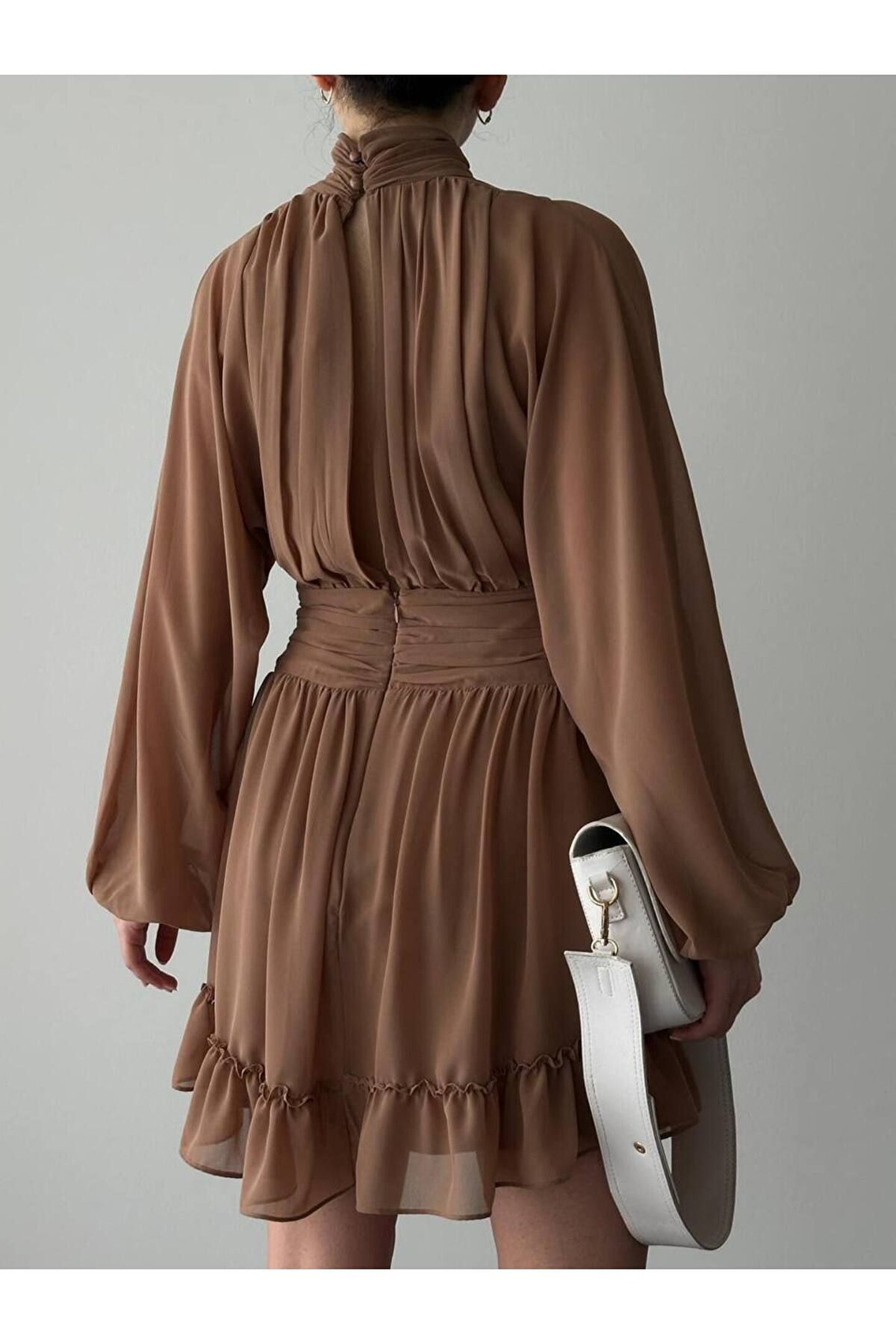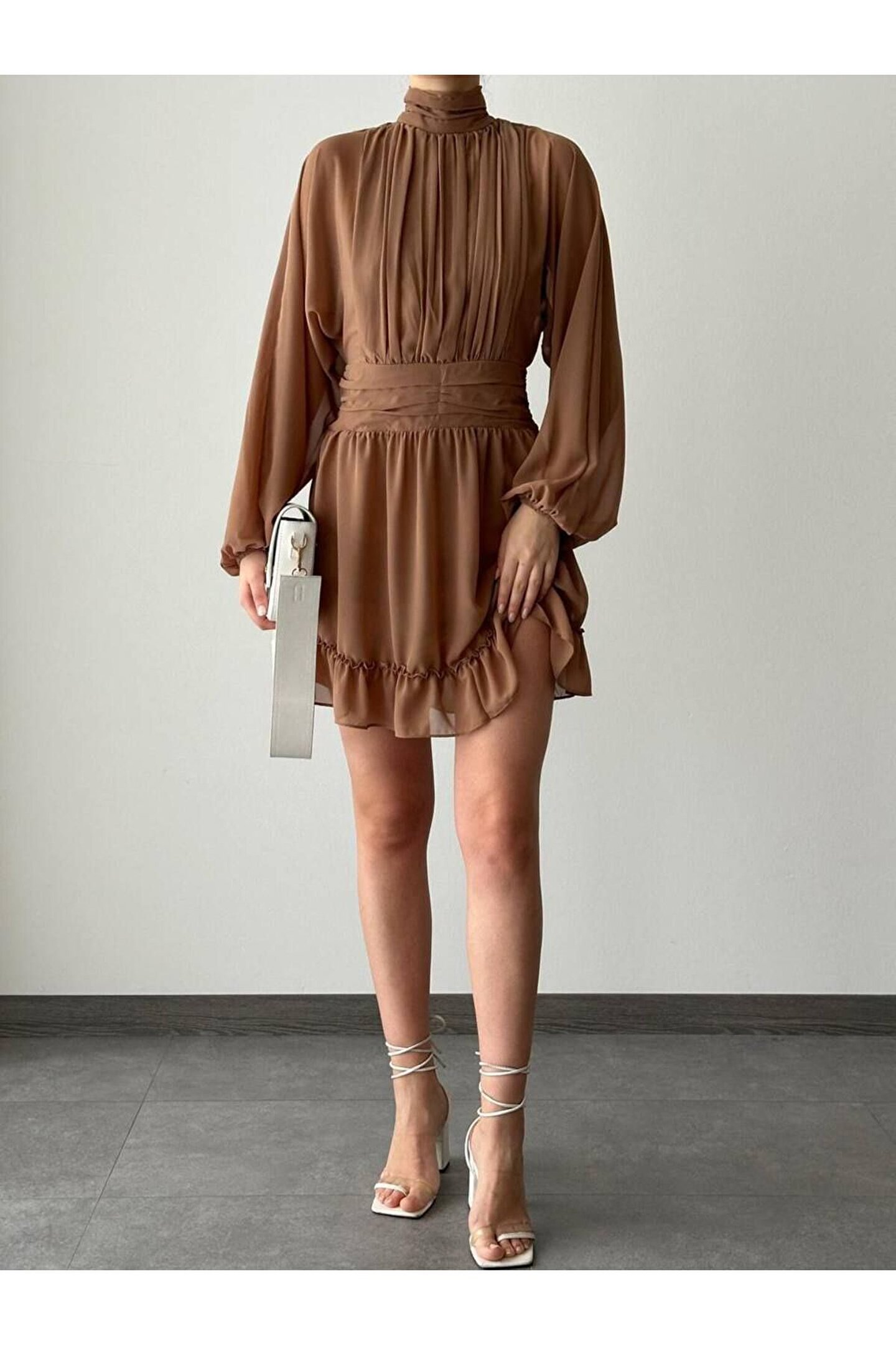 popibutik Dik Yakalı Drapeli Mini Kahve Şifon Elbise