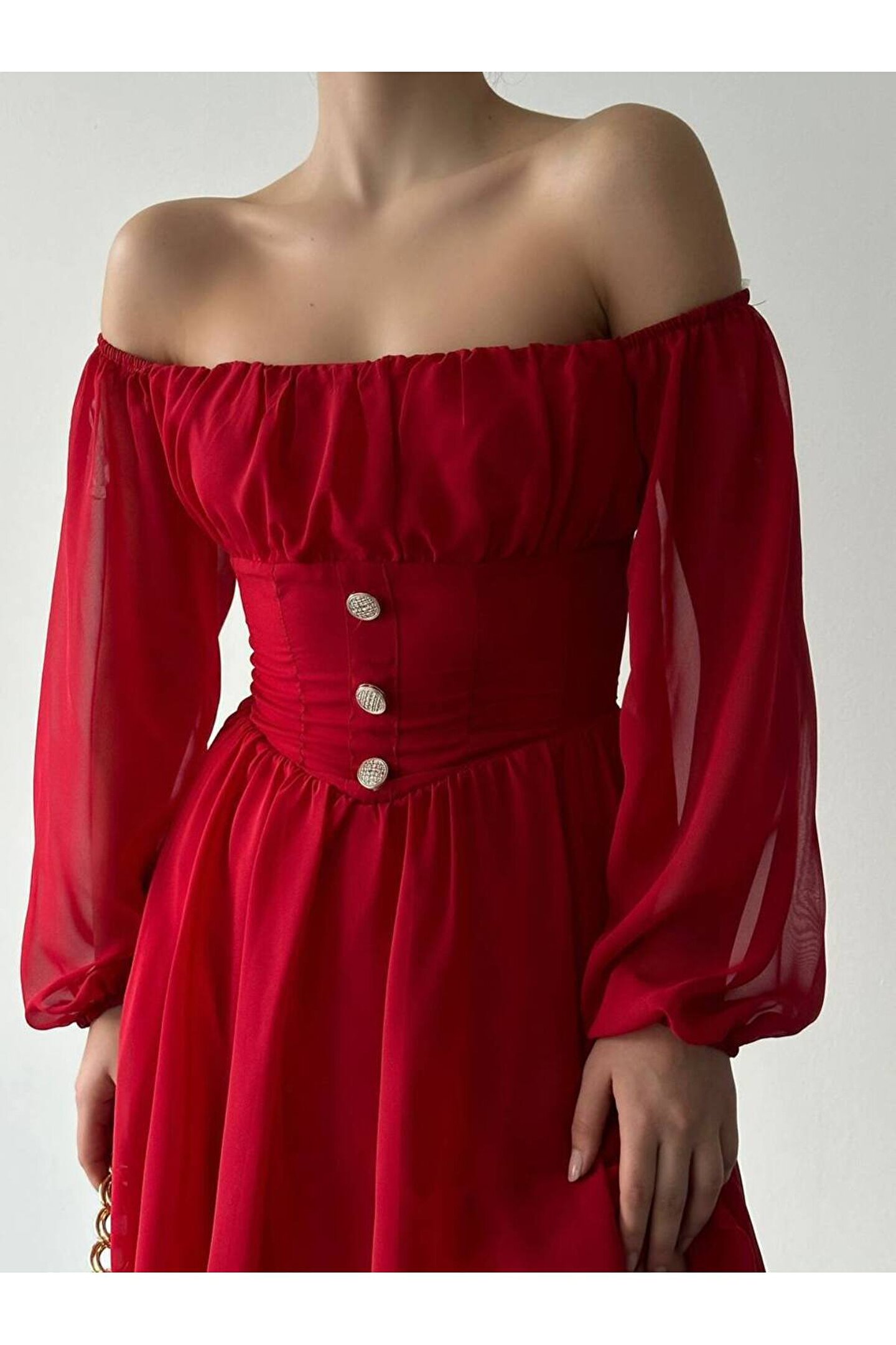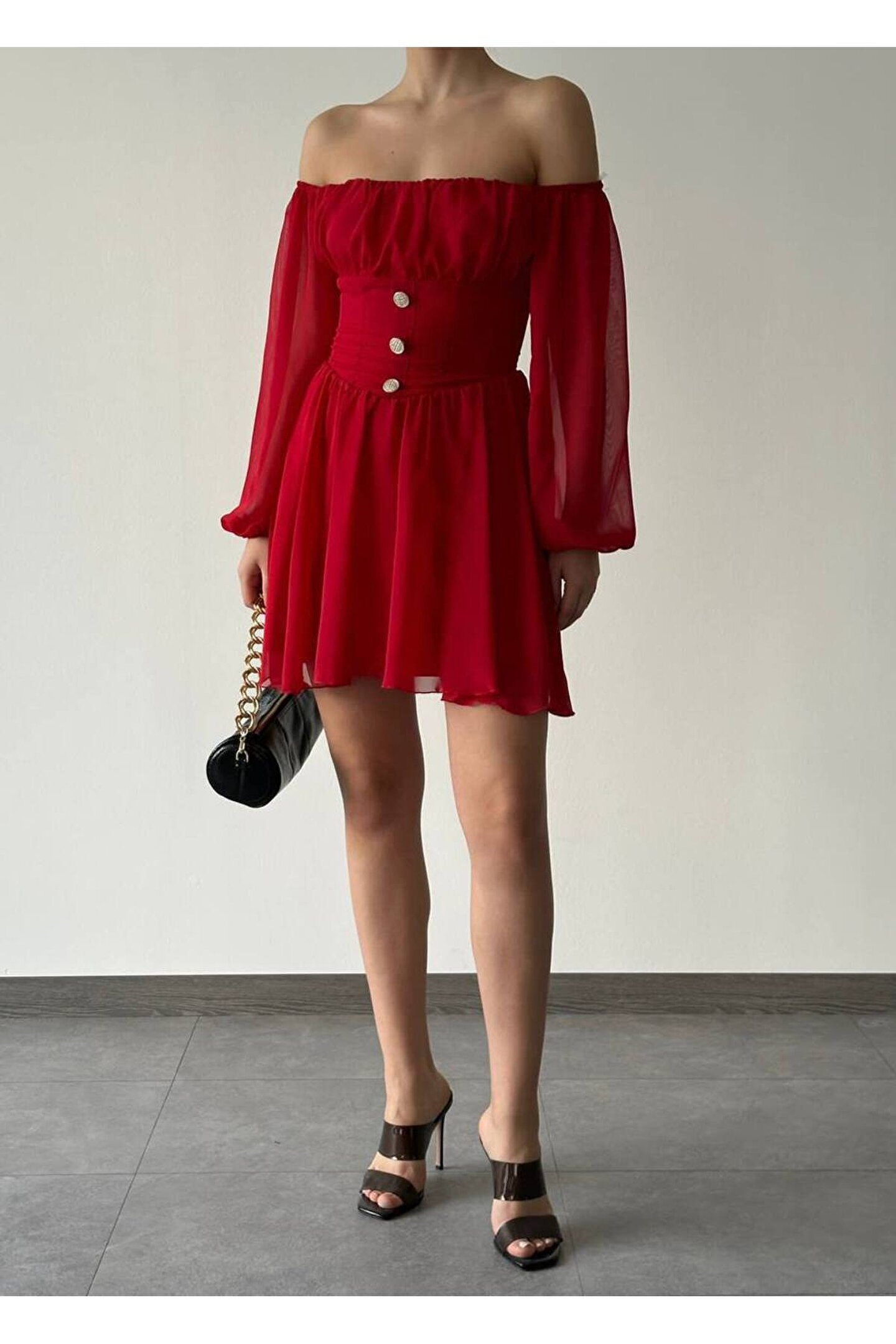 Zarif düğme detaylarıyla süslenmiş mini şifon elbise, günlük kullanımdan özel davetlere kadar her ortamda şıklığınızı konuşturmanızı sağlar.; Basic koleksiyonunun sadeliğiyle öne çıkan bu elbise, zamansız tasarımıyla tüm yaş gruplarına hitap eder.; Carmen yaka detayı ile feminen bir duruş sergileyen bu elbise, uzun kolları sayesinde mevsim geçişlerinde ideal bir tercih olabilir.; Şifon dokusuyla hafif ve nefes alabilen yapısı, gün boyu konforunuzdan ödün vermeden stilinizi korumanızı sağlar.; Astarlı yapısıyla rahatlık sunan bu elbisenin slim kalıbı, vücut hatlarınızı zarifçe sararak feminen siluetinizi ön plana çıkarır.; Dantel detaylarıyla zenginleştirilmiş düz tasarımı ile sade güzelliğin simgesi olan bu elbise, her tür aksesuarla kolayca kombinlenebilir.;