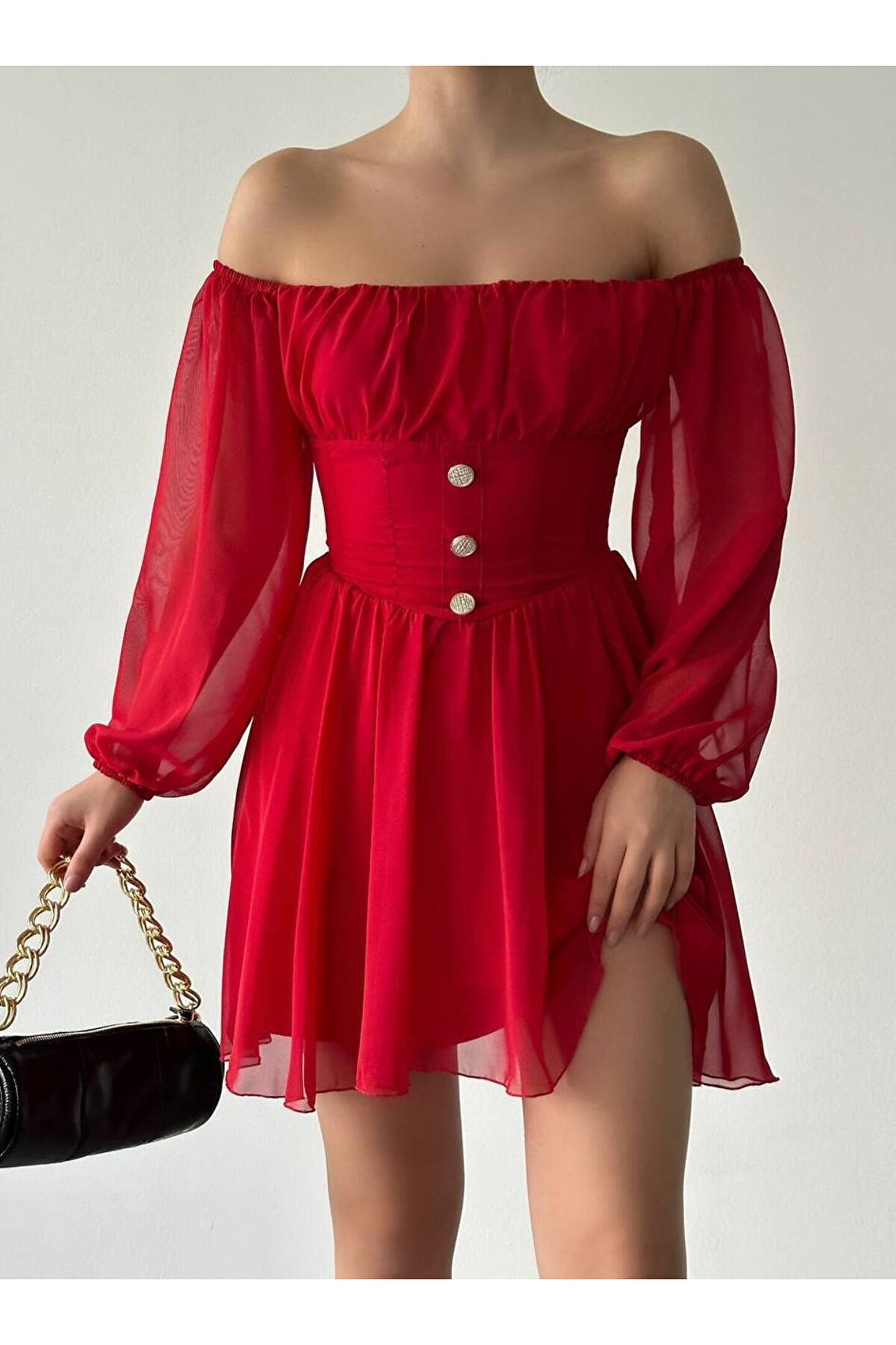 Zarif düğme detaylarıyla süslenmiş mini şifon elbise, günlük kullanımdan özel davetlere kadar her ortamda şıklığınızı konuşturmanızı sağlar.; Basic koleksiyonunun sadeliğiyle öne çıkan bu elbise, zamansız tasarımıyla tüm yaş gruplarına hitap eder.; Carmen yaka detayı ile feminen bir duruş sergileyen bu elbise, uzun kolları sayesinde mevsim geçişlerinde ideal bir tercih olabilir.; Şifon dokusuyla hafif ve nefes alabilen yapısı, gün boyu konforunuzdan ödün vermeden stilinizi korumanızı sağlar.; Astarlı yapısıyla rahatlık sunan bu elbisenin slim kalıbı, vücut hatlarınızı zarifçe sararak feminen siluetinizi ön plana çıkarır.; Dantel detaylarıyla zenginleştirilmiş düz tasarımı ile sade güzelliğin simgesi olan bu elbise, her tür aksesuarla kolayca kombinlenebilir.;