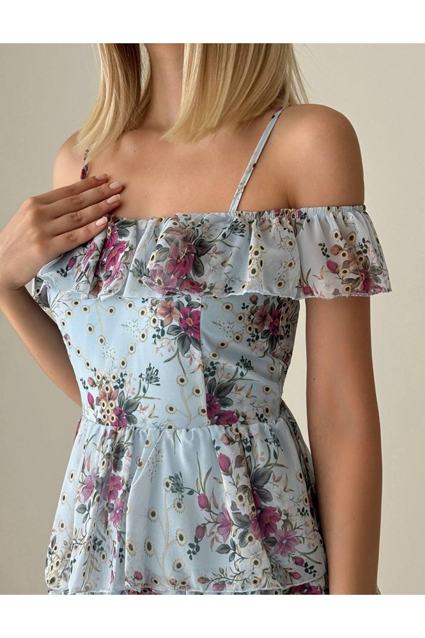 popibutik Düşük Omuz Kat Etekli Gipeli Şifon Kumaş Mini Mavi Elbise