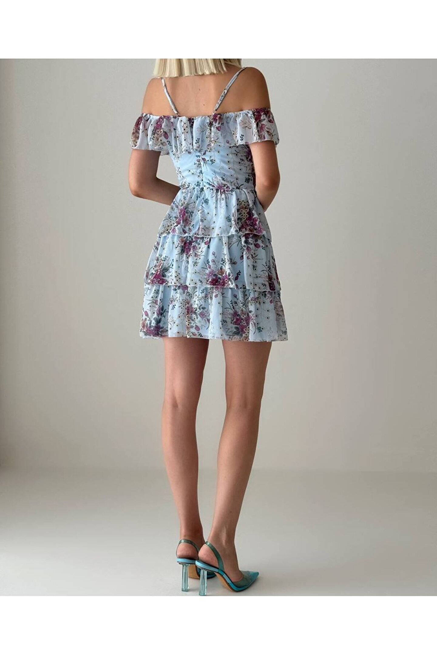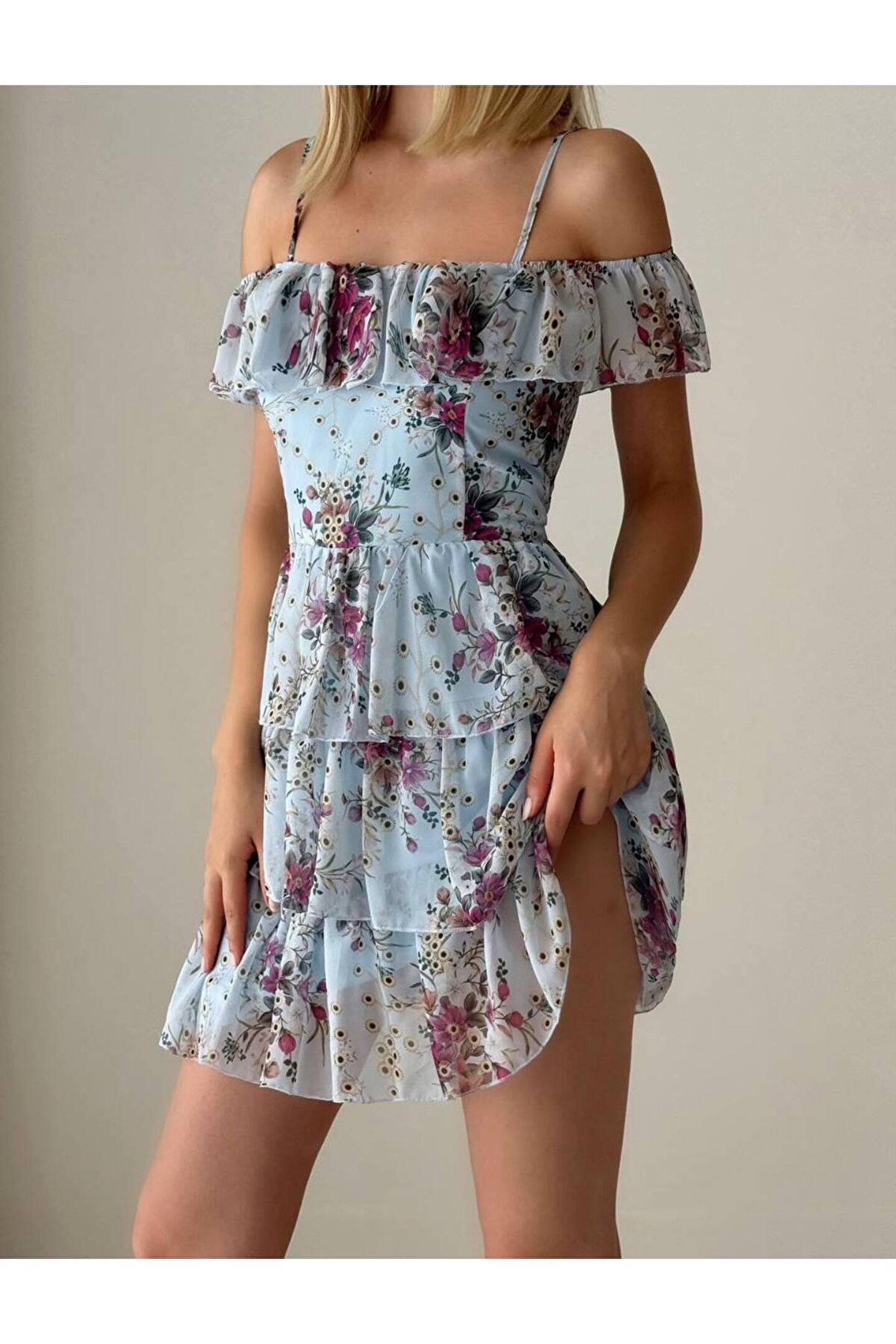 Gençlerin enerjisini ve dinamizmini yansıtan, bebe omuz kat etekli tasarımıyla dikkat çeken mini mavi elbise; Beline oturan kalıbı sayesinde vücut hatlarını zarifçe sararak feminen bir siluet oluşturur; Mini boyu ile modern ve şık bir görünüm sunar, hareket özgürlüğünüzü kısıtlamaz; Şifon kumaş yapısı, hafif ve nefes alabilen dokusuyla gün boyu konfor sağlar; Belirtilmemiş kumaş tipi, esneklik ve rahatlık sunarak her türlü vücut tipine uyum sağlar;