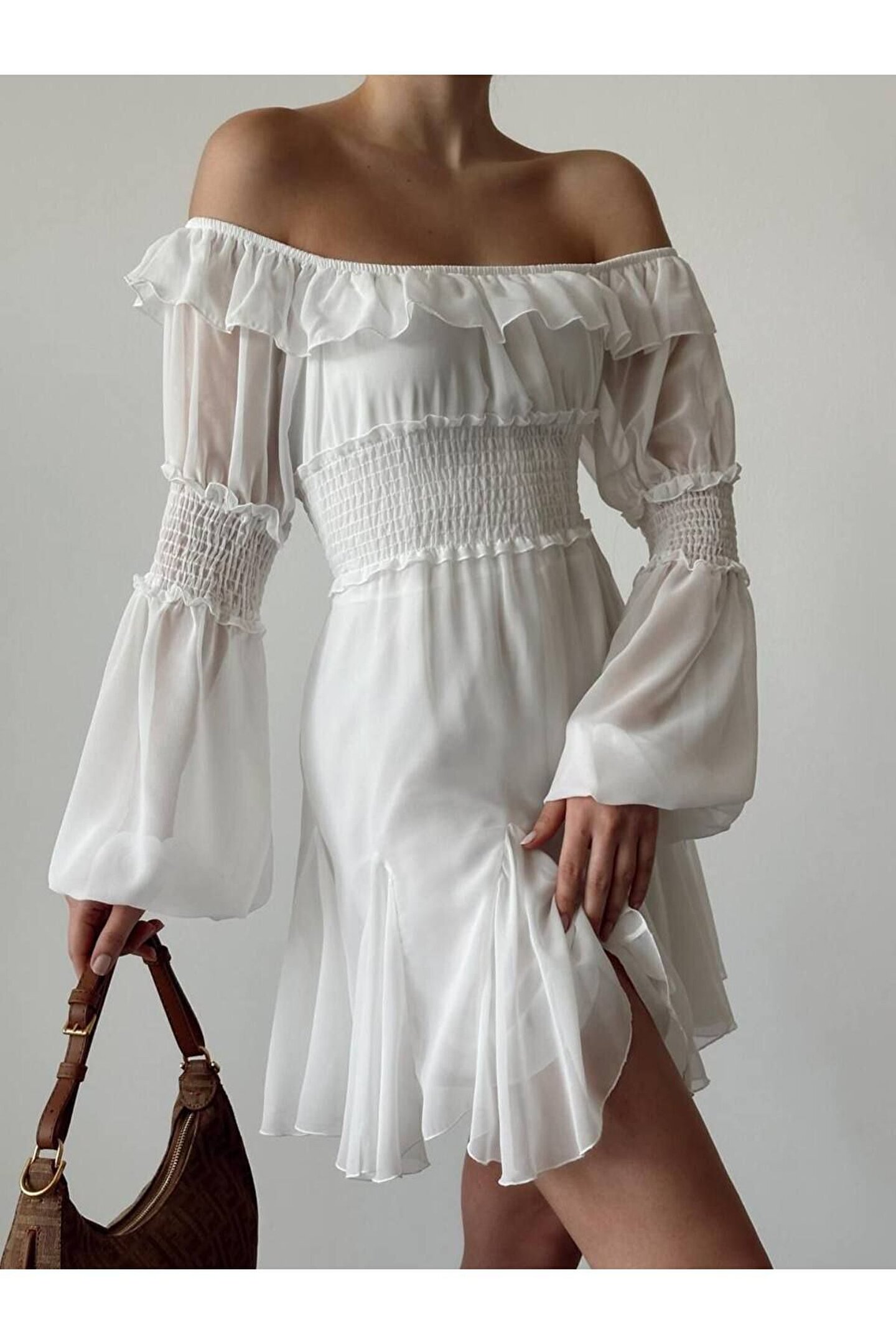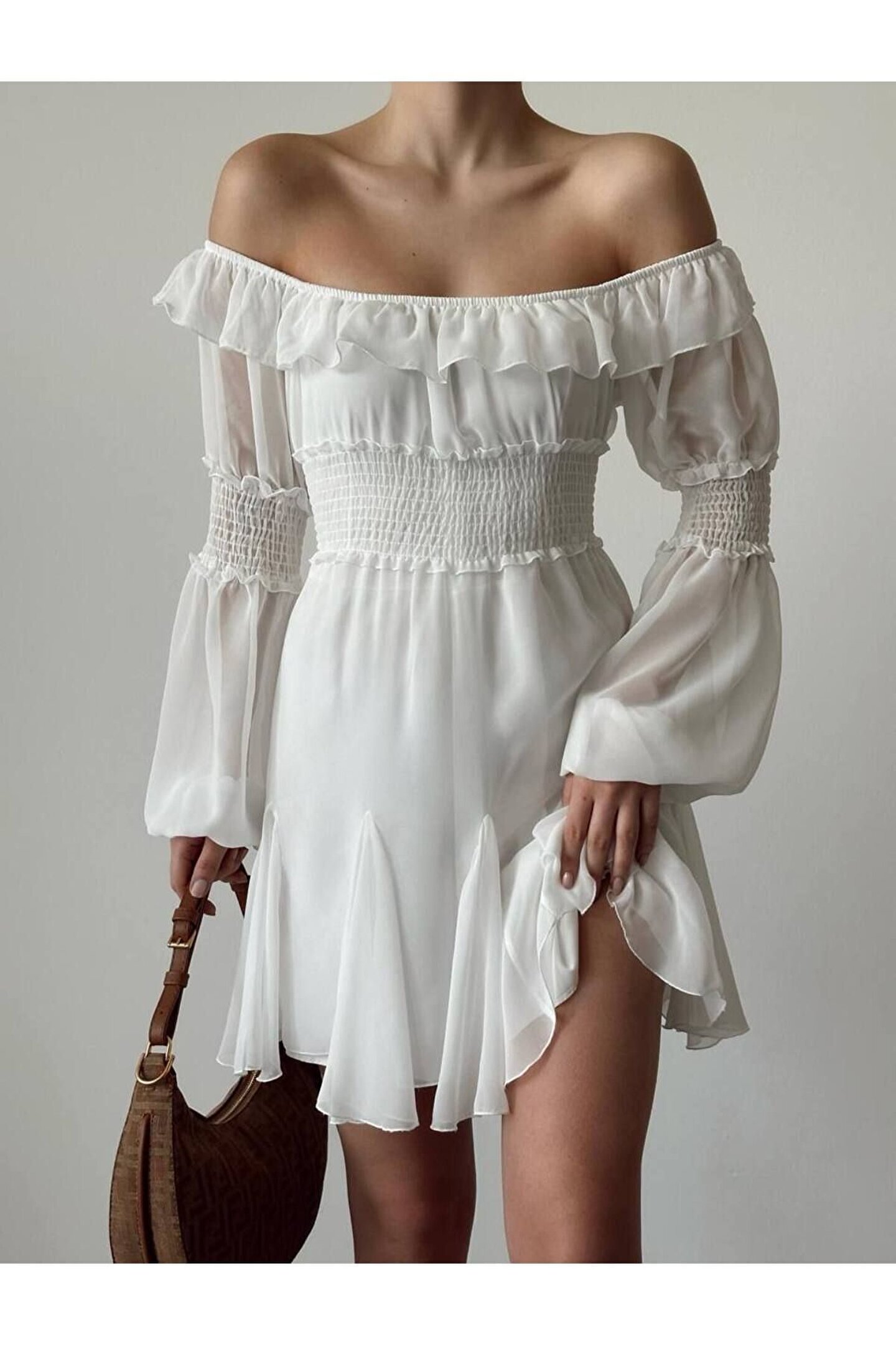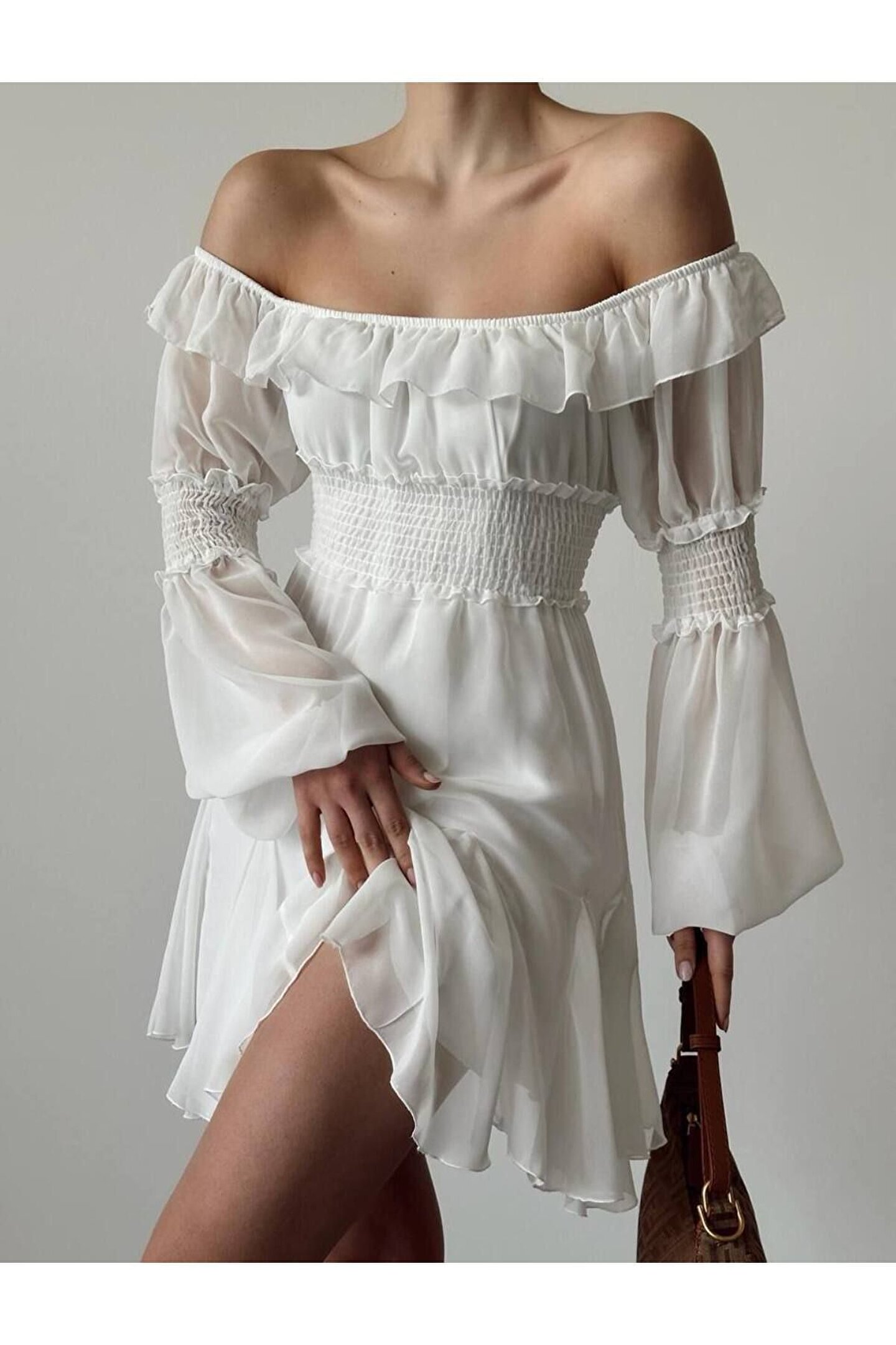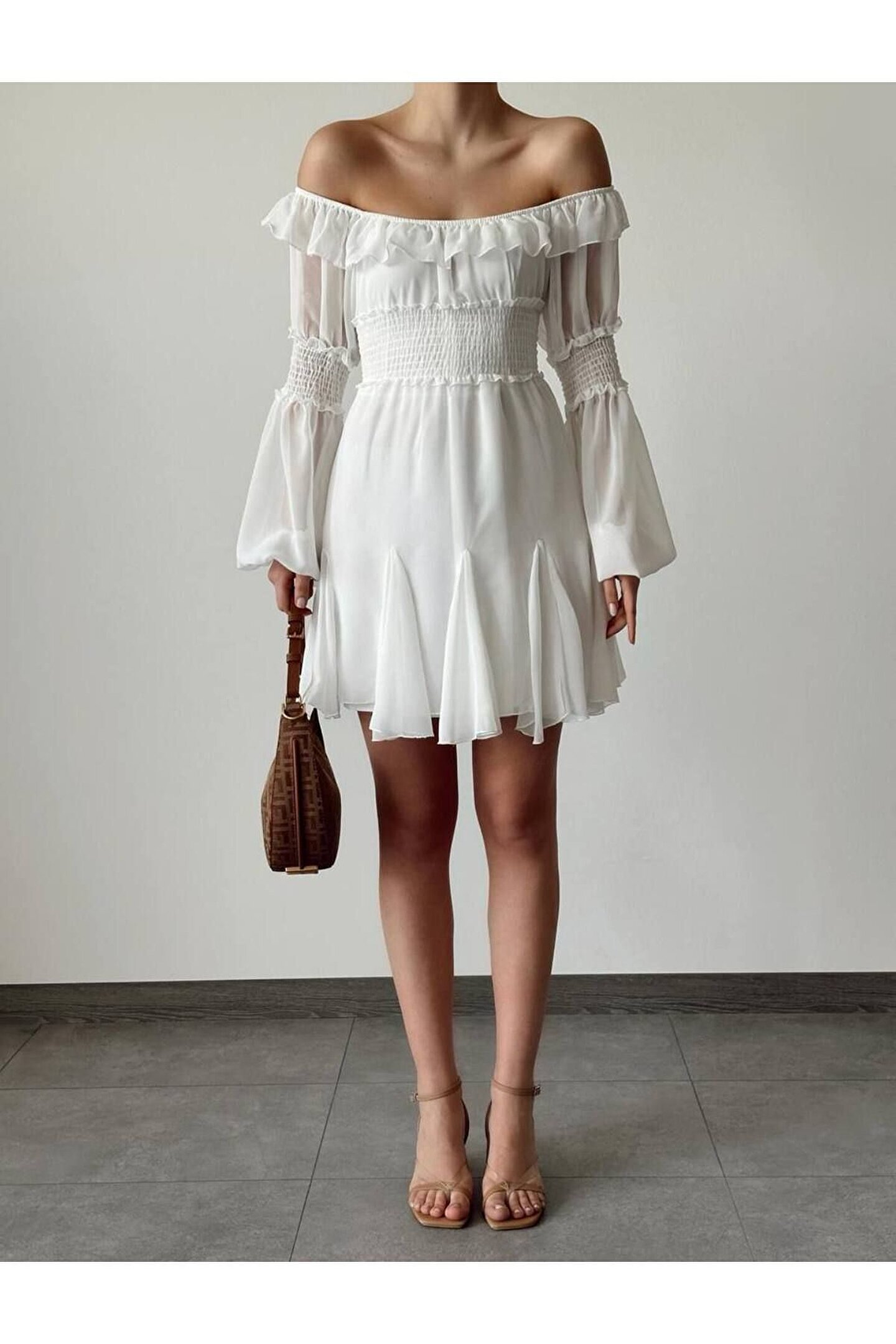 - Zarif gipe detayları ile süslenmiş, mini boy şık ve gece kullanımına uygun beyaz şifon elbise, tüm gözleri üzerinize çeker; - Astarlı yapısı sayesinde rahatlık ve konforu bir arada sunar, gün boyu kendinizi iyi hissetmenizi sağlar; - Dantel kumaşı ile zarafeti ve feminenliği ön plana çıkaran bu elbise, her türlü özel davet ve etkinlikte şıklığınızla fark yaratmanızı sağlar; - Her yaş grubuna hitap eden tasarımıyla geniş bir kullanıcı yelpazesine sahiptir; gençlerden yetişkinlere kadar herkes için idealdir; - Slim kalıbı sayesinde vücut hatlarınıza mükemmel uyum sağlayarak şık bir siluet oluştururken, dantel dokuma tipi ile sofistike bir görünüm kazandırır;