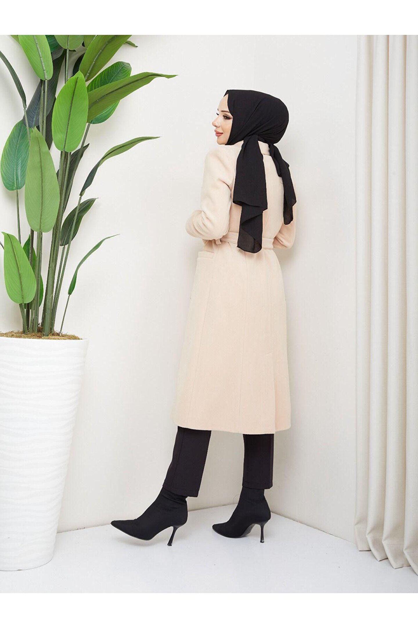 popibutik Gizli Düğmeli Yırtmaç Detaylı Cepli Kuşaklı Midi Boy Kaşe Kaban