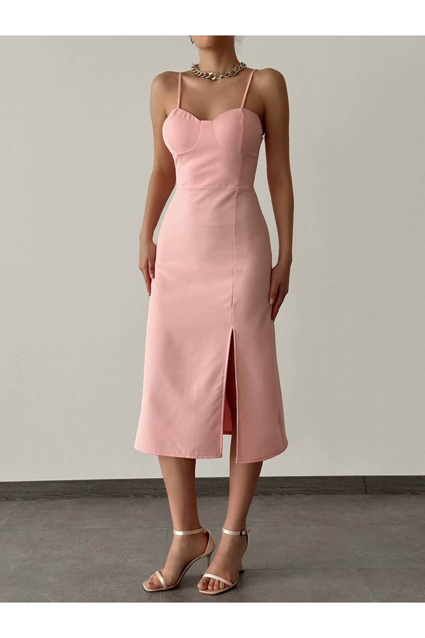 Her yaş grubuna uygun tasarımıyla geniş bir kullanıcı kitlesine hitap eden midi boy pudra renkli elbise, özel günlerde şıklığınızla fark yaratmanızı sağlar.; Modern ve şık görünümüyle dikkat çeken slim kalıp, vücut hatlarınıza mükemmel uyum sağlayarak zarif bir siluet oluşturur.; Midi boy kesimi sayesinde hem günlük kullanımda hem de özel davetlerde ideal tercih olurken, yırtmaç detayları feminenliğinizi ön plana çıkarır.; Dantel dokuması ile sofistike bir hava katarken, pudra rengin zarafeti her ortamda sizi ön plana çıkartır.; Düz ürün tipiyle sade ve zamansız bir tarz sunarak, farklı aksesuar ve ayakkabılarla kolayca kombinlenebilir.;