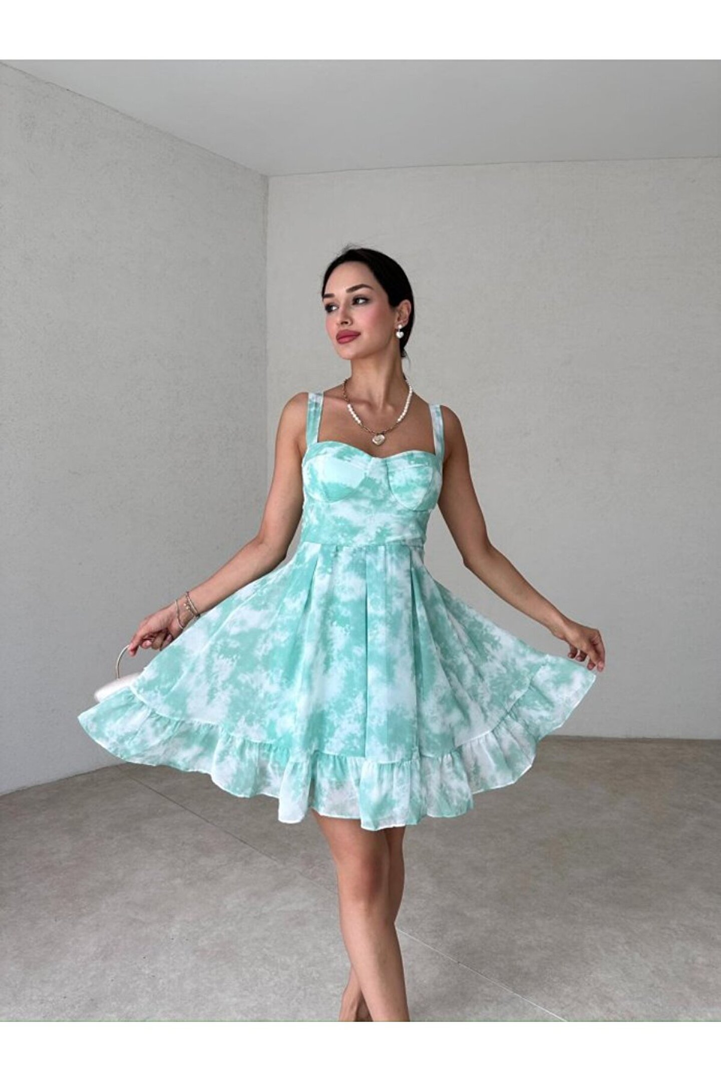 popibutik Gloplu Kalın Askılı Pile Etek Mini Şifon Yeşil Elbise
