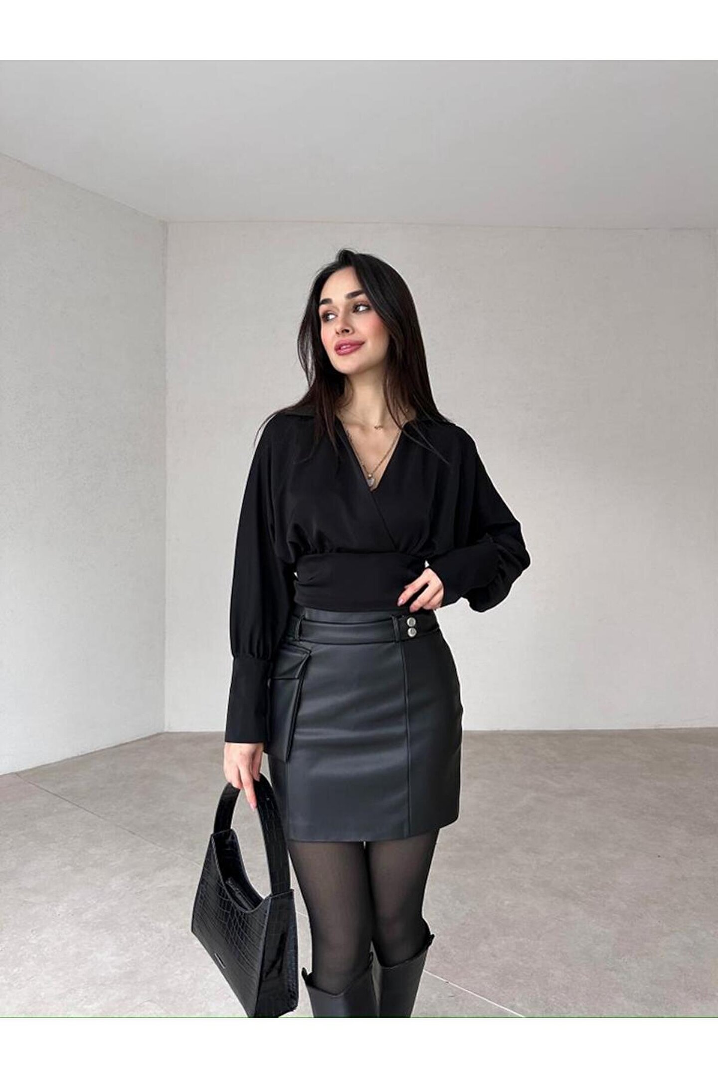 Gömlek-Etek Takım tam kalıplıdır. ; Gömlek omuzdan aşağı 43 cm uzunluğundadır. ; Gömlek yandan fermuarlıdır. ; Etek yüksek beldir. ; Takım altı belden aşağı 41 cm'dir. ; Etek deri kumaştır. ; Etek iç göstermemektedir. ; Takım esnek değildir. ; Sıklıkla kullandığınız bedeni tercih edebilirsiniz. ; Görseldeki model 170 cm, 55 kg'dır. ; Model üzerindeki takım S bedendir. ; Modelin kendi bedenide S bedendir. ; ( Takım halinde satıştadır ) ;