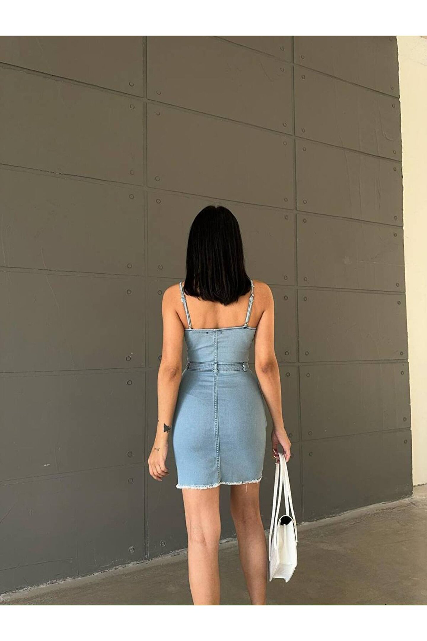 popibutik İp Askılı Yıkamalı Likralı Yırtık Detay Göğüs Bağlamalı Kot Elbise