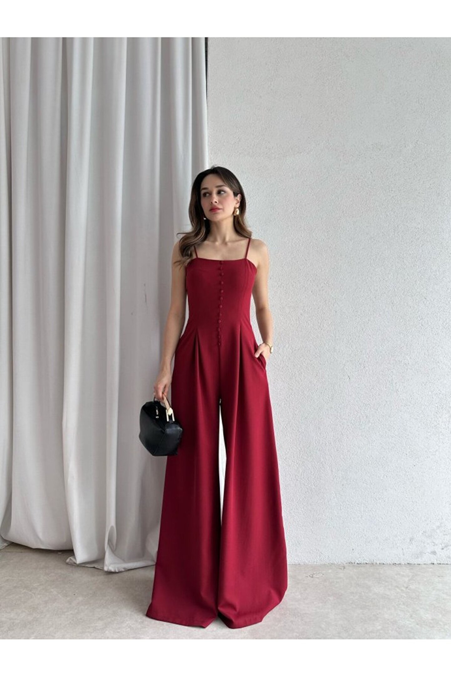 popibutik Kadın Askılı Kare Yaka Düğme Detaylı Tulum