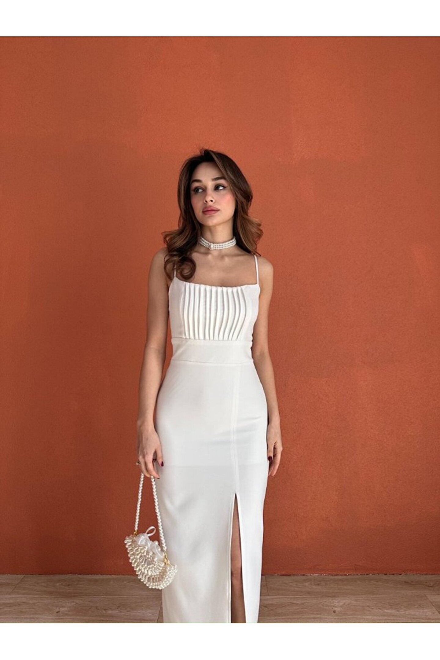 popibutik Kadın Askılı Yırtmaç Detaylı Atlas Kumaş Beyaz Uzun Elbise