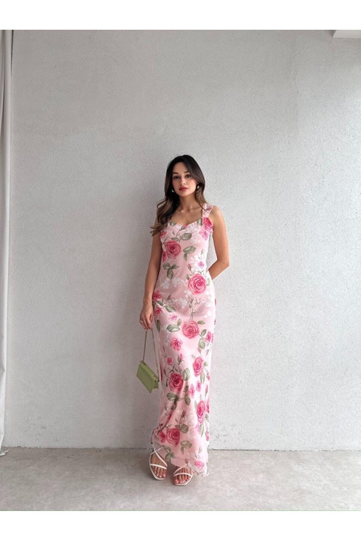 popibutik Kadın Astarlı Çiçek Desenli Uzun Tül Elbise