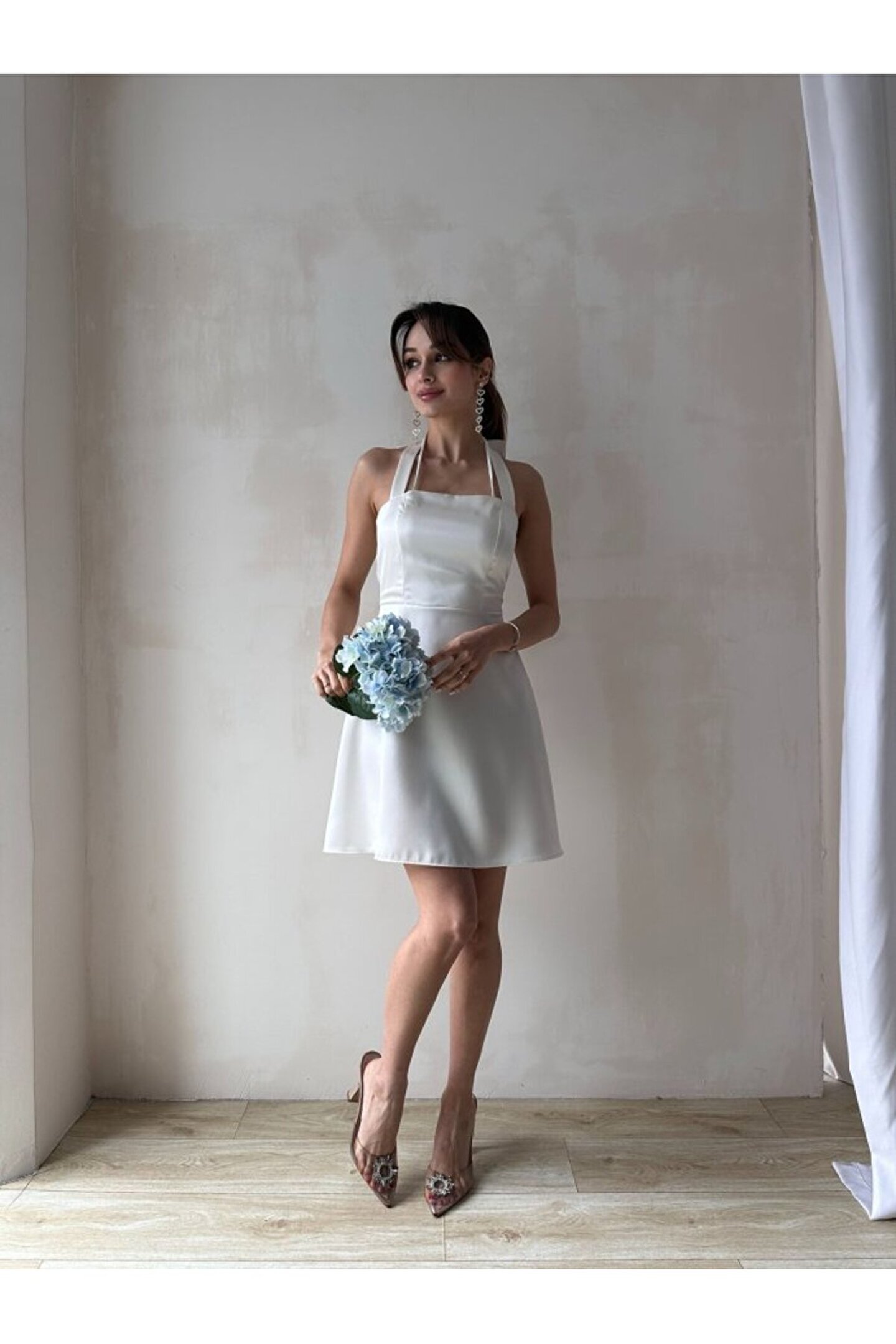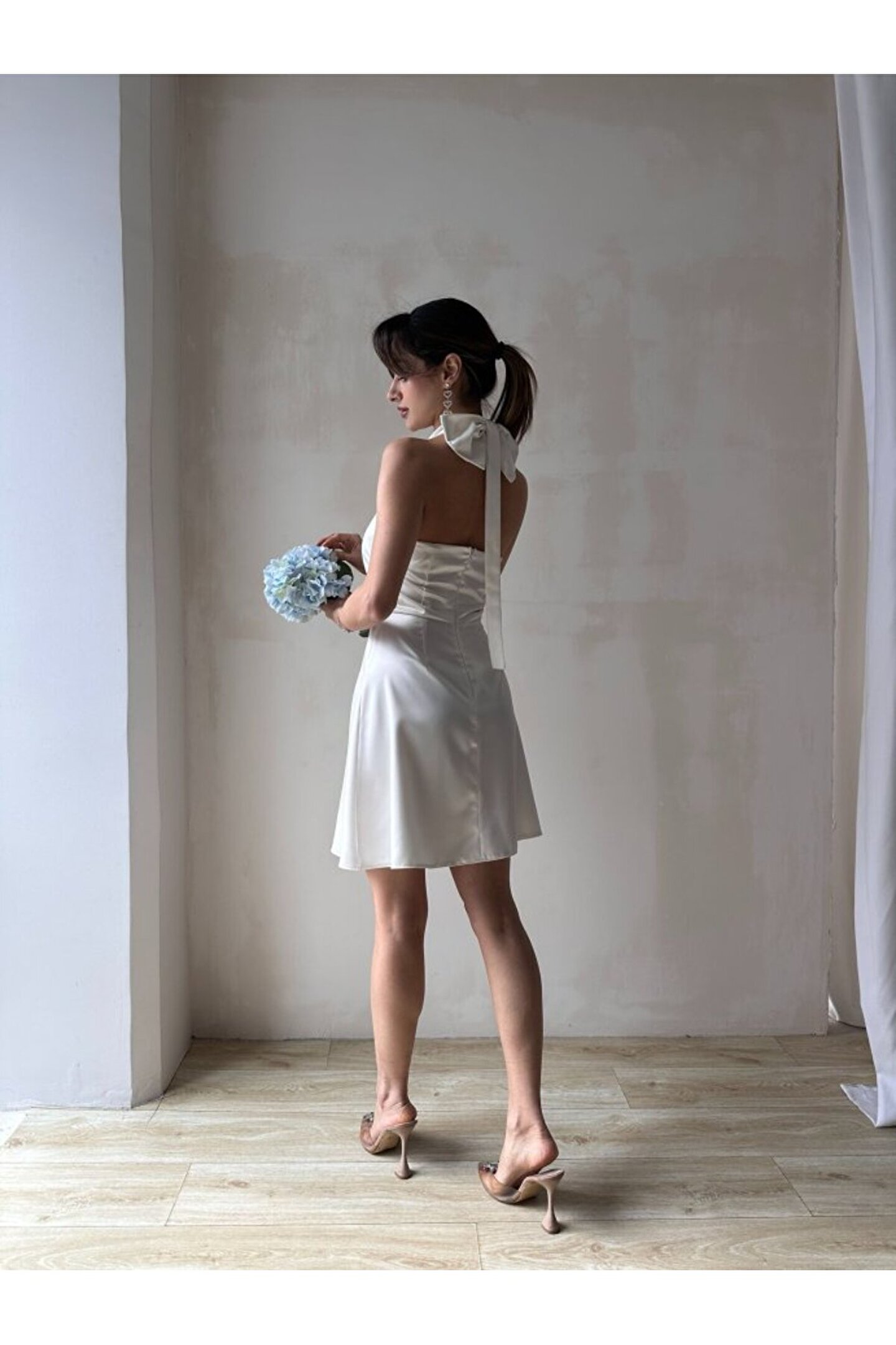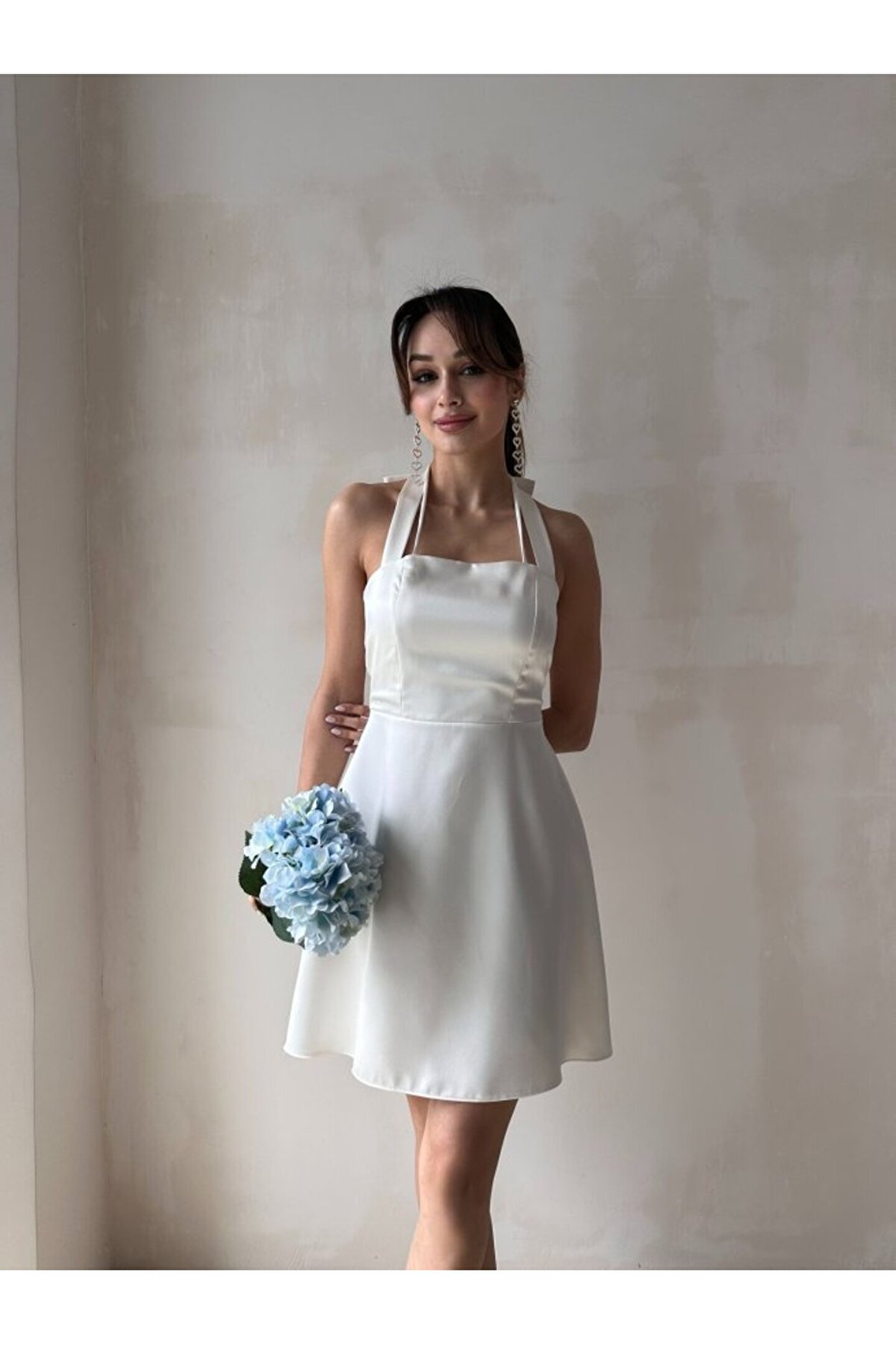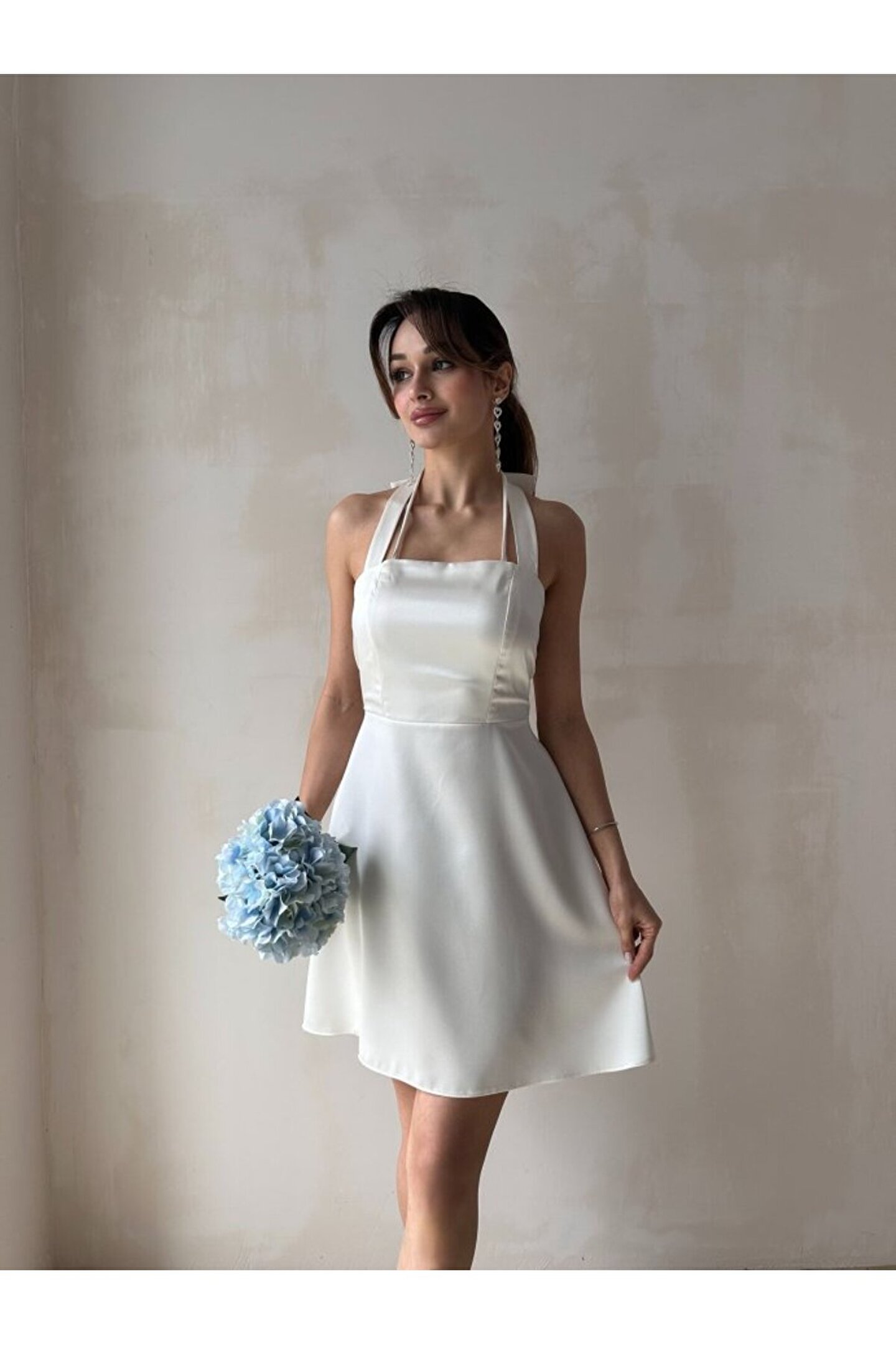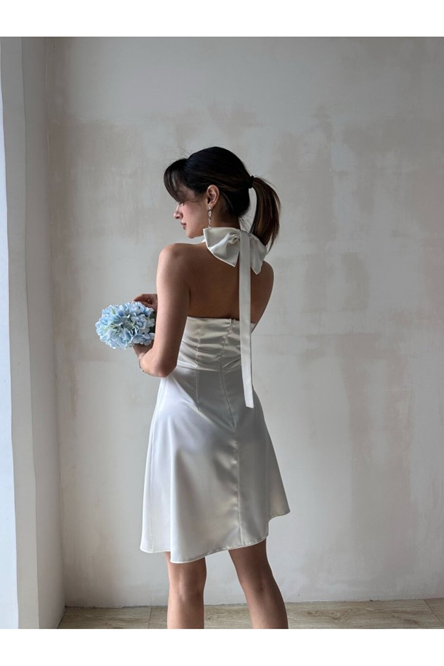 popibutik Kadın Boyundan Bağlamalı Kurdela Detaylı Mini Saten Elbise