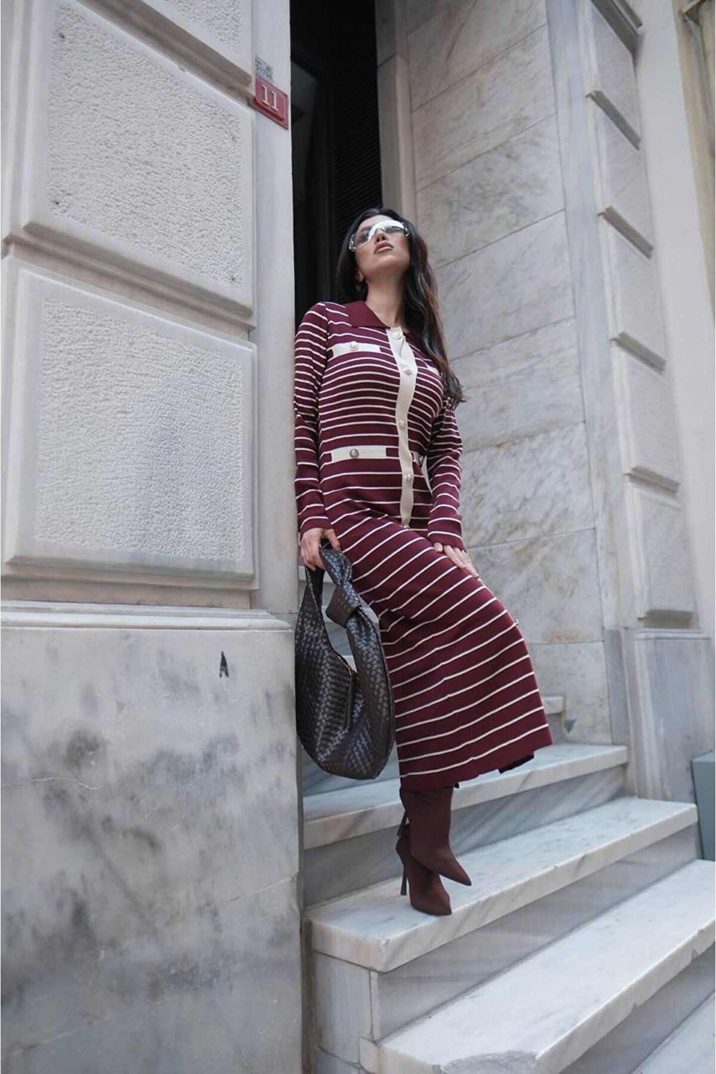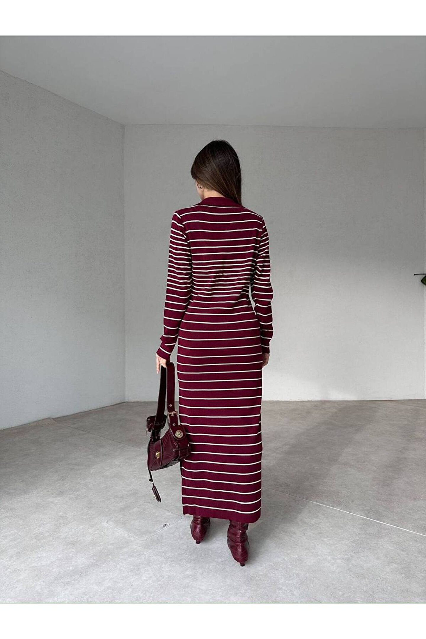 popibutik Kadın Çizgi Desen Maxi Triko Elbise