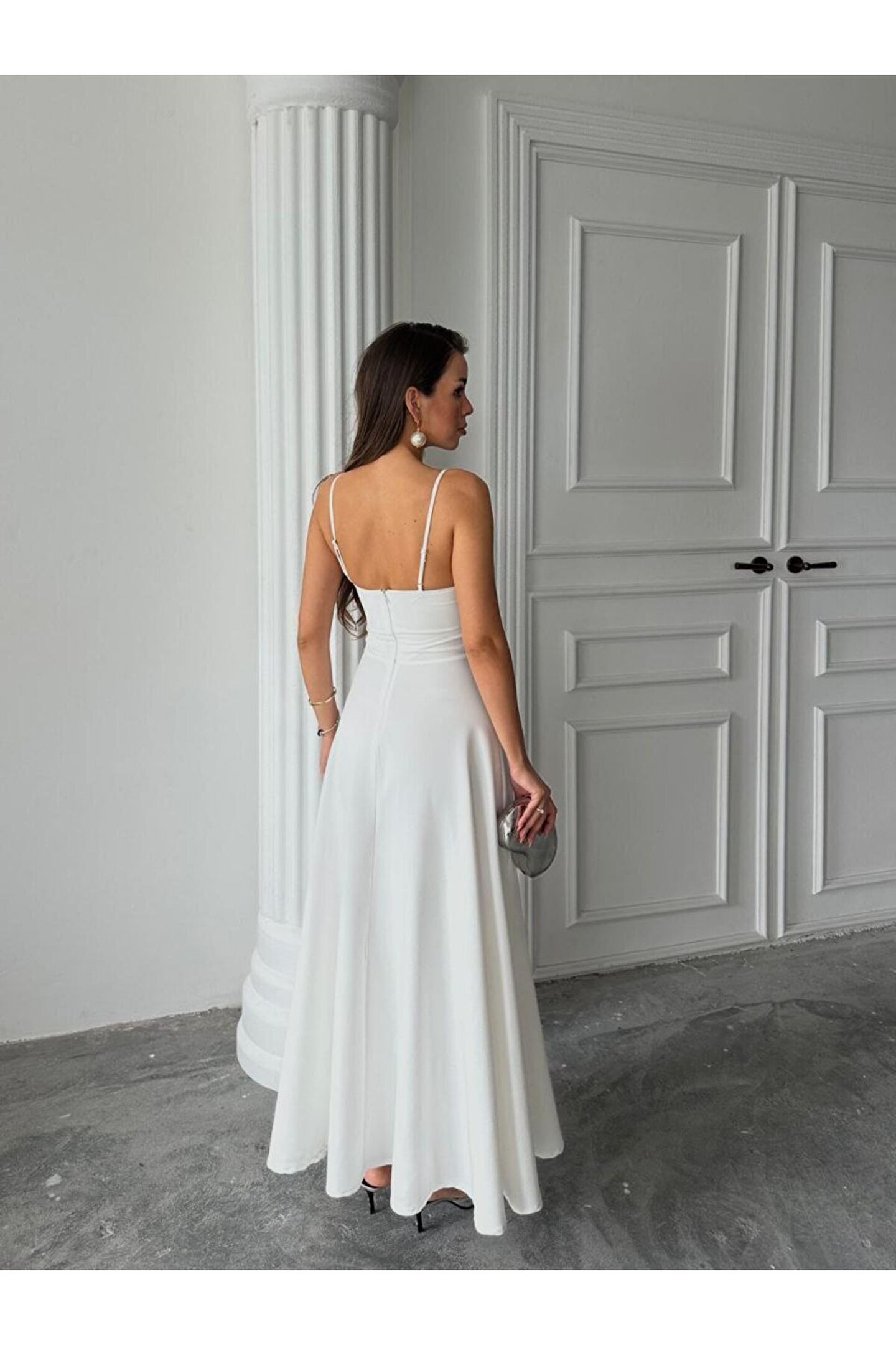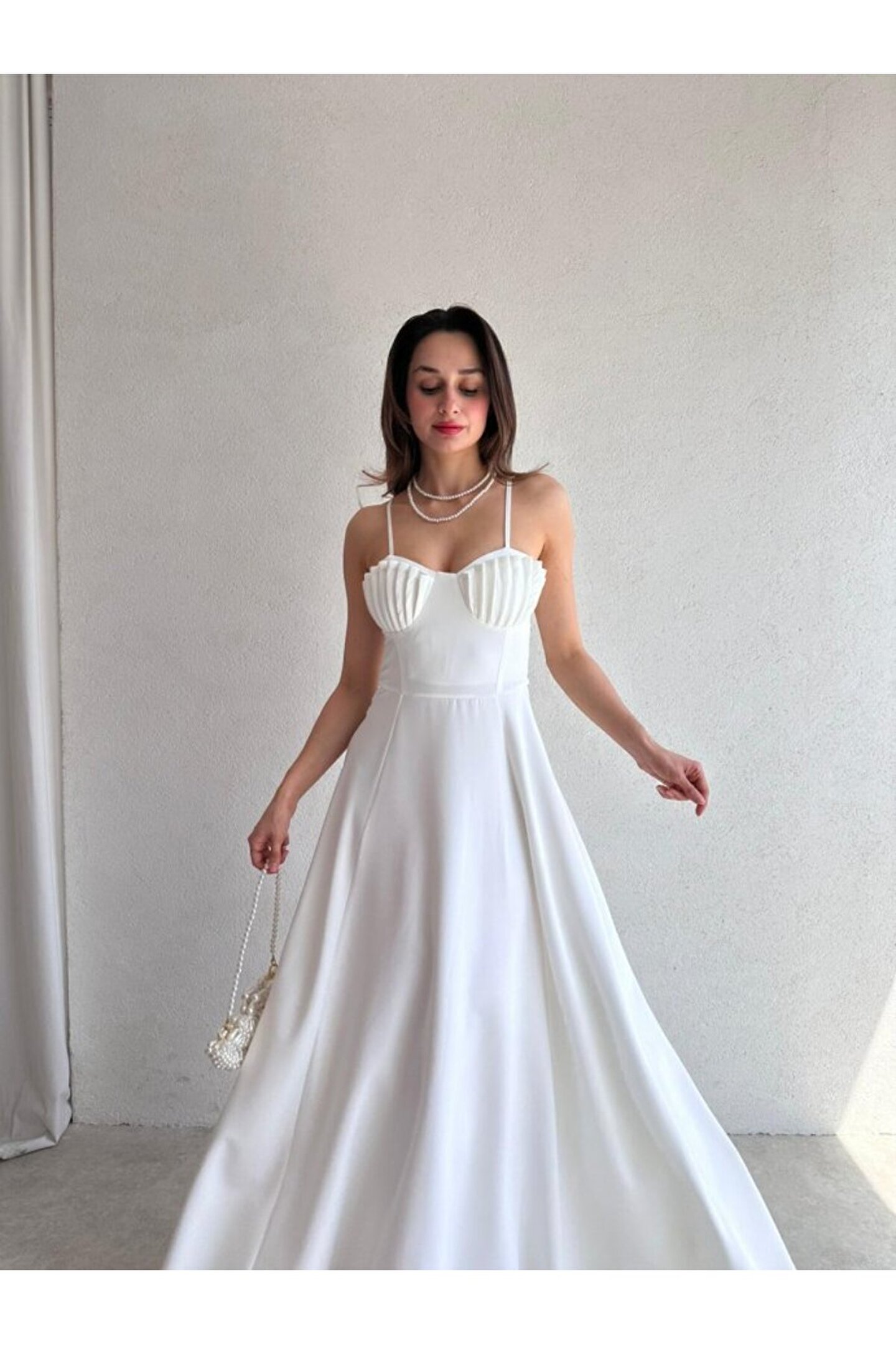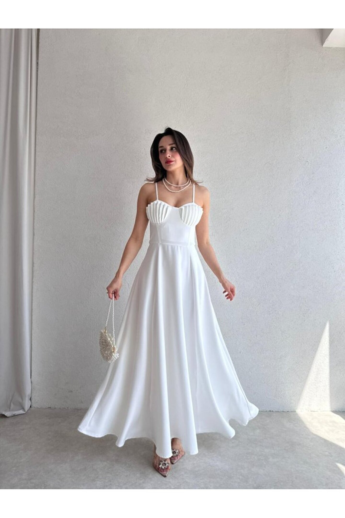 popibutik Kadın İnce askılı Göğüs Deniz Kabuğu Detaylı Kalp Yaka Uzun Elbise