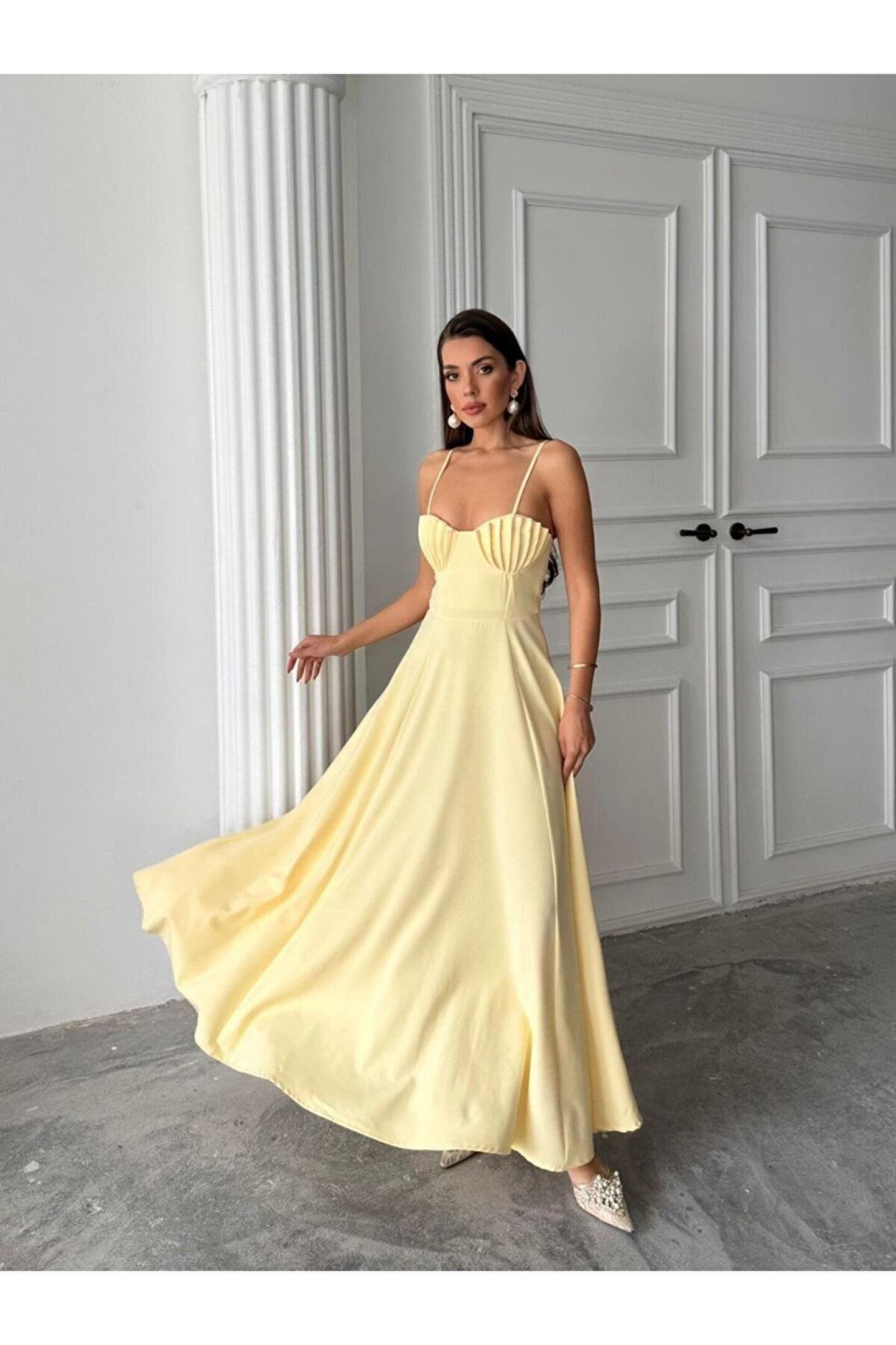 popibutik Kadın İnce askılı Göğüs Deniz Kabuğu Detaylı Kalp Yaka Uzun Elbise