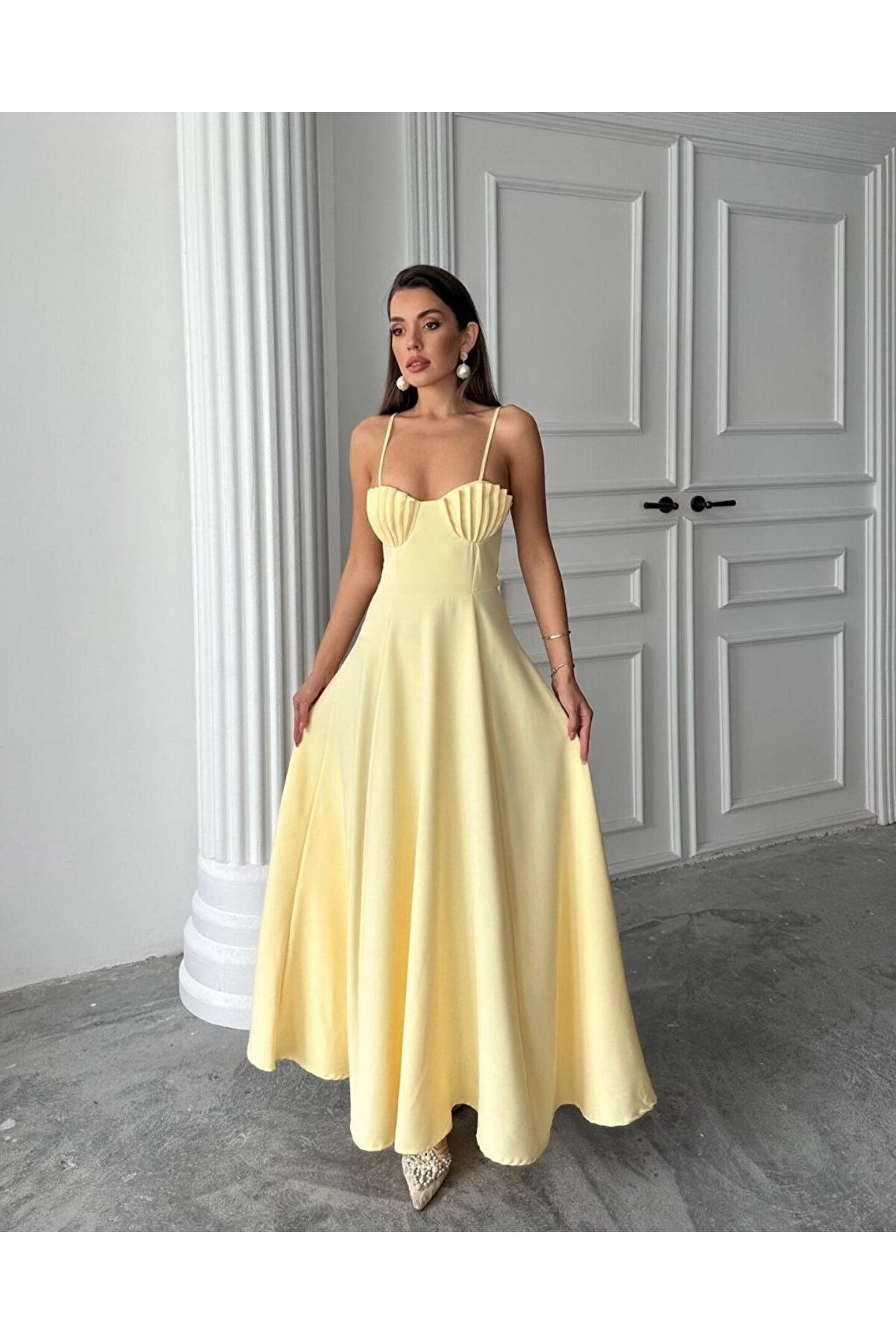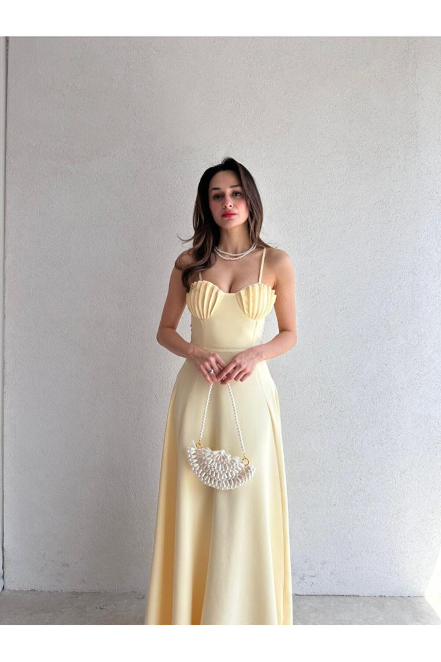 popibutik Kadın İnce askılı Göğüs Deniz Kabuğu Detaylı Kalp Yaka Uzun Elbise