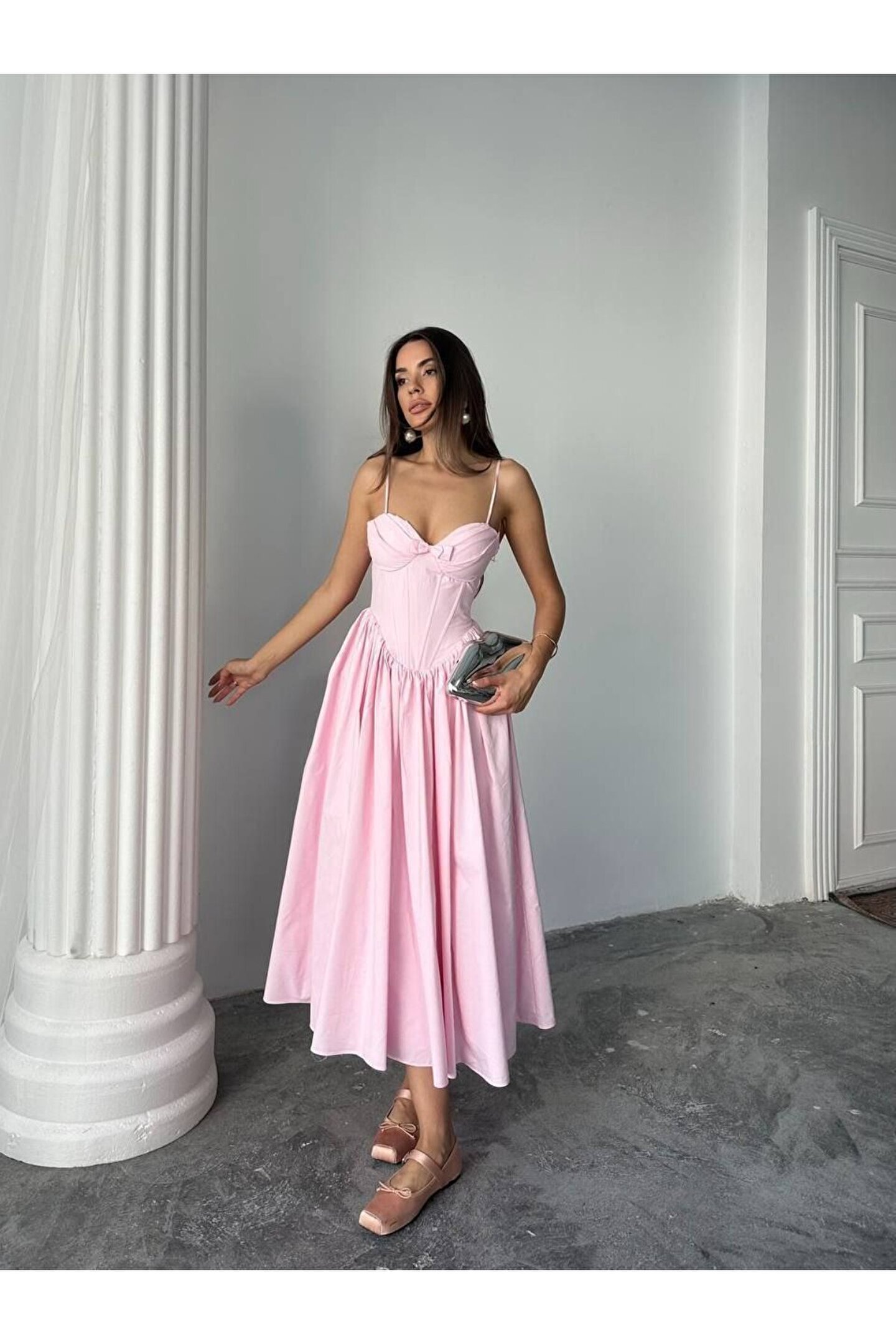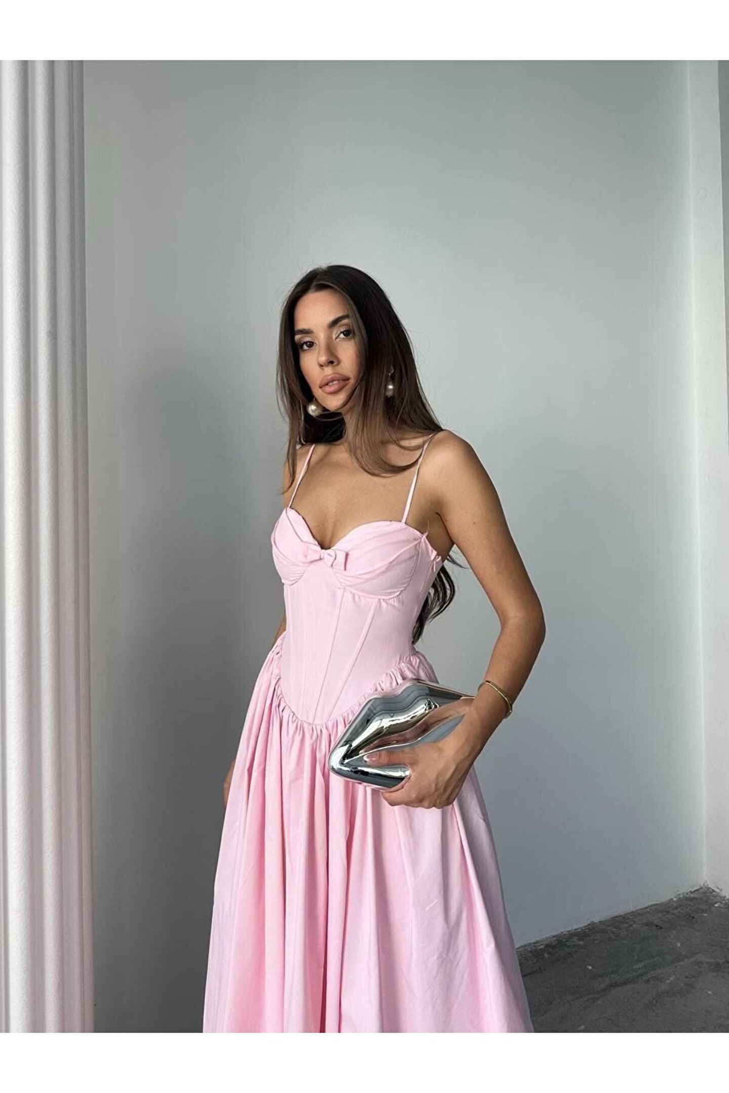 popibutik Kadın Kalp Yaka İnce Askılı Fiyonk Detaylı Korse Formlu Uzun Elbise