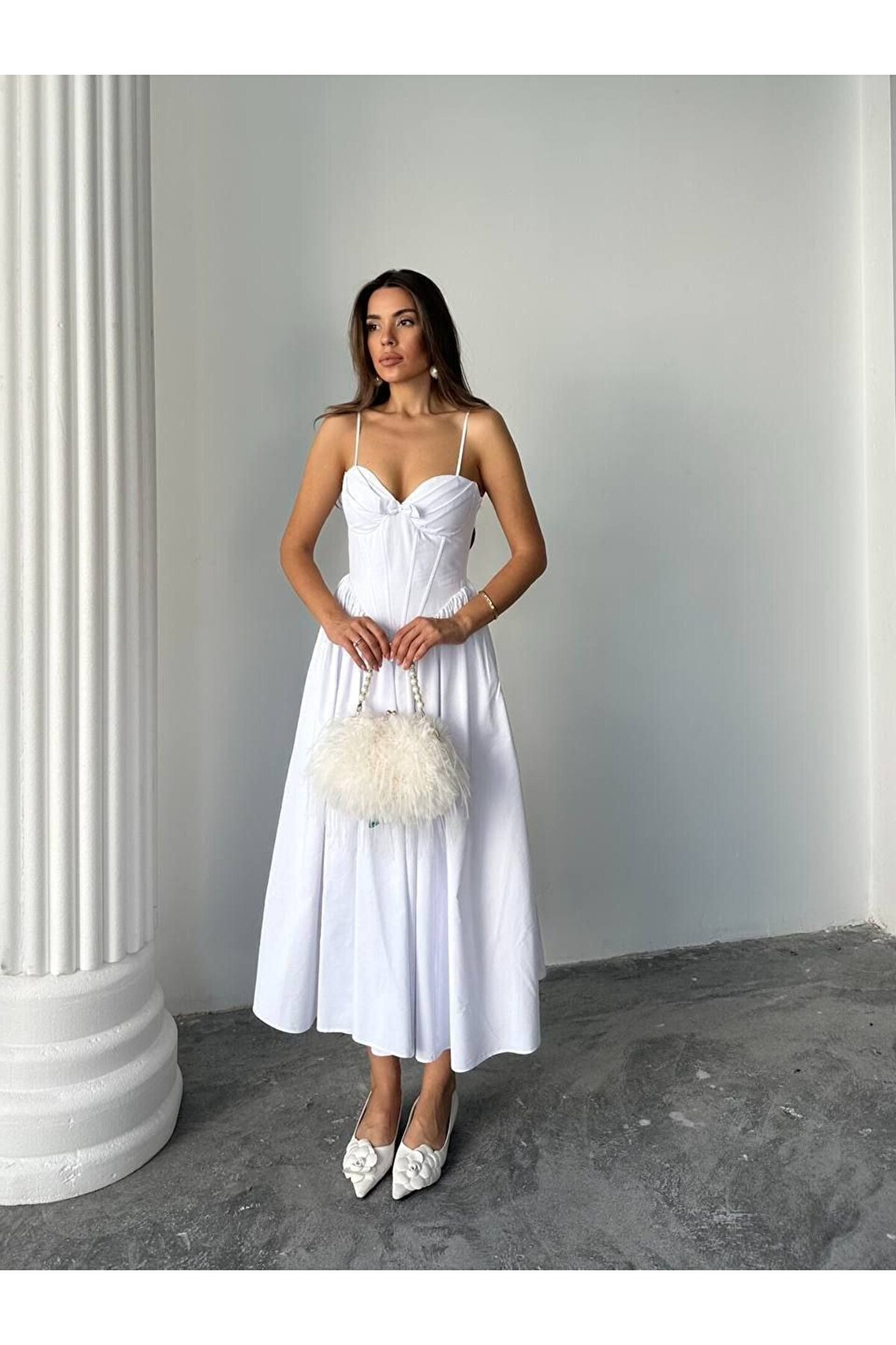 popibutik Kadın Kalp Yaka İnce Askılı Fiyonk Detaylı Korse Formlu Uzun Elbise
