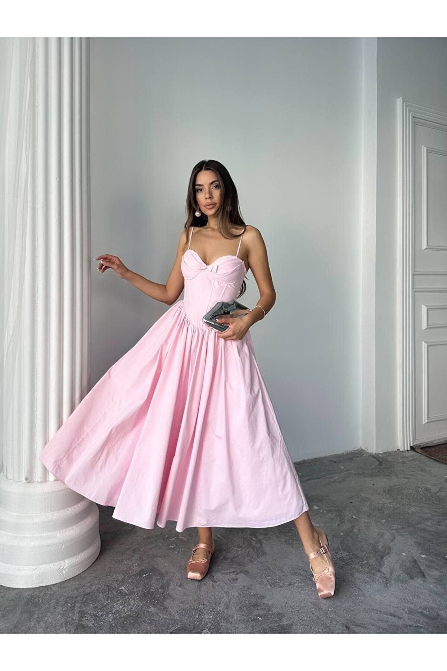 popibutik Kadın Kalp Yaka İnce Askılı Fiyonk Detaylı Korse Formlu Uzun Elbise