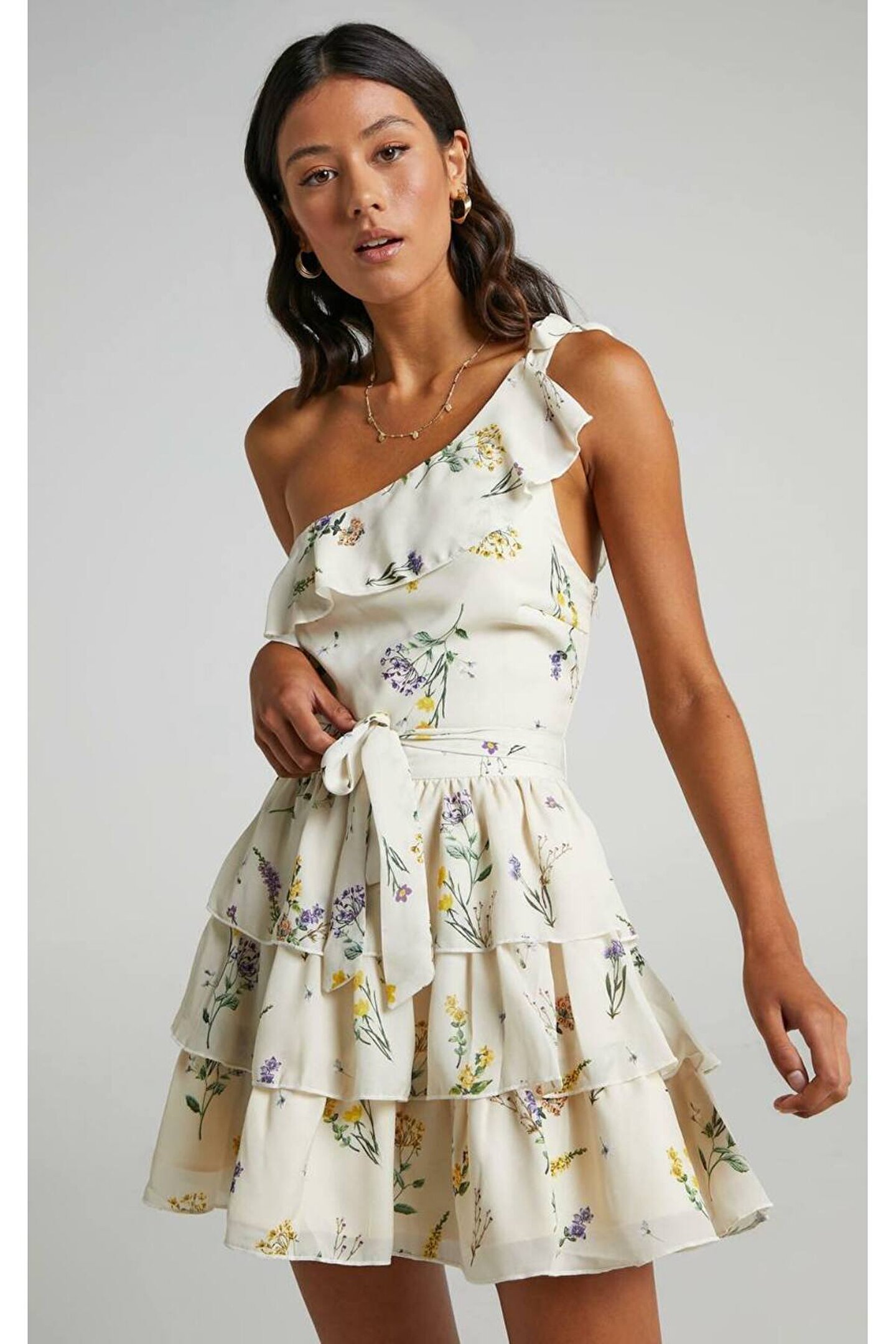popibutik Kadın Kat Etek Tek Omuz Bağlamalı Krep Kumaş Beyaz Mini Elbise
