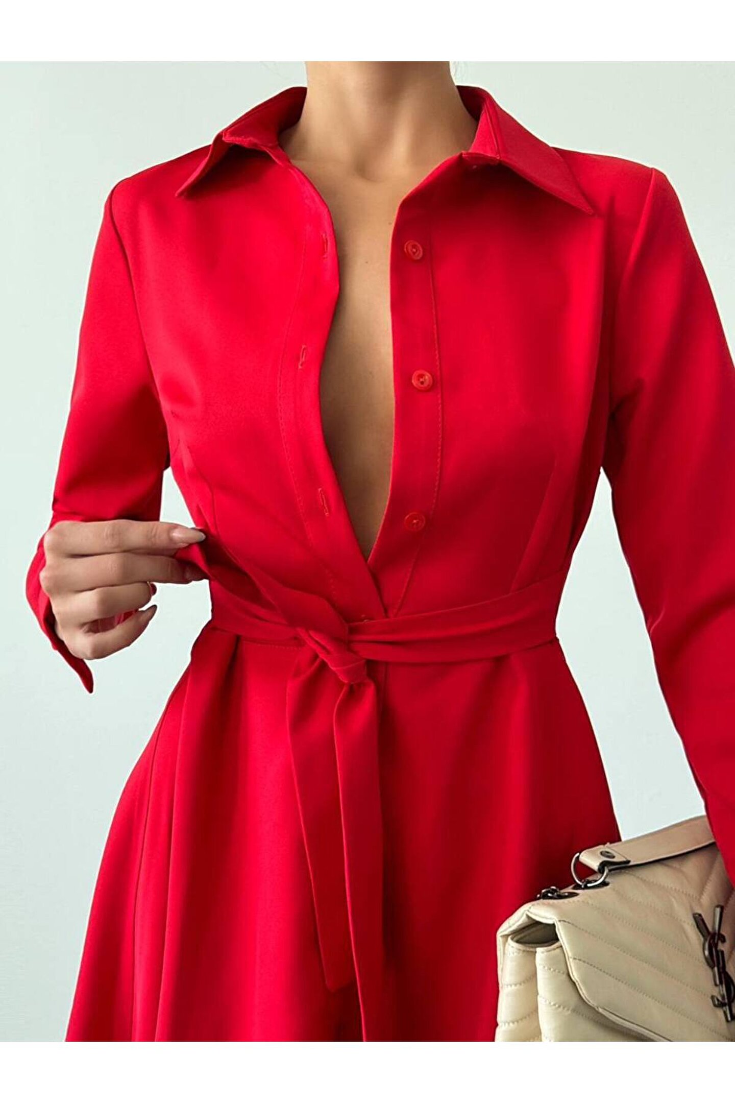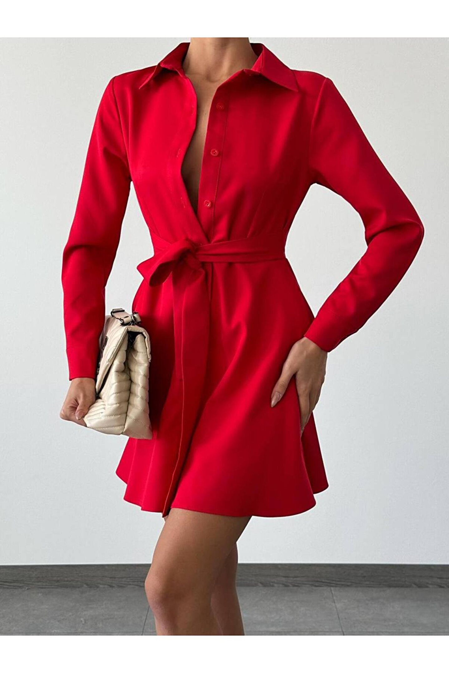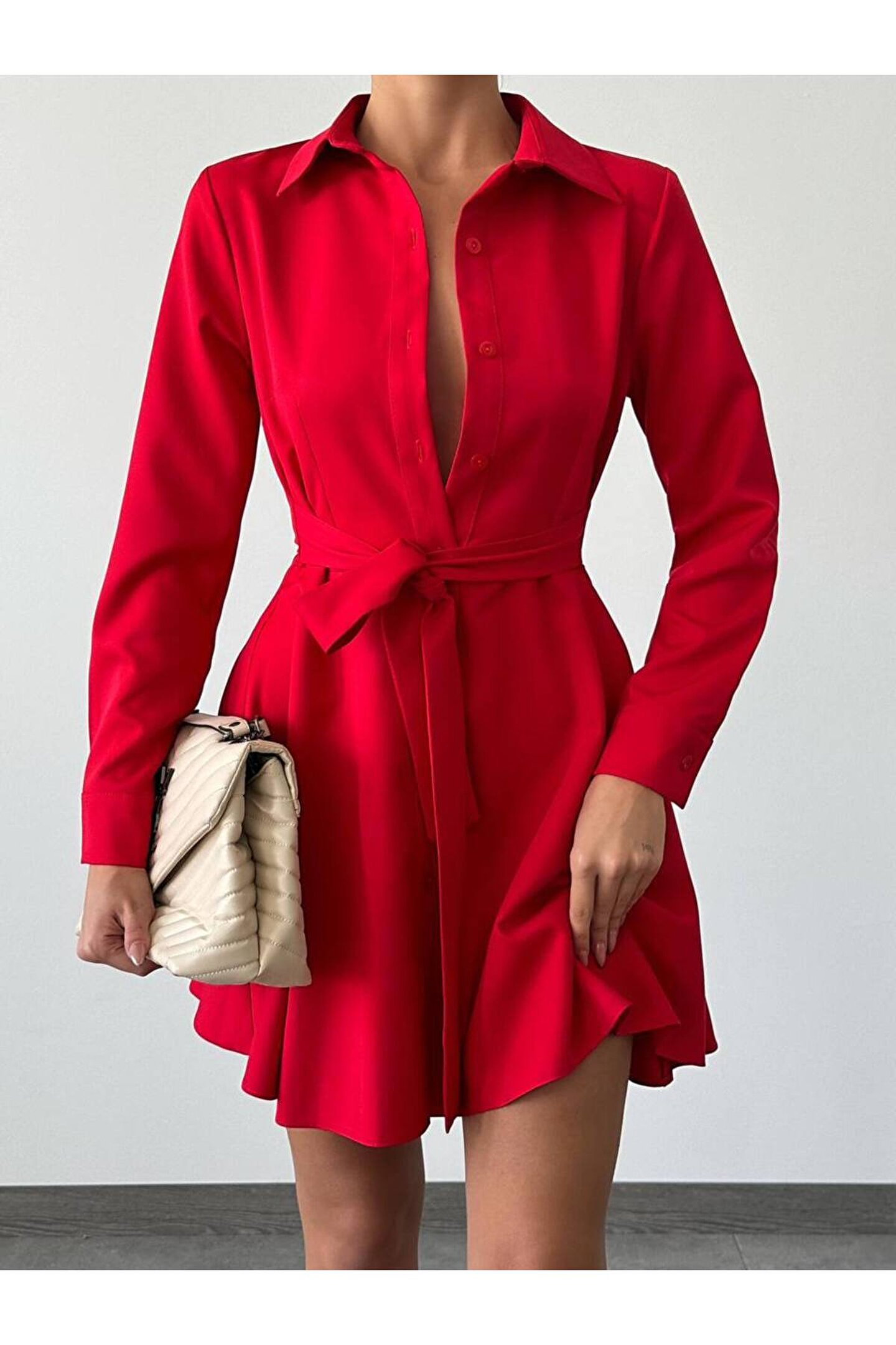 popibutik Kadın Kuşaklı Atlas Kumaş Mini Gömlek Elbise