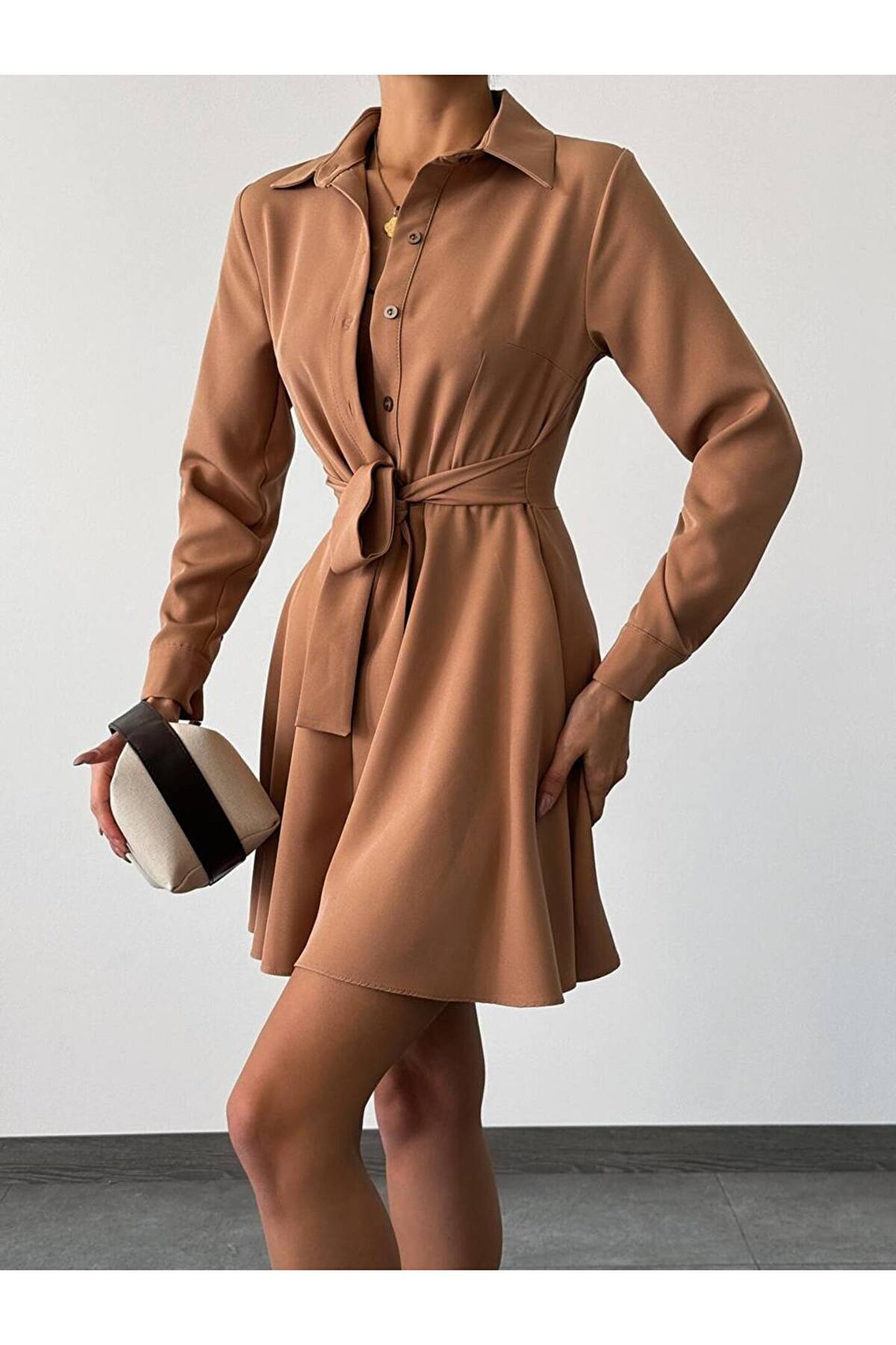 popibutik Kadın Kuşaklı Atlas Kumaş Mini Gömlek Elbise