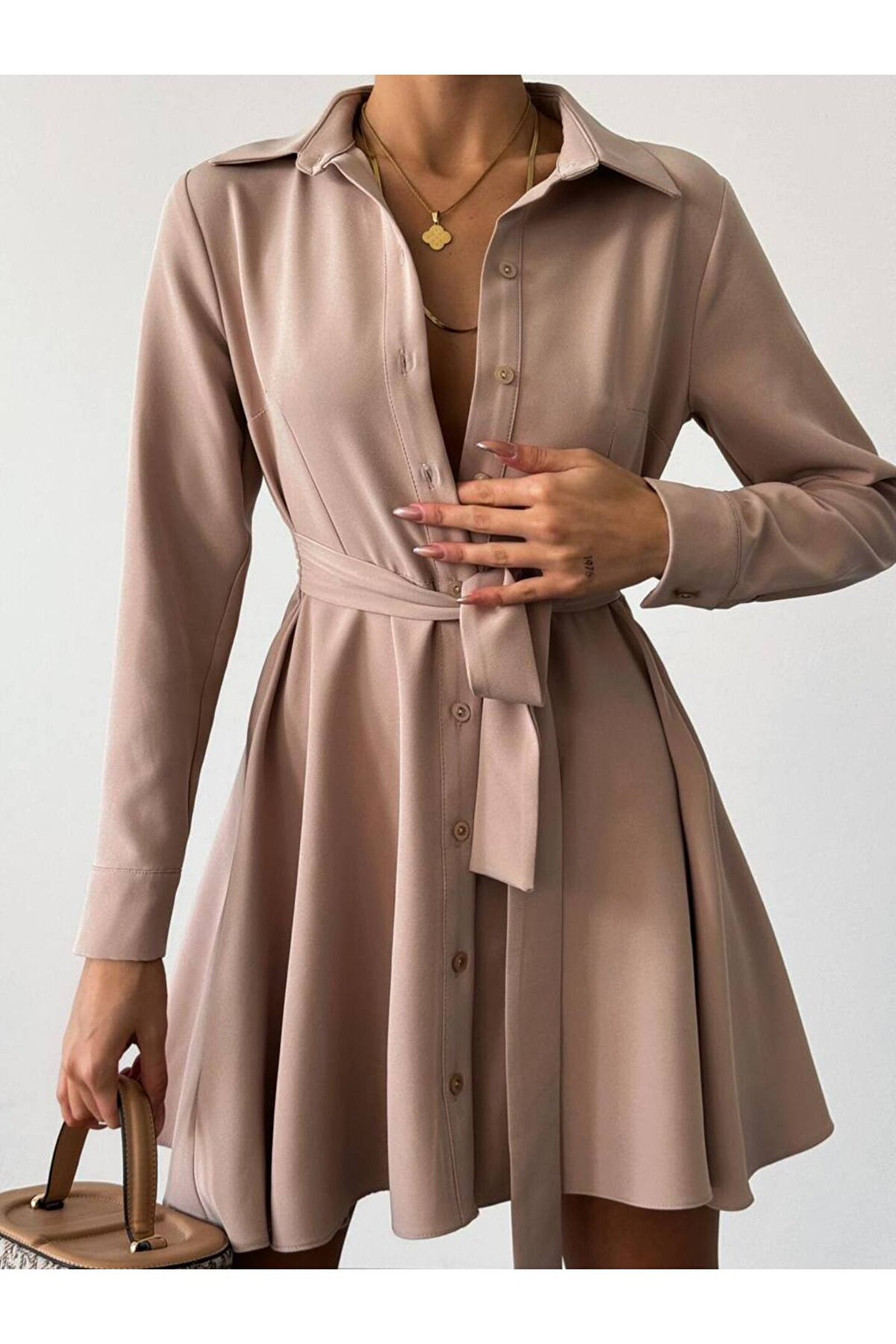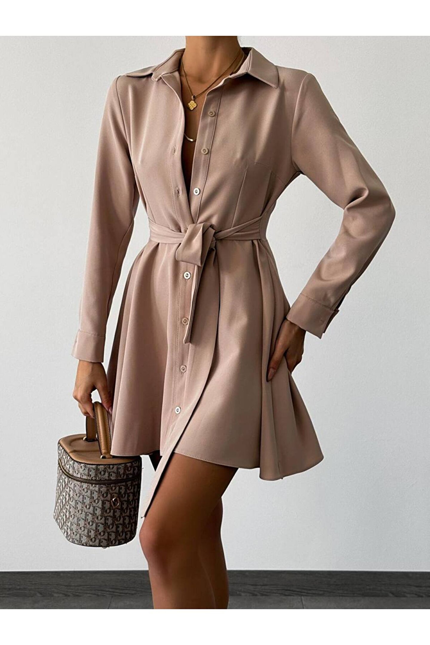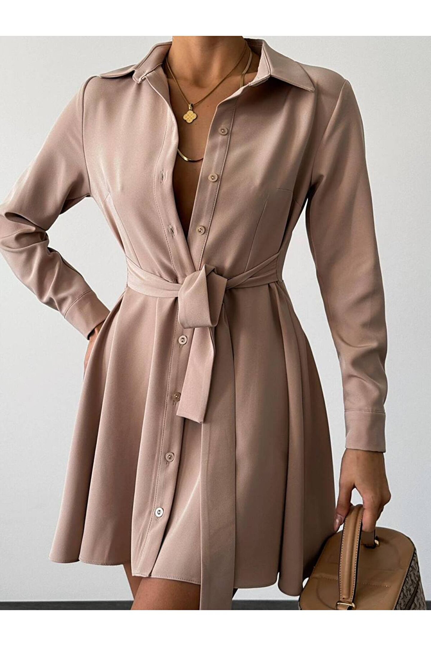 popibutik Kadın Kuşaklı Atlas Kumaş Mini Gömlek Elbise