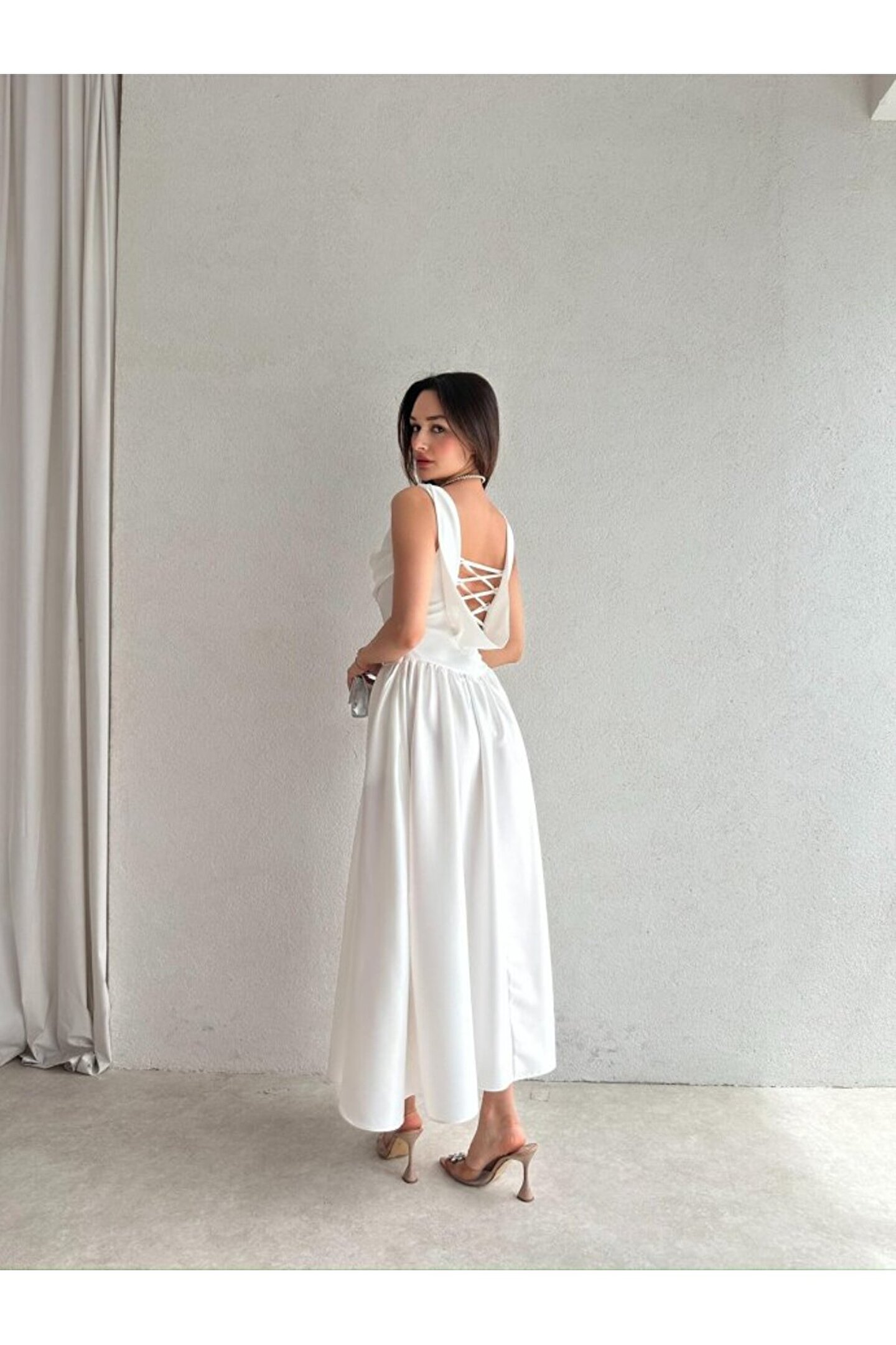 popibutik Kadın Sırt Detaylı Korse Formlu Pileli Uzun Saten Elbise