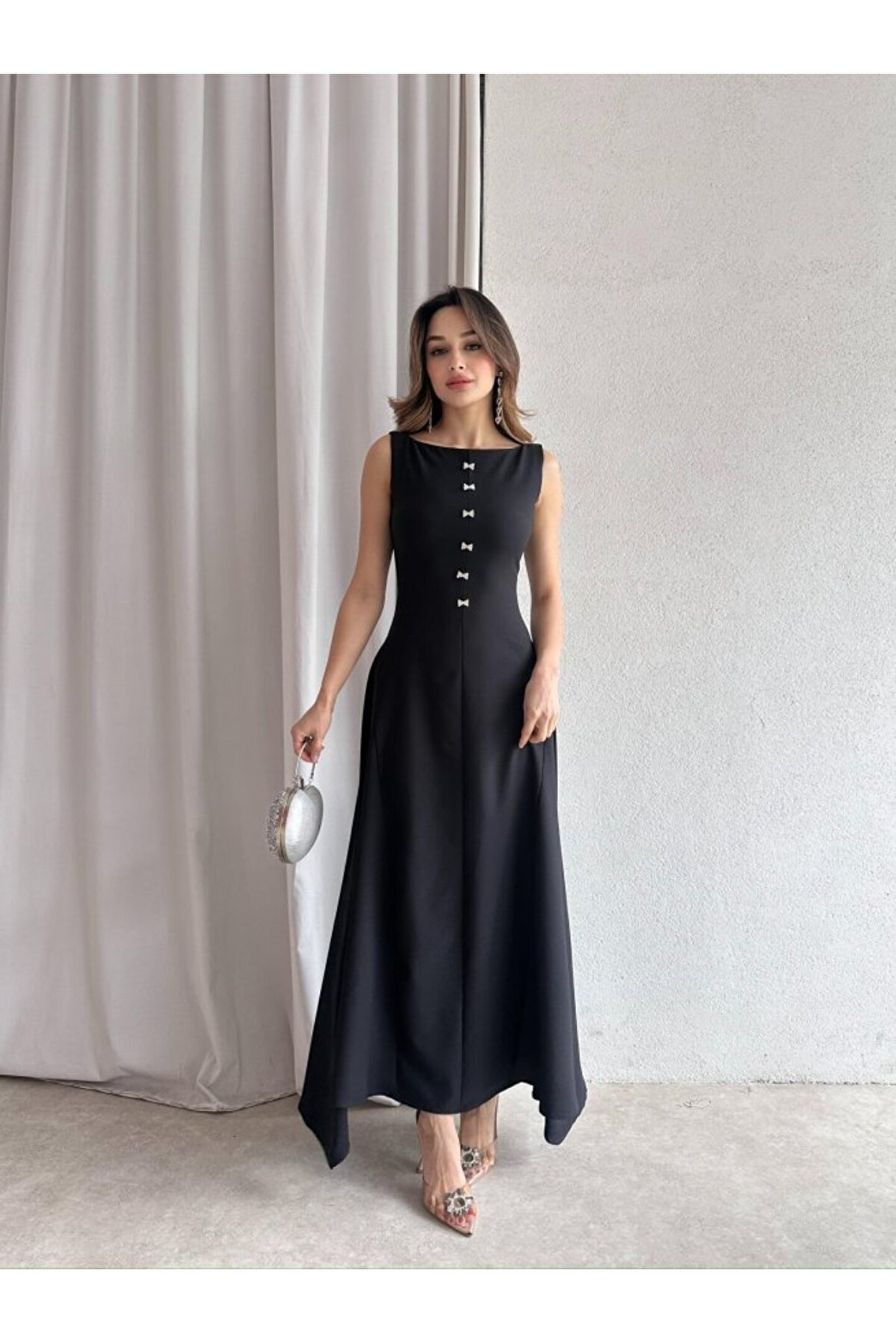 popibutik Kadın Taş Fiyonk Detaylı Uzun Elbise