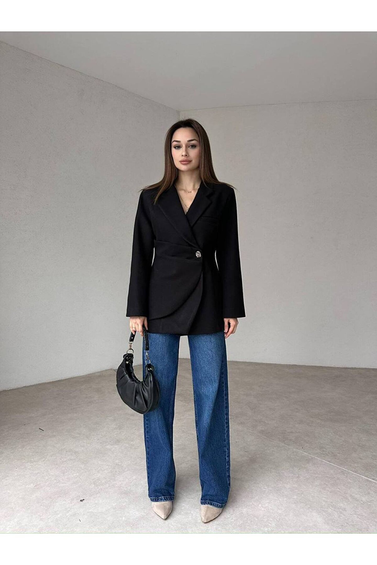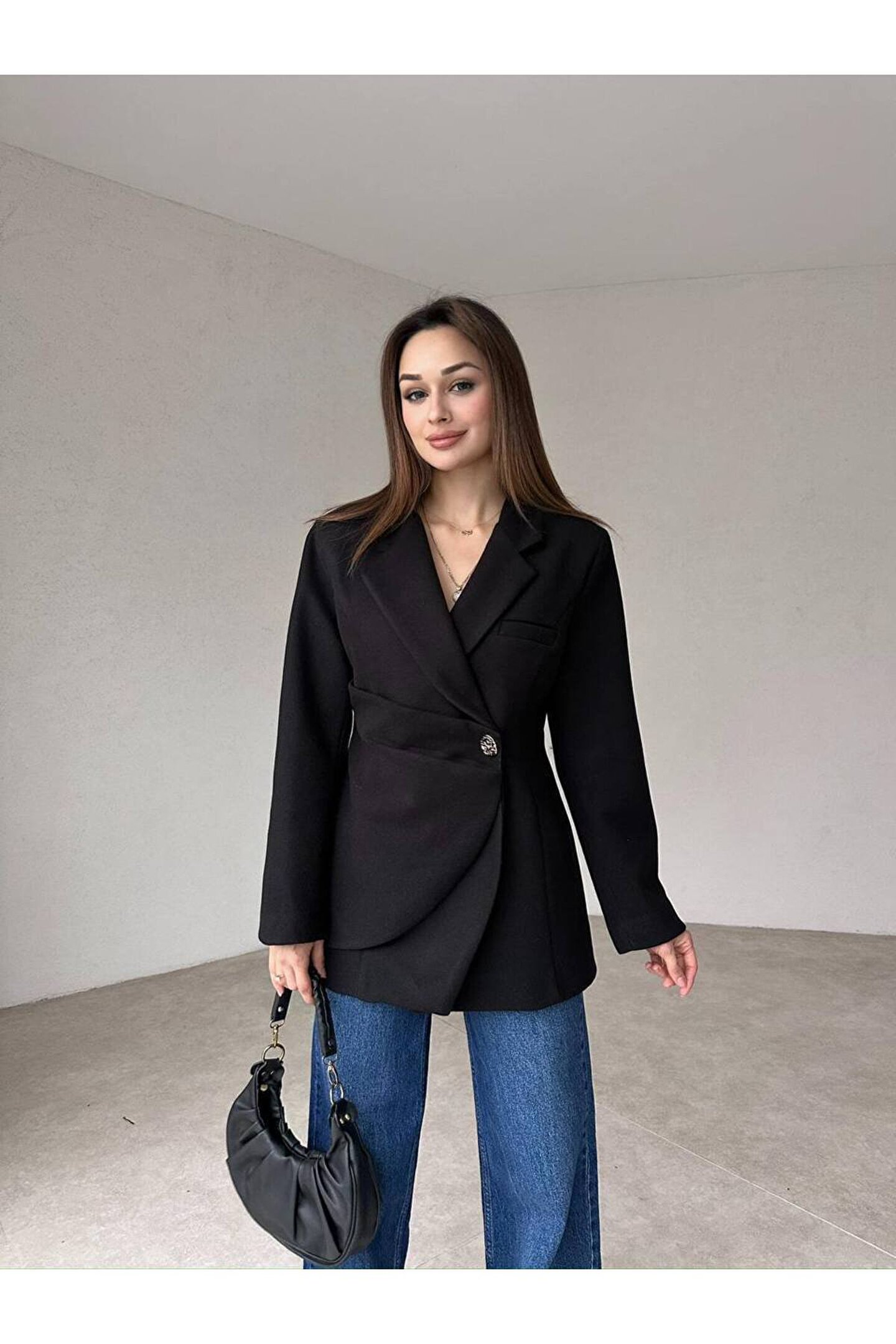 popibutik Kadın Yan Düğme Kaşe Kumaş Siyah Ceket Kaban