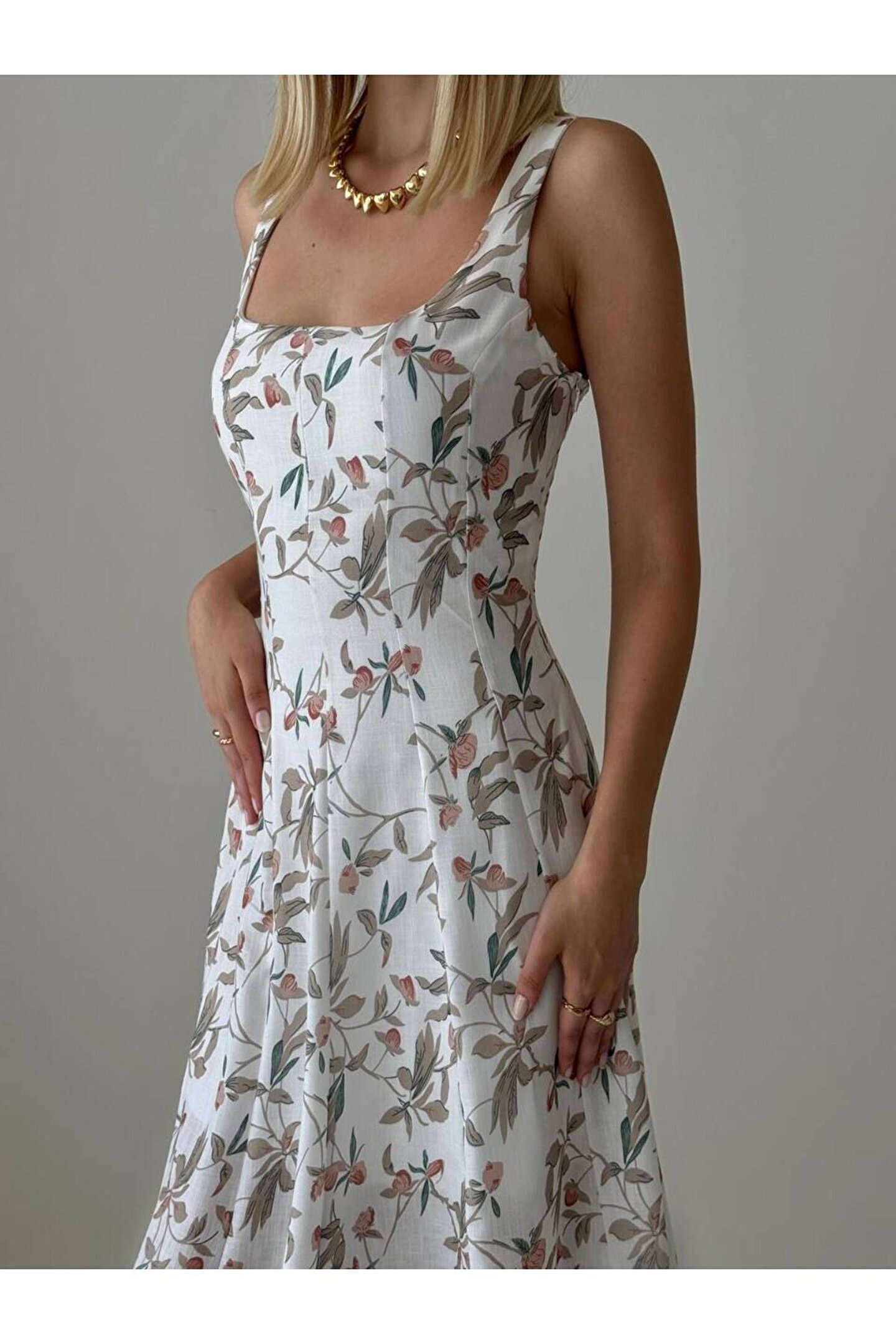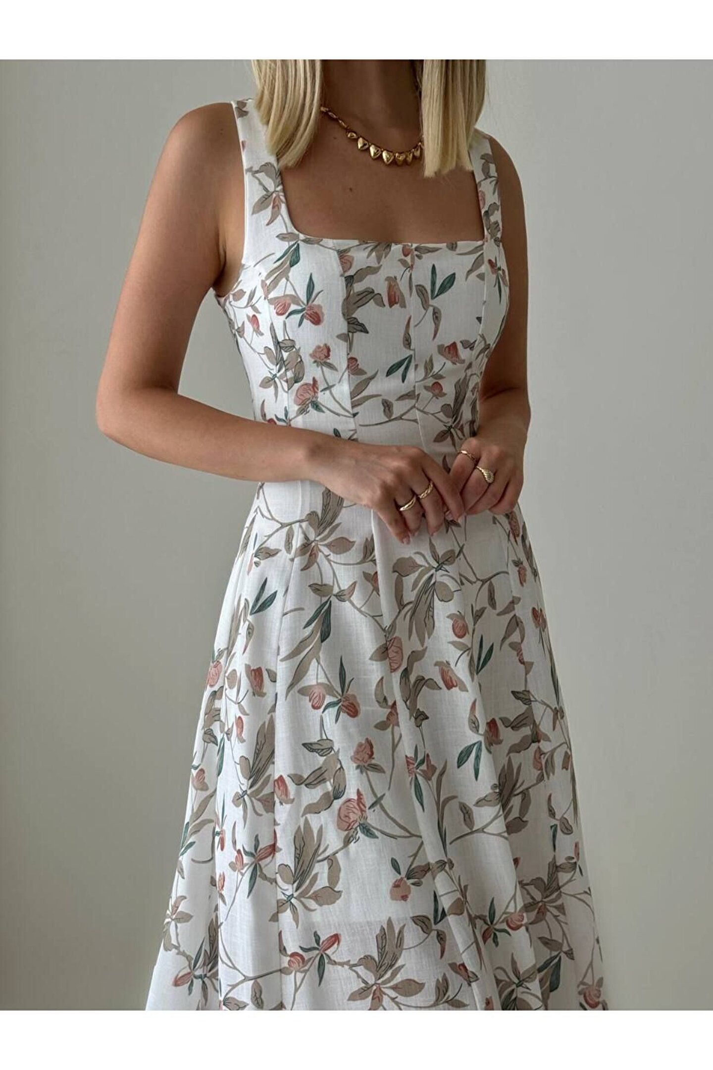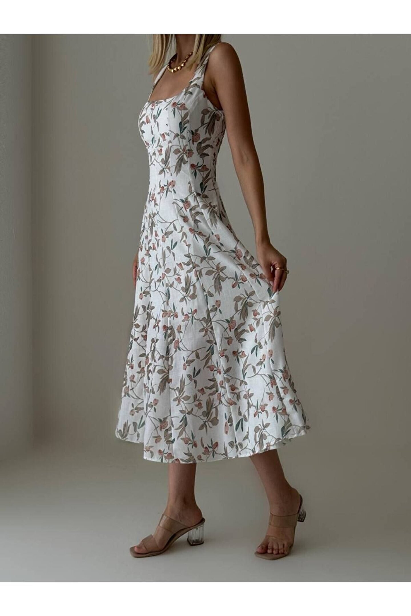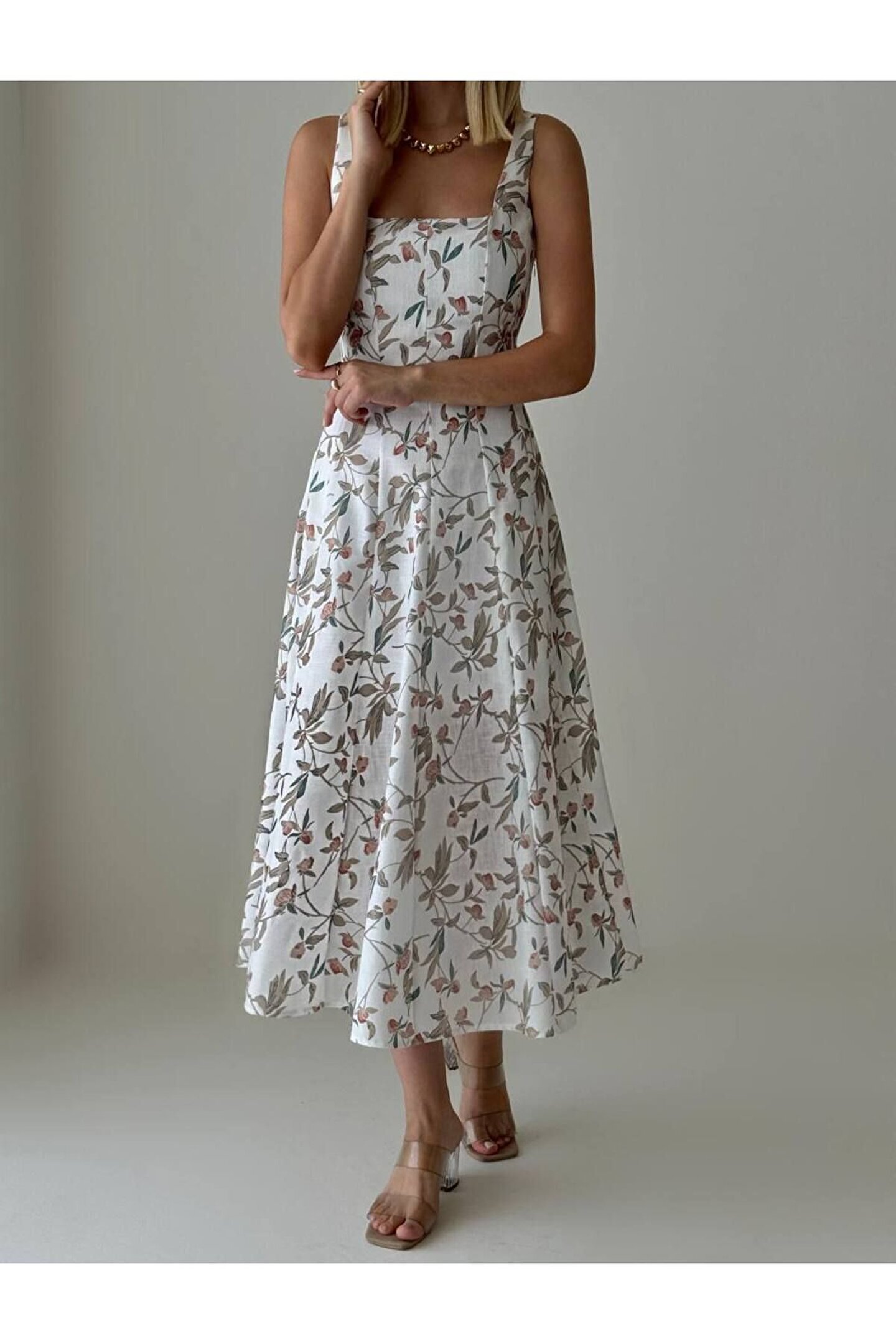 Keten kumaşın hafif ve nefes alabilen yapısı, sıcak yaz günlerinde serinlik sağlar; Bel oturan kalıbı ile vücut hatlarını zarifçe sararak feminen bir siluet oluşturur; Kare yaka tasarımı, modern ve şık bir görünüm sunarken, baskılı detaylarla dikkat çekici bir stil oluşturur; Askılı kol tipi sayesinde omuzları rahatça hareket ettirme özgürlüğü sağlar ve yaz aylarında ideal bir tercih olur; Midi boyu ile hem günlük kullanım hem de özel davetlerde rahatlıkla tercih edilebilir; genç ve tüm yaş gruplarına hitap eder;