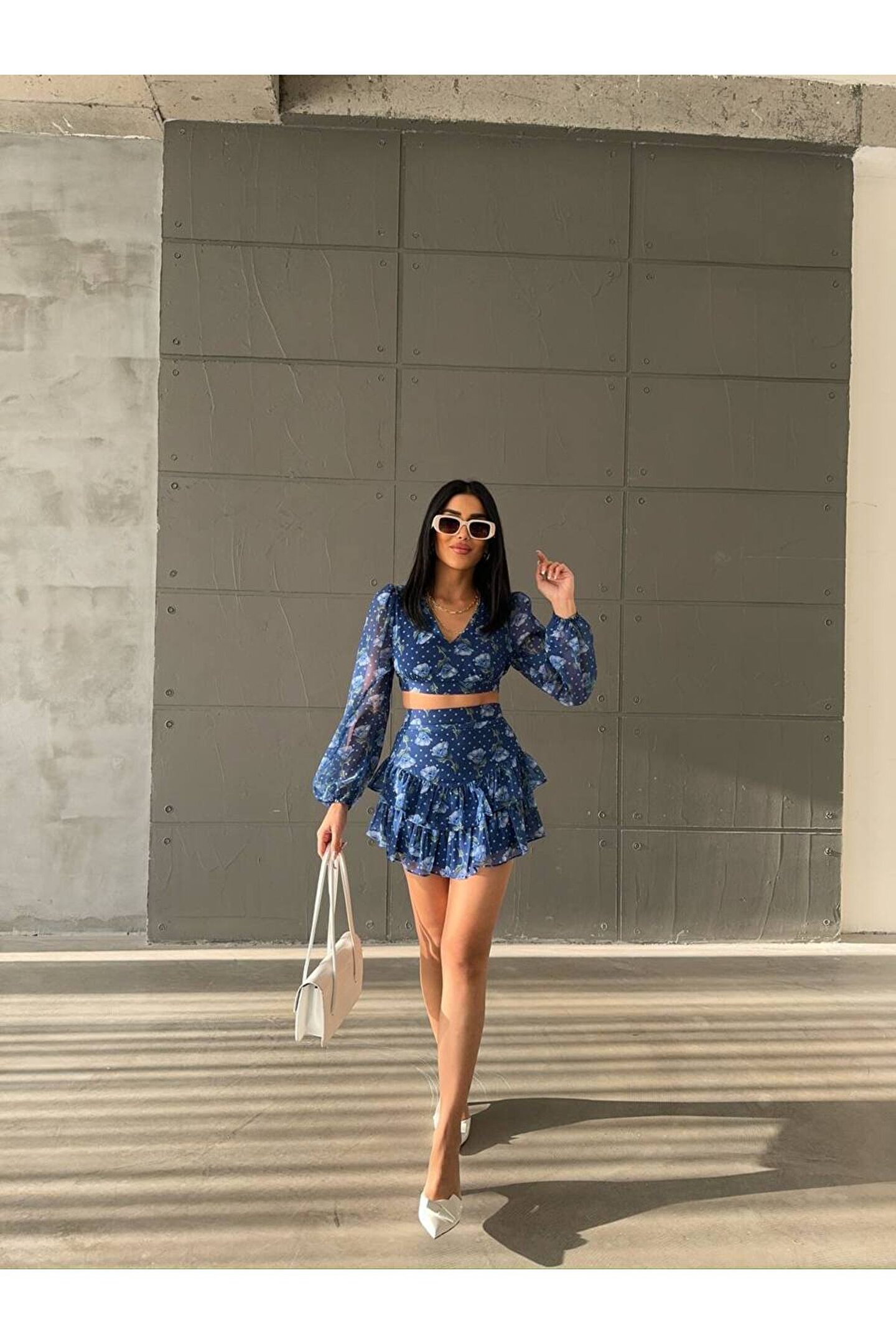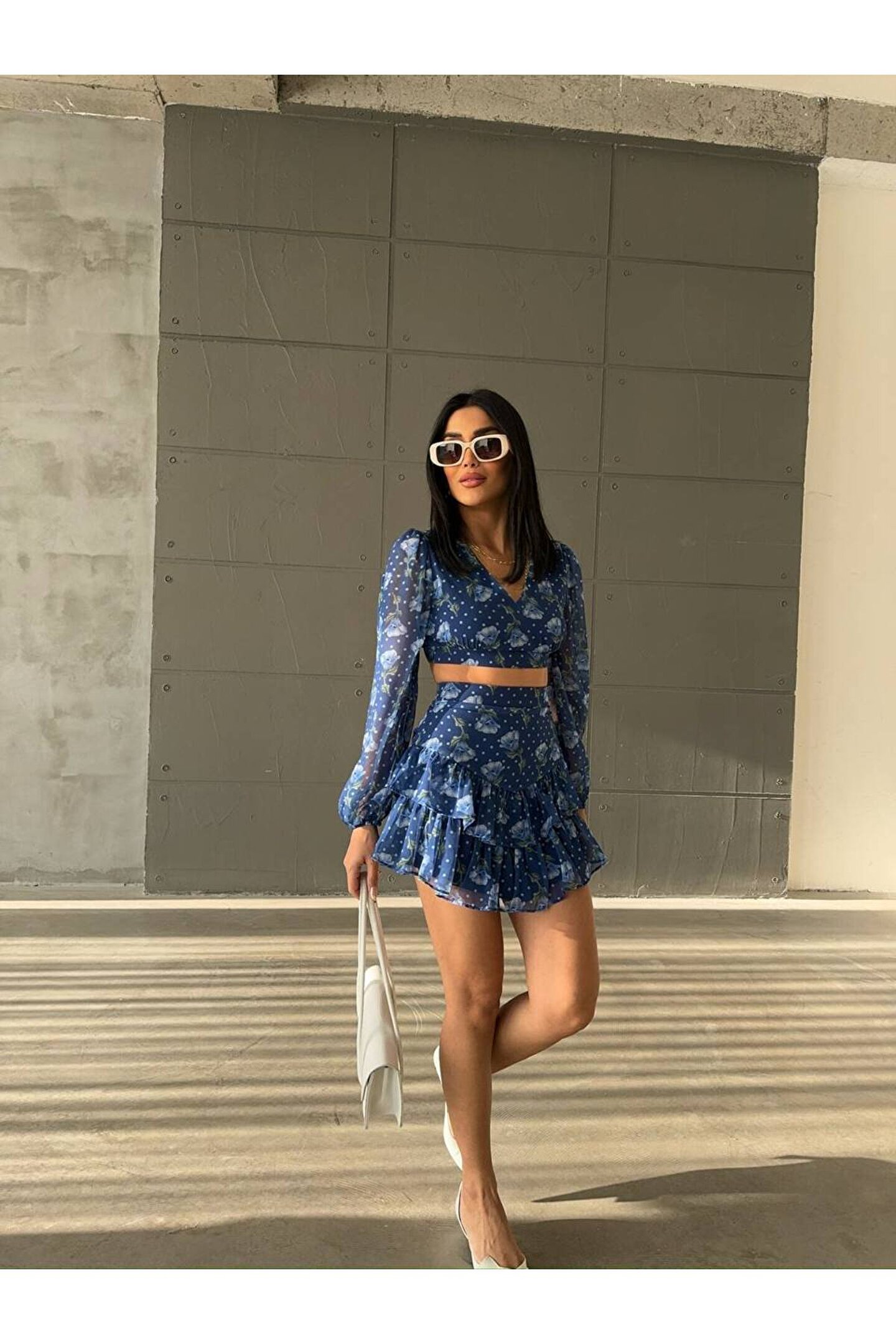 popibutik Kat Etek Gögüs Dekolteli Crop Şifon Kumaş Mavi Takım