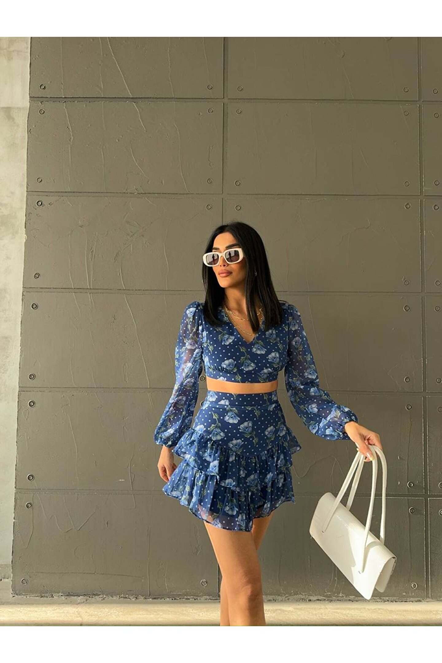 Gençlerin enerjisini yansıtan, slim kesim tasarımıyla modern ve şık bir görünüm sunar.; Çiçekli deseniyle feminen dokunuşları ön plana çıkaran bu takım, göz alıcı detaylarıyla dikkat çeker.; Örme şifon kumaşı sayesinde hafif ve nefes alabilen yapısıyla yaz ayları için idealdir.; Crop üstü ile trendleri takip eden gençler için mükemmel bir seçimdir; hem rahat hem de stil sahibi olmanızı sağlar.; Tüm yaş gruplarına hitap eden geniş beden skalasıyla herkes için uygunluk sunar.; Mavi rengiyle kolayca kombinlenebilir ve farklı aksesuarlarla zenginleştirilebilir.;