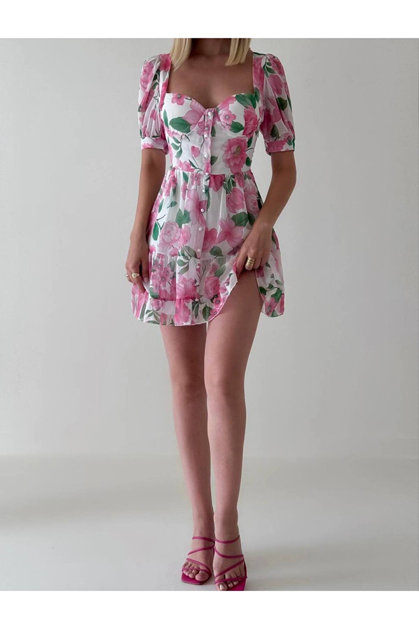 popibutik Kısa Kol Gloplu Düğme Detaylı Şifon Kumaş Mini Pembe Elbise