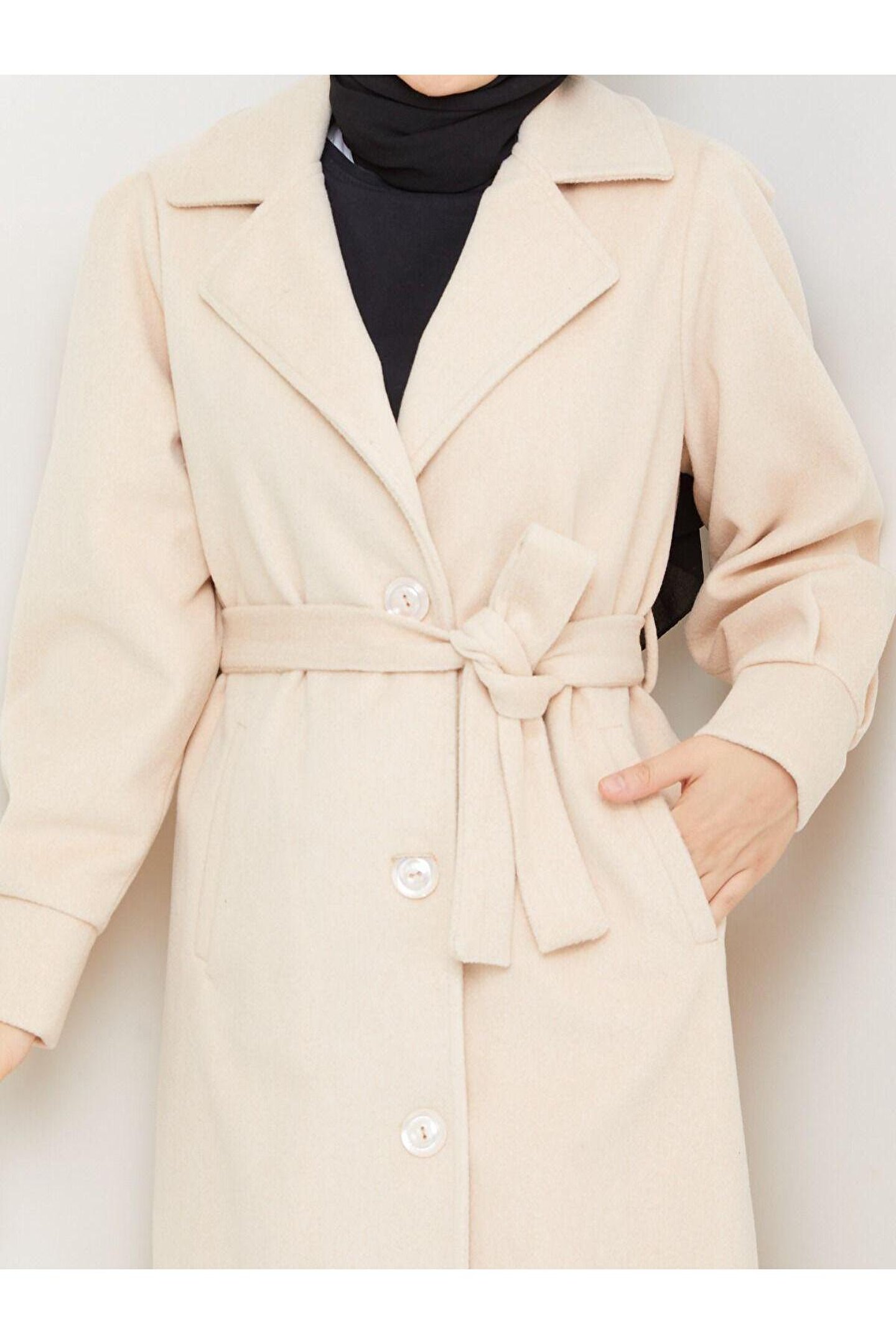 popibutik Kol Detaylı Kaşe Kumaş Kuşaklı Düğmeli Krem Midi Boy Kaban