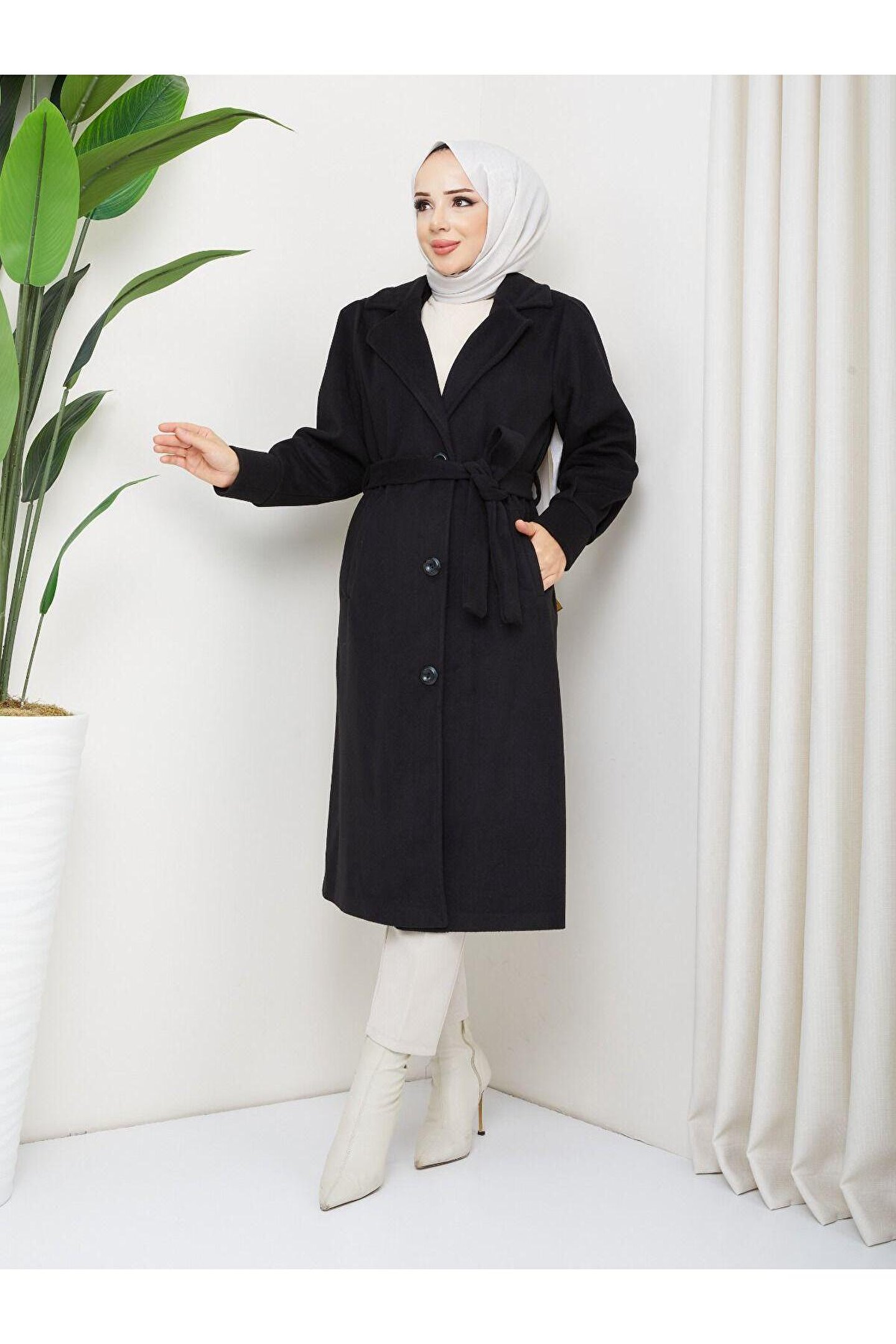 • Kol Detaylı Kaşe Kumaş Kuşaklı Düğmeli Midi Boy Kaban