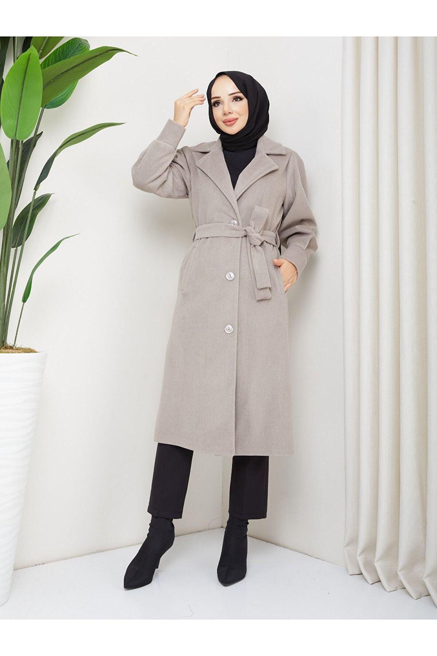 • Kol Detaylı Kaşe Kumaş Kuşaklı Düğmeli Midi Boy Kaban